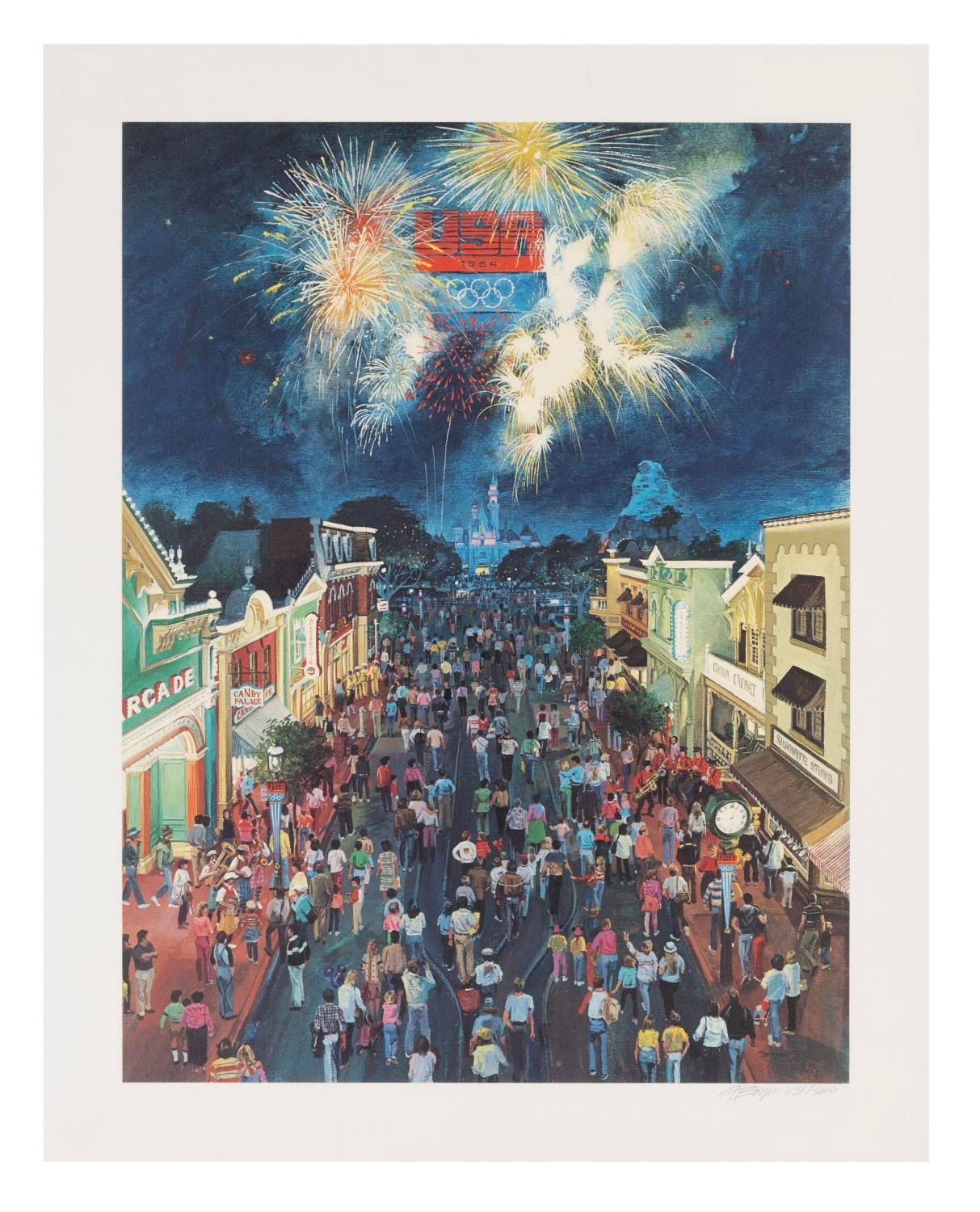 (Disneyland, 1984) A Disneyland lithograph titled “Olympic Nights,” designed and signed by Disney artist Charles Boyer, specifically for the Olympic Night at Disneyland event on March 24, 1984, held as a tribute to the dedication and accomplishments of the United States Olympic team. Measuring 22" x 28", the limited edition lithograph numbered 1131/5000, is in good condition with a small smudge in the top left corner, light wear, and a 1.25" tear at the top.