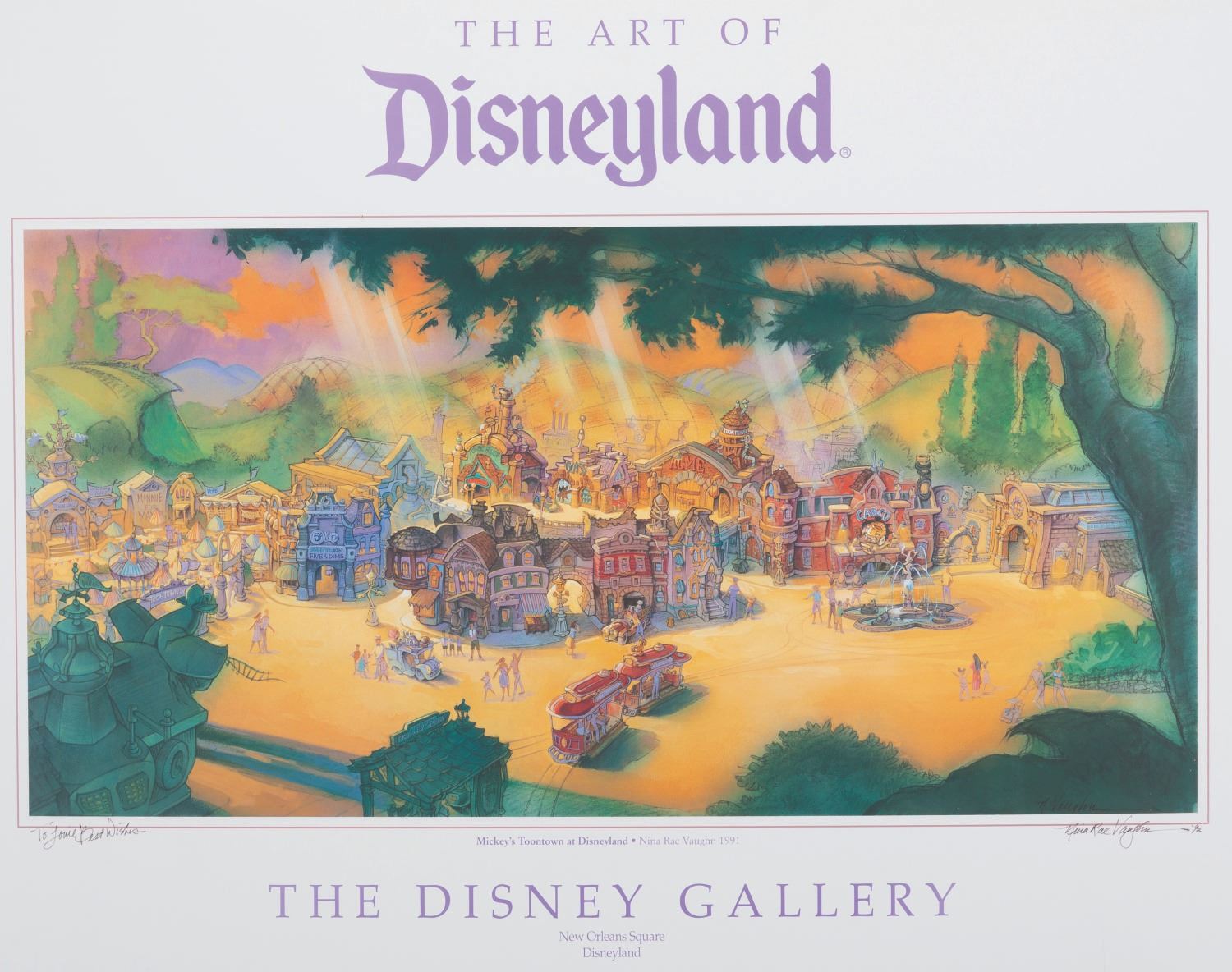 (Disneyland, 1993) A poster originally sold at The Disney Gallery featuring Nina Rae Vaughn’s concept art for Mickey’s Toontown. Vaughn signed the poster with a personalized dedication in ink at a special event held at The Disney Gallery on April 24, 1993. Measuring 26” x 35.5” trimmed from its original full size of 26” x 39”, the poster is mounted to foamcore and in good condition with edge wear, dents, pinholes, and a stain and heavy crease at the bottom right.