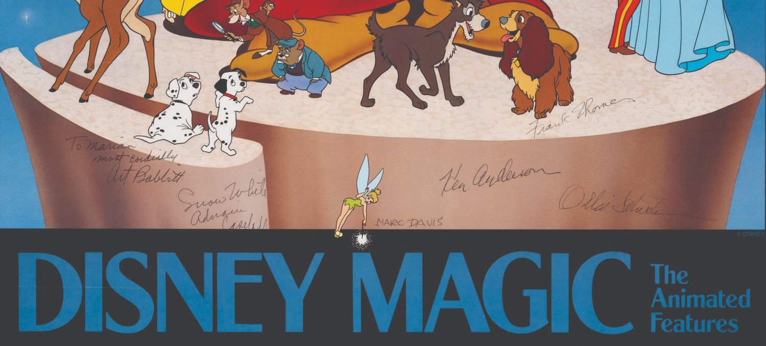 (LACMA, 1986) A souvenir poster from the Los Angeles County Museum exhibit "Disney Magic The Animated Series" open from July through September of 1986. The poster is signed by six Disney Legends: animators Frank Thomas, Ollie Johnston, Marc Davis, Ken Anderson, and Art Babbitt; and Adriana Caselotti, the voice of Snow White. Measuring 23.5" x 32", the poster displays in good condition, with light wear, and five horizontal creases throughout the left side.