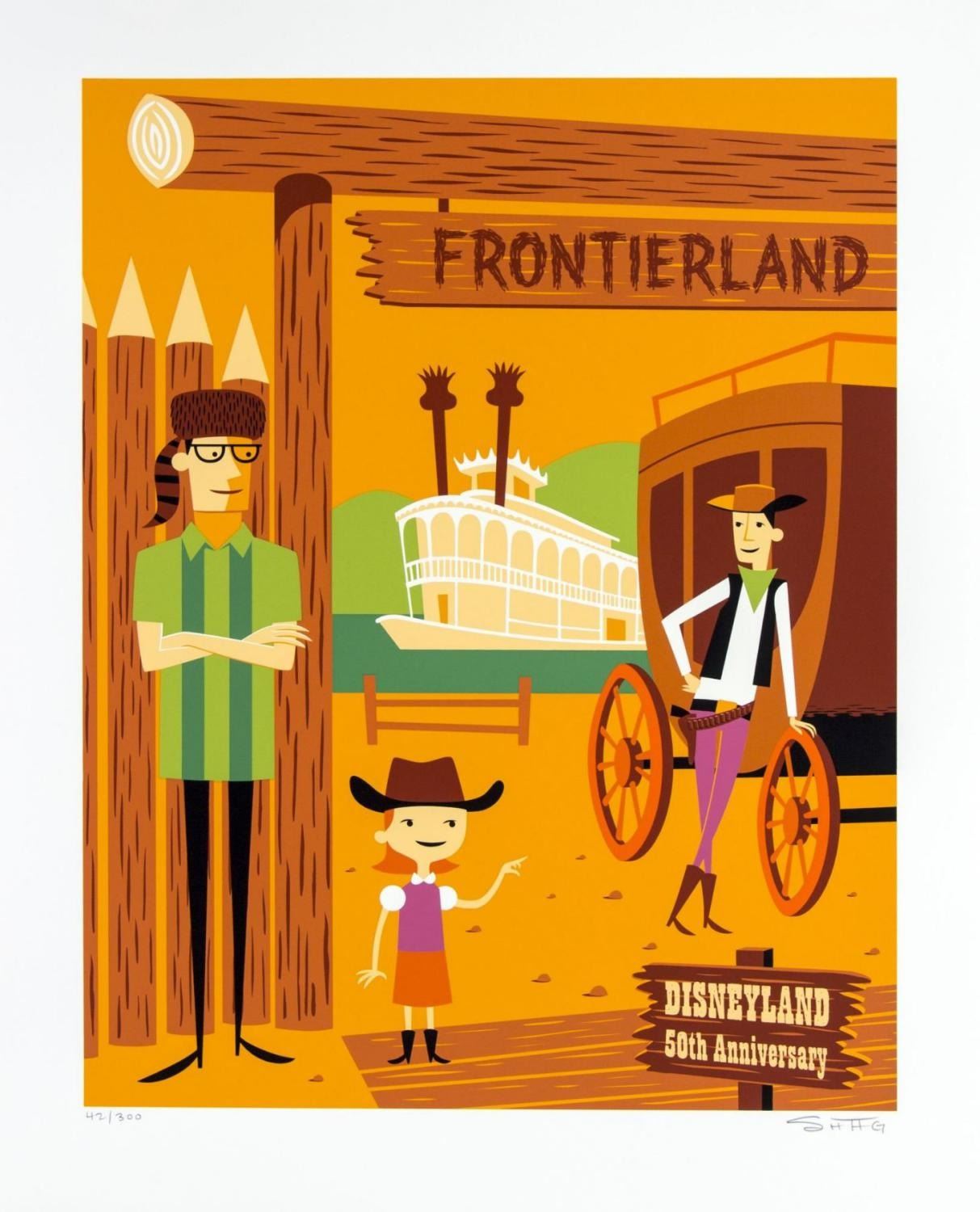(Disneyland, 2005) A Frontierland serigraph print by SHAG from the Original Lands Collection, created for the 50th Anniversary of Disneyland. The print is hand-numbered 42 of 300 and signed by SHAG at the bottom right in graphite. Measuring 27 " x 21 ", the print is in very good condition with minor edge wear.