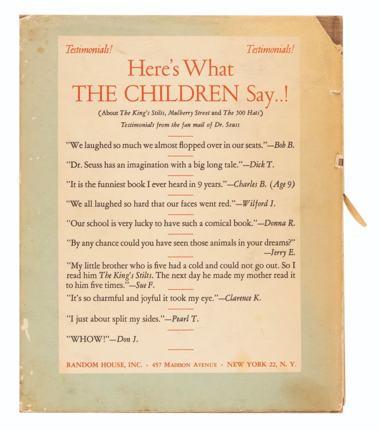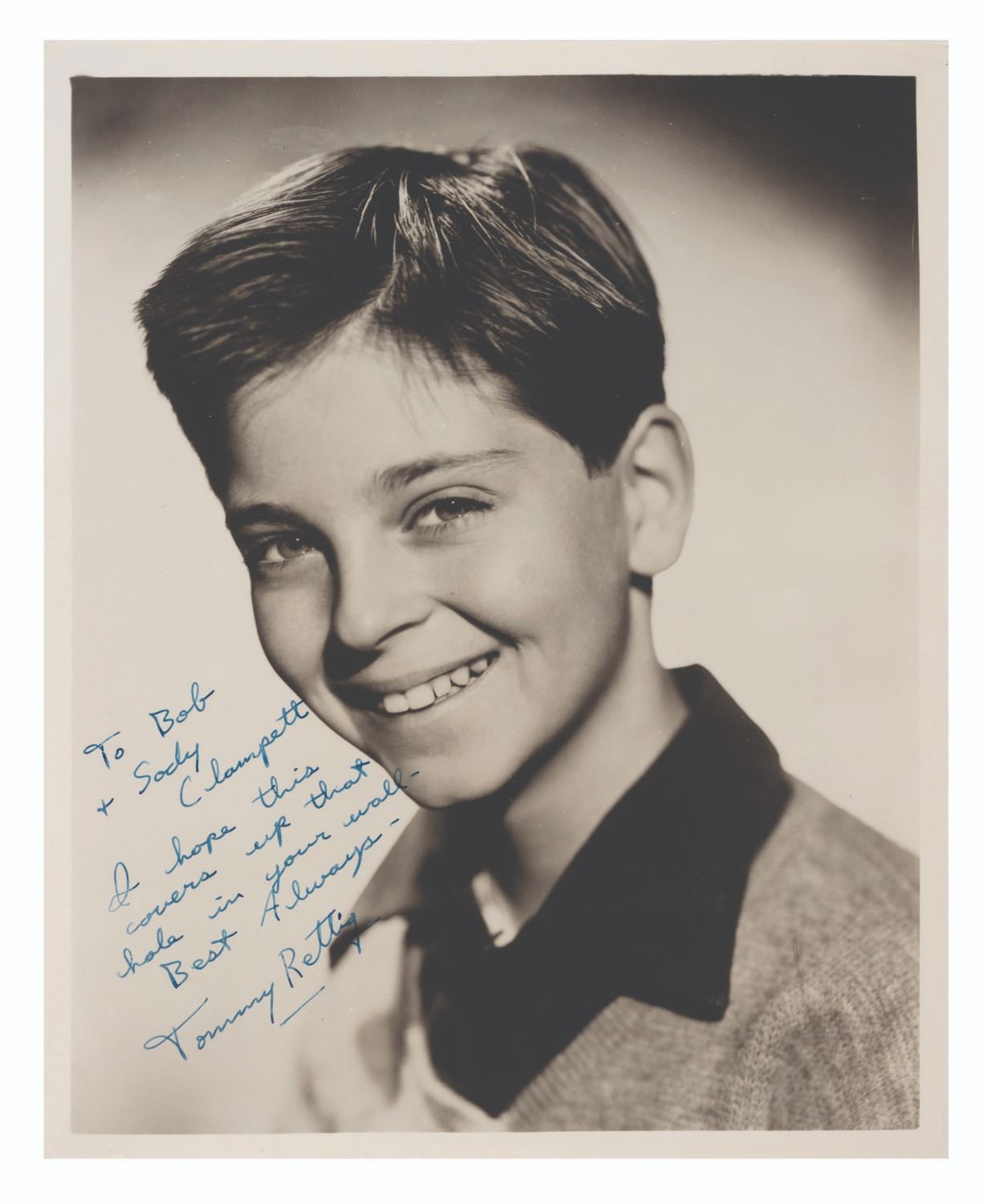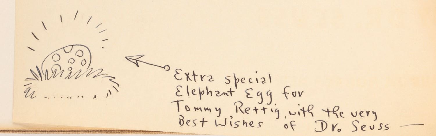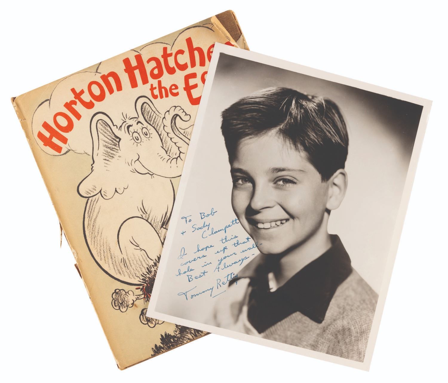 (Random House, 1940) A first edition of Horton Hatches the Egg book signed with a small drawing by Dr. Seuss. Seuss signed the book with a small egg sketch and personal inscription to Tommy Rettig who starred in his film “The 5,000 Fingers of Dr. T.” Rettig later gave the book to Bob Clampett, along with a personally signed headshot. The 8.5” x 10.5” book displays in good condition with pencil notations, discoloration from age, and heavy wear and tear on the dust jacket, notably to the spine, while the 8” x 10” signed photo is in good condition with creases, scratches, and wear.