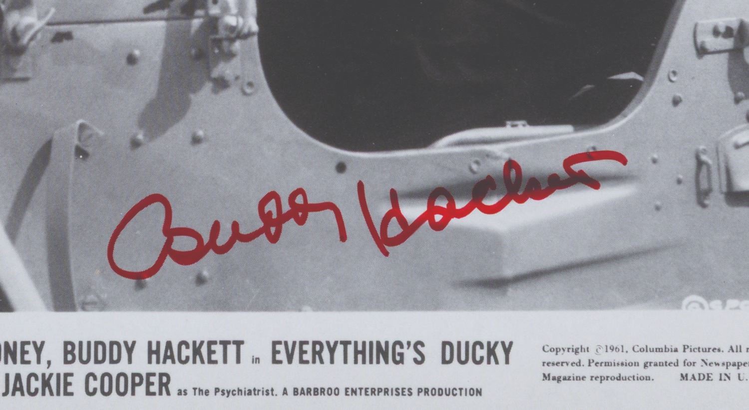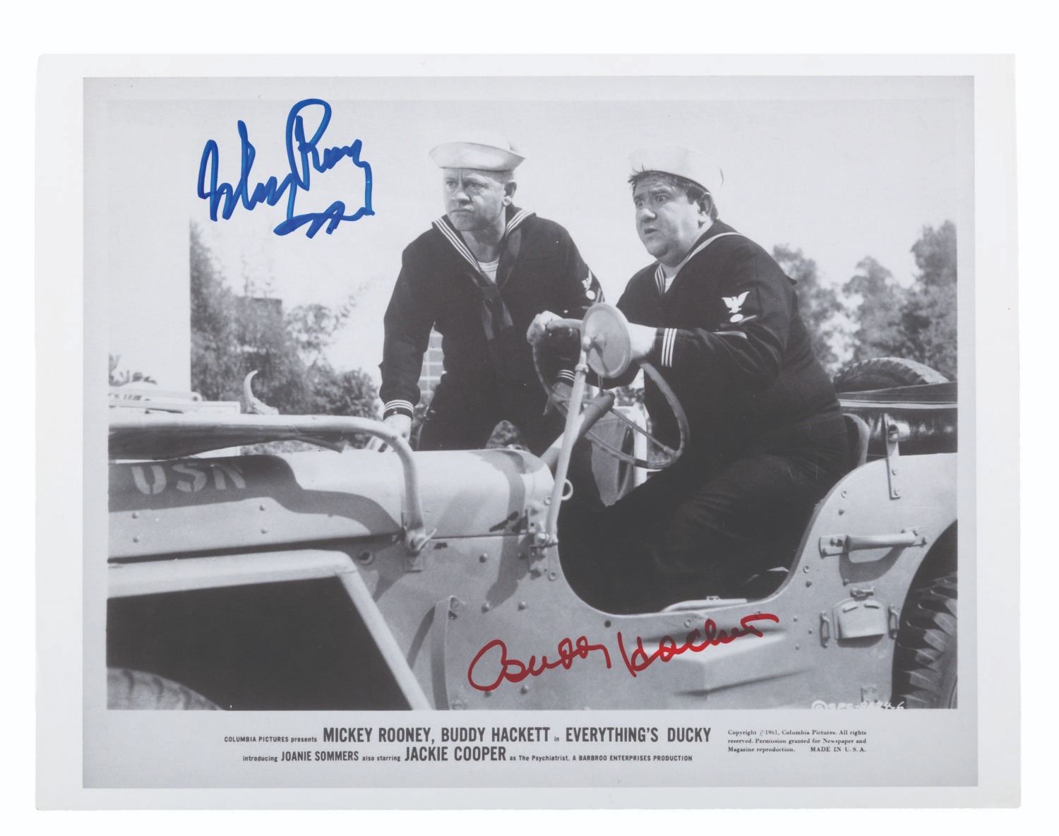 (Columbia, 1961) A lobby card for "Everything's Ducky," signed by stars Mickey Rooney and Buddy Hackett. Measuring 8.5" x 11", the card is in very good condition with light discoloration, minimal creasing, and a small stain on the lower reverse.