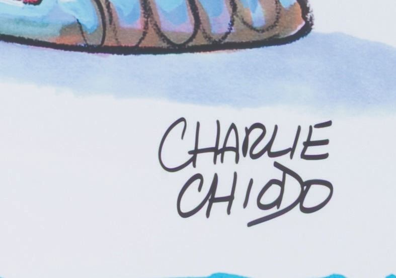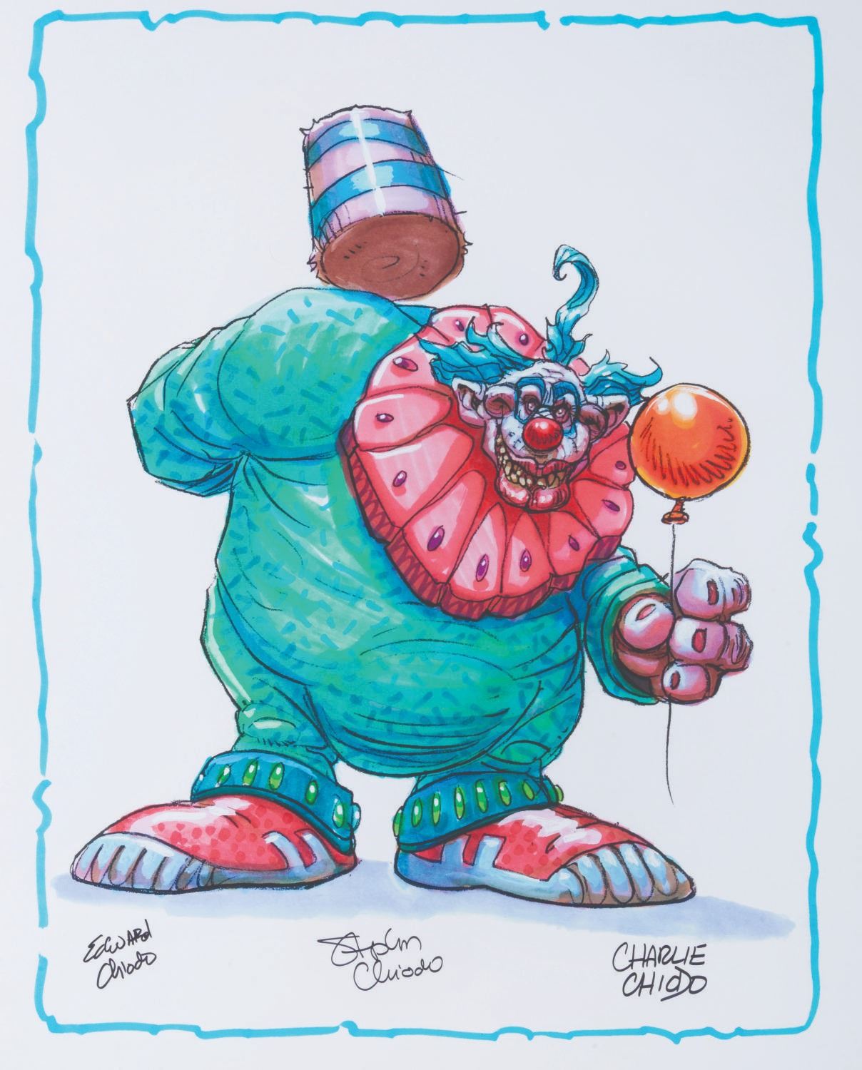 (Chiodo Bros., 2006) A “Killer Klowns from Outer Space” giclee print titled “Banga,” signed by the film’s creators Charlie, Edward, and Stephen Chiodo. The print was created and authorized by the Chiodo Brothers specifically for their special guest appearance at the Van Eaton Galleries booth during the 2006 San Diego Comic Con. Measuring 18" x 23”, the print is in fine condition.