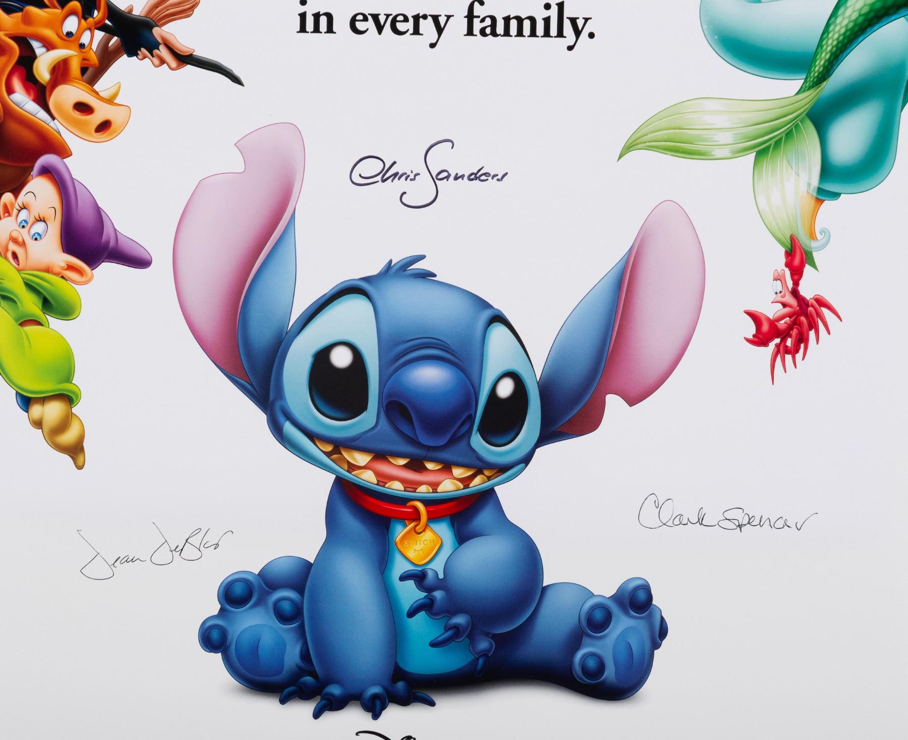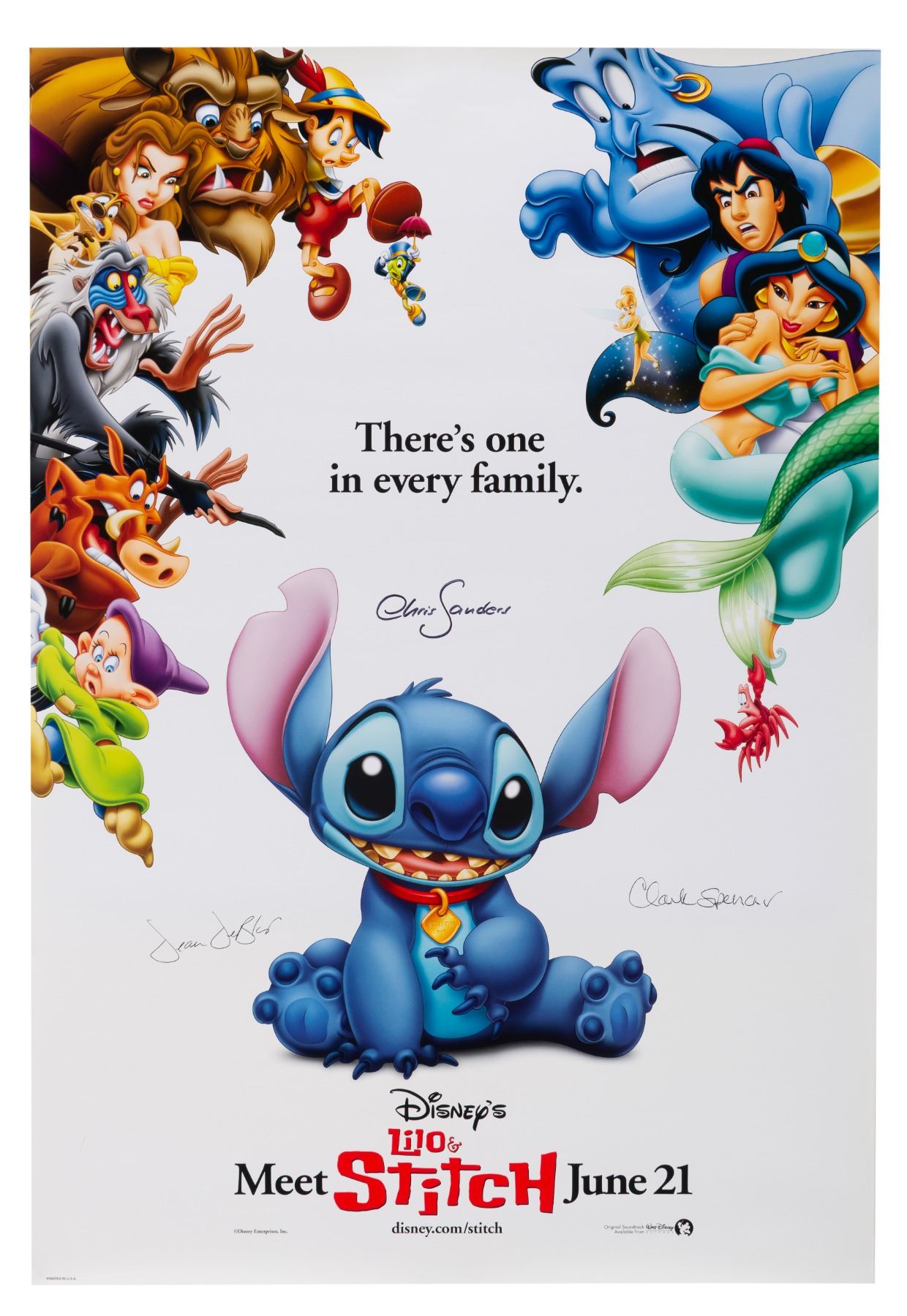 (Disney, 2002) A poster for the theatrical release of "Lilo & Stitch," signed by Directors Dean DeBlois and Chris Sanders, and Producer Clark Spencer. Measuring 18.5" x 27" the poster is in very good condition with light creasing and edge wear.