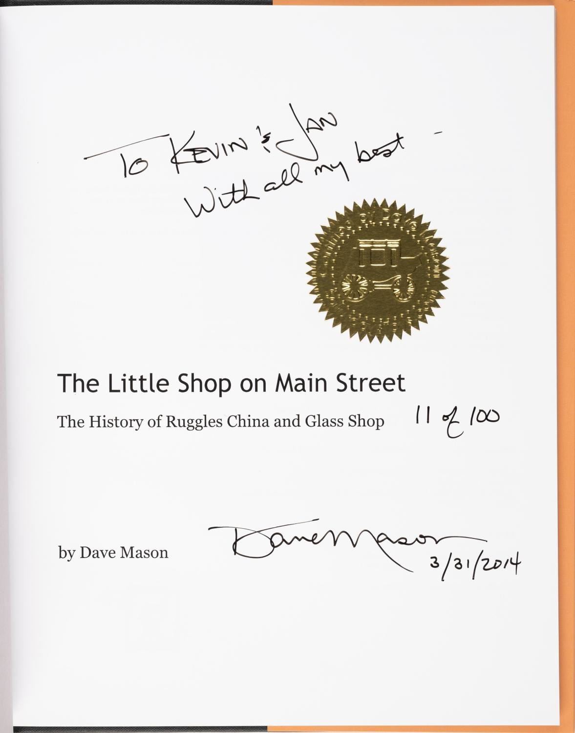 (Park Dreamer Publishing, 2014) The Little Shop on Main Street book signed by the author Dave Mason. The 27-page book provides a detailed history of the Ruggles China and Glass Shop once located on Disneyland’s Main Street, U.S.A. Mason signed and dated the title page in black marker with a personalized dedication and numbered it 11/100. Measuring 8” x 10” the book is in very good condition with light surface scratches on the dust jacket.