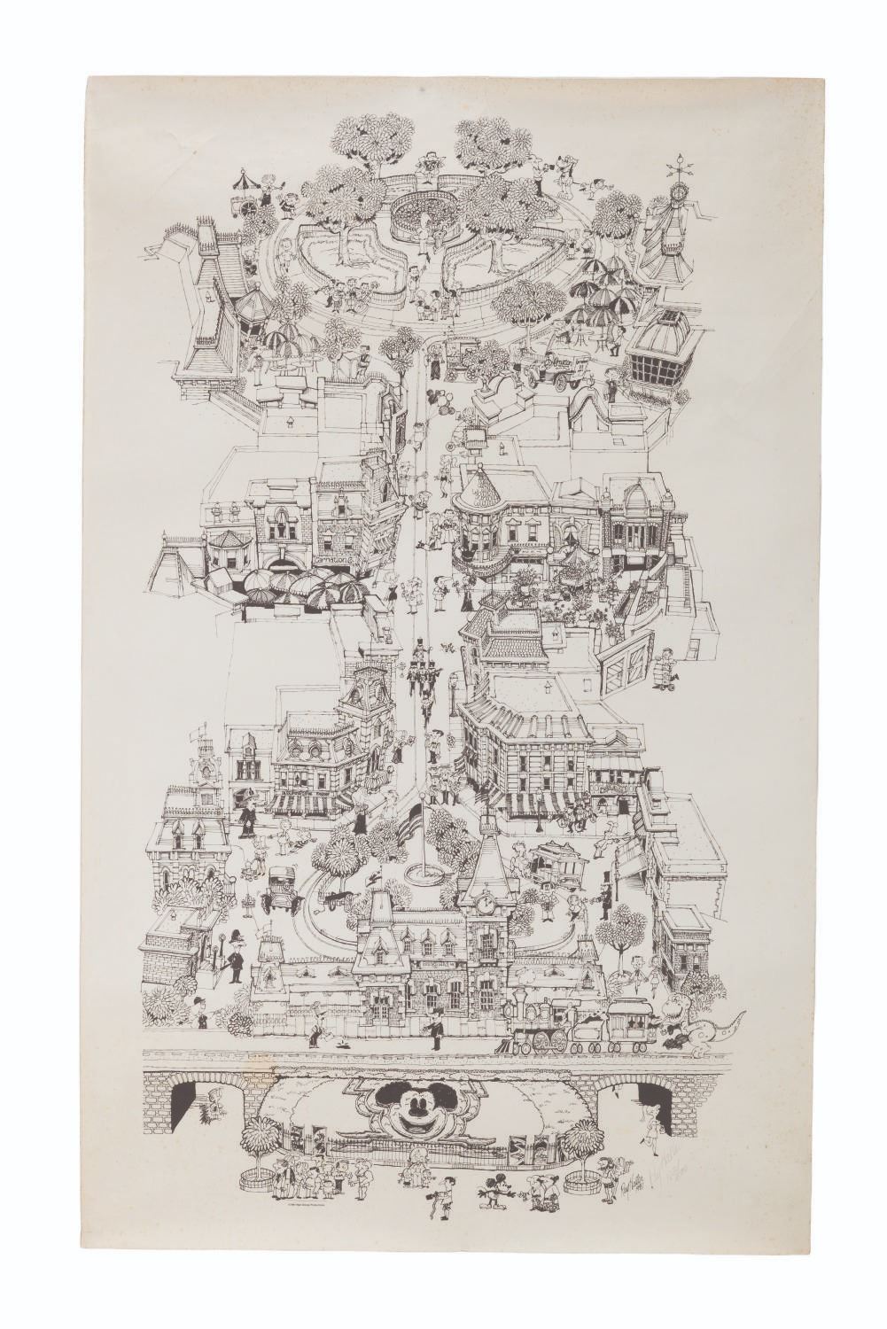 (Disneyland, 1981) A lithograph of Main Street, U.S.A. at Disneyland, designed by long-time Cast Member Ray Haller. Numbered 102 of 500, and measuring 25" x 40", the limited edition lithograph is in good condition with edge wear, staining, discoloration, and creasing.