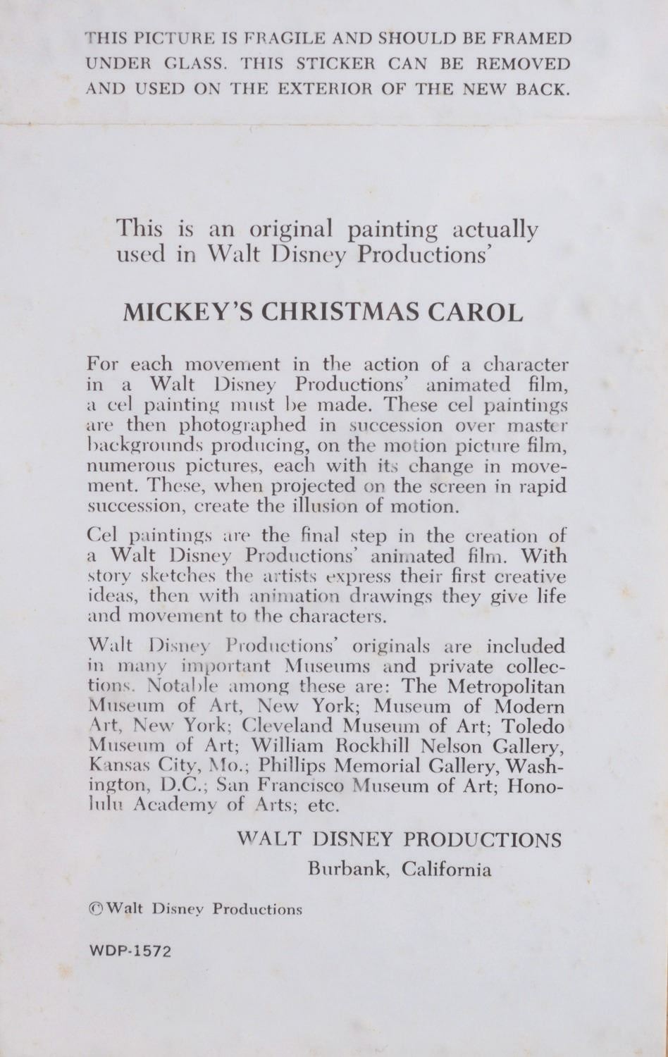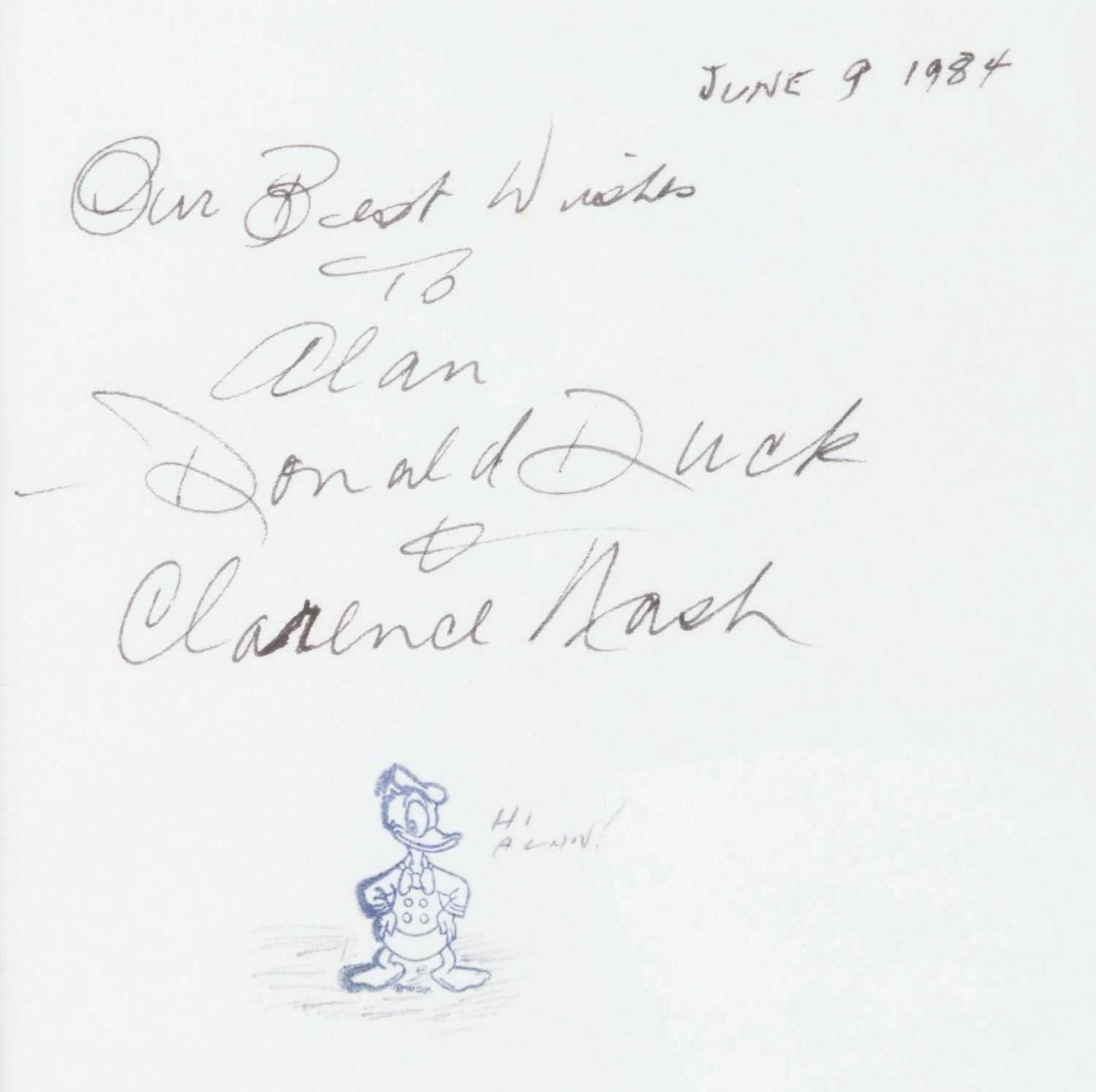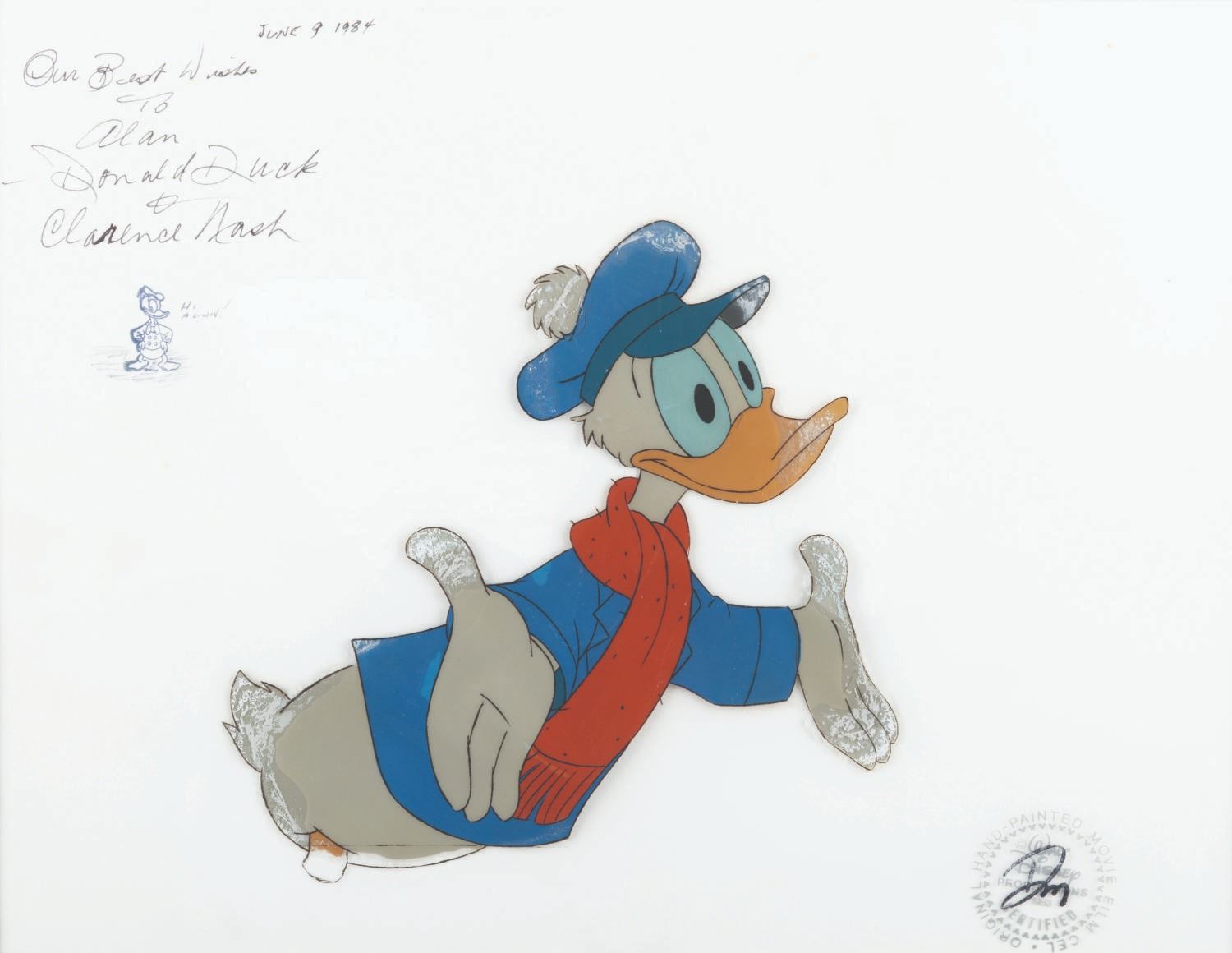 (Disney, 1983/84) An original production cel of Donald Duck from “Mickey’s Christmas Carol,” signed and dated with a dedication by Clarence Nash, Donald’s voice actor for over 51 years. The hand-painted cel bears a Walt Disney Productions seal and is accompanied by a Studio certificate of authenticity. With a character image size of 7” x 7.25” in a 10” x 13” opening of a 13.75” x 16.5” matte, the cel displays in fair condition with crystallization visible from lamination failure.