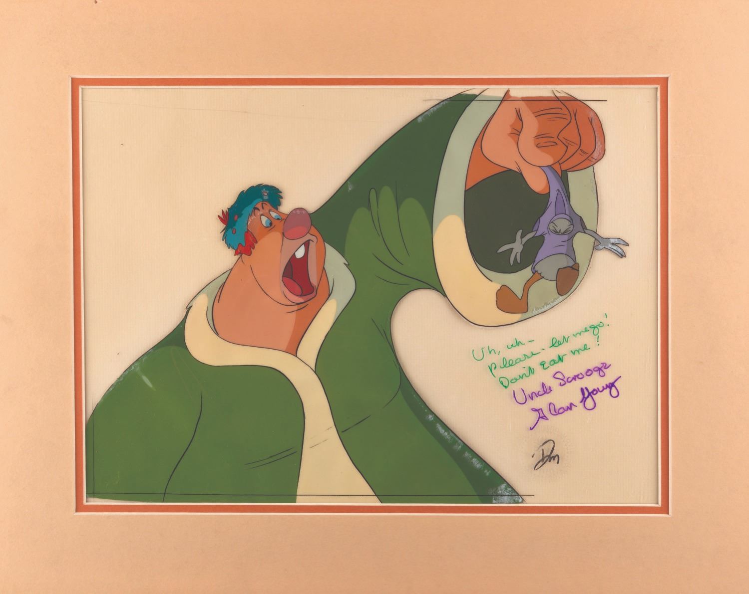 (Disney, 1983) An original production cel of Willie the Giant as the Ghost of Christmas Present from “Mickey’s Christmas Carol,” signed by Alan Young, the voice of Scrooge. With an image size of 11” x 14.25” in a 11” x 15” visible window of a 16” x 20” matte, the art is in fair condition with cracks, scratches, paint loss, scuffs, and wear.