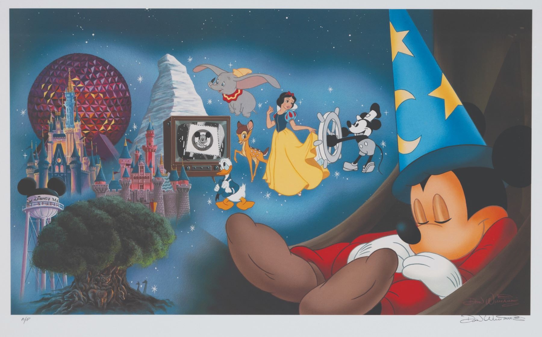 (Disney, 2000s) An Artist's Proof of a litho print titled “Mickey’s Dreams,” signed by the artist Don “Ducky” Williams, featuring Mickey as the Sorcerer’s Apprentice. Framed and measuring 20” x 30”, the print is in very good condition with light wear to the frame.