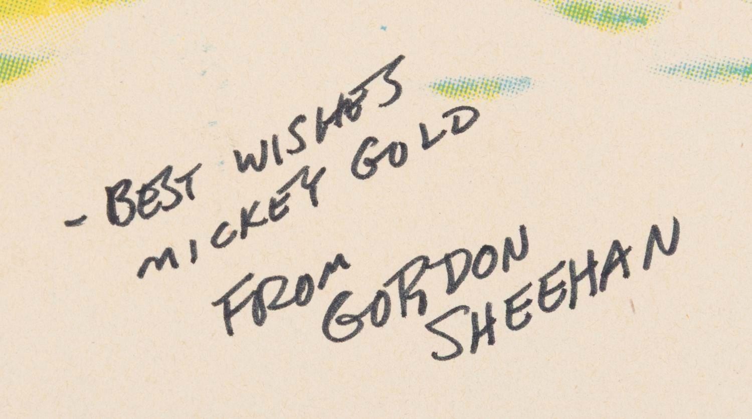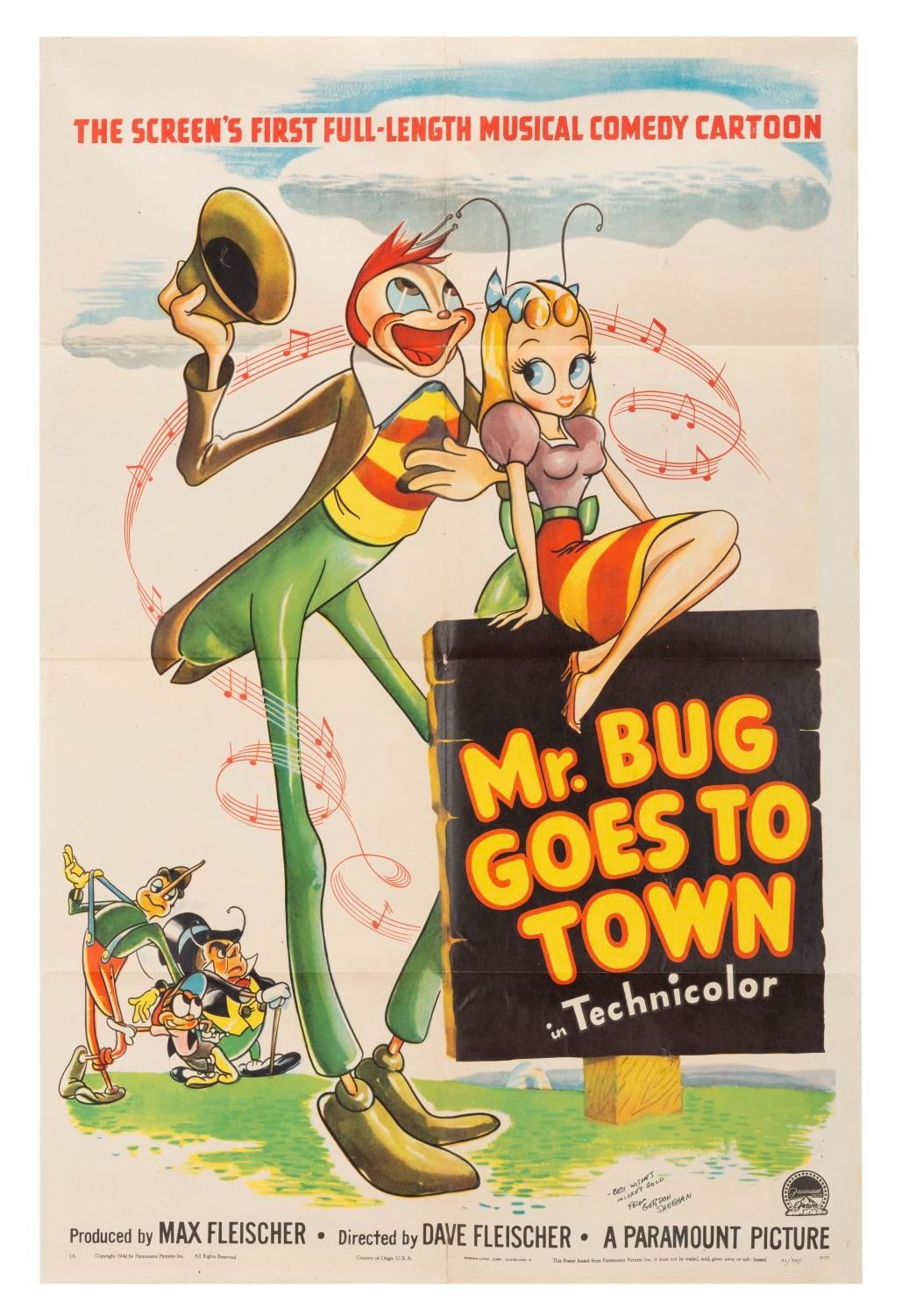(Paramount, 1941) An original one-sheet for the second animated feature from Fleischer Studios "Mr. Bug Goes to Town, " signed by animator Gordon Sheehan. Measuring 27 " x 41 ", the poster is in good condition with discoloration from age, pinholes, tears up to 2 ", visible tape repair, and inscriptions on the reverse.