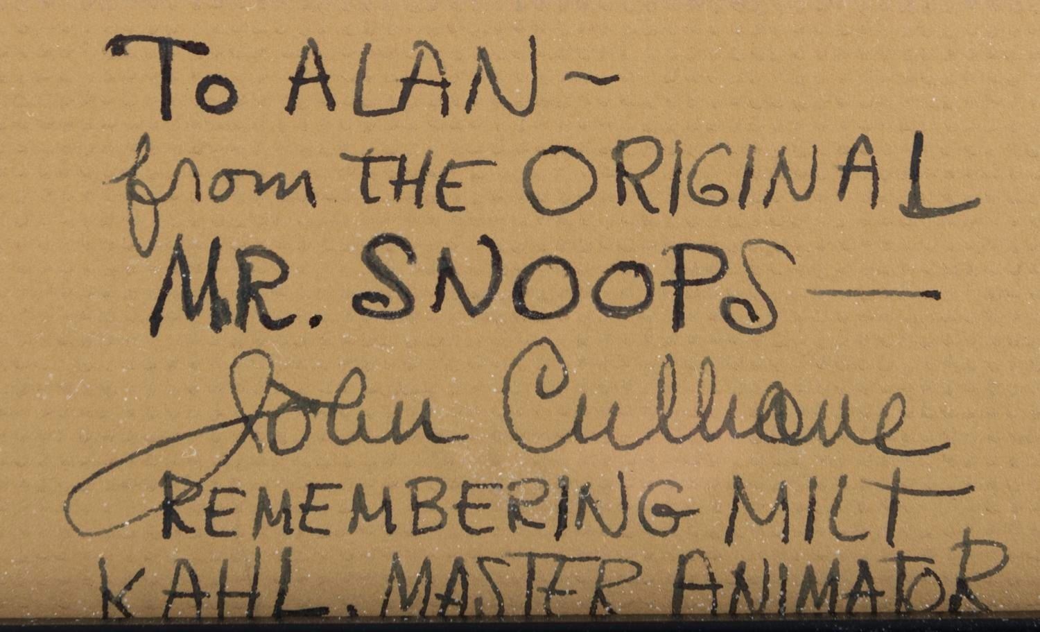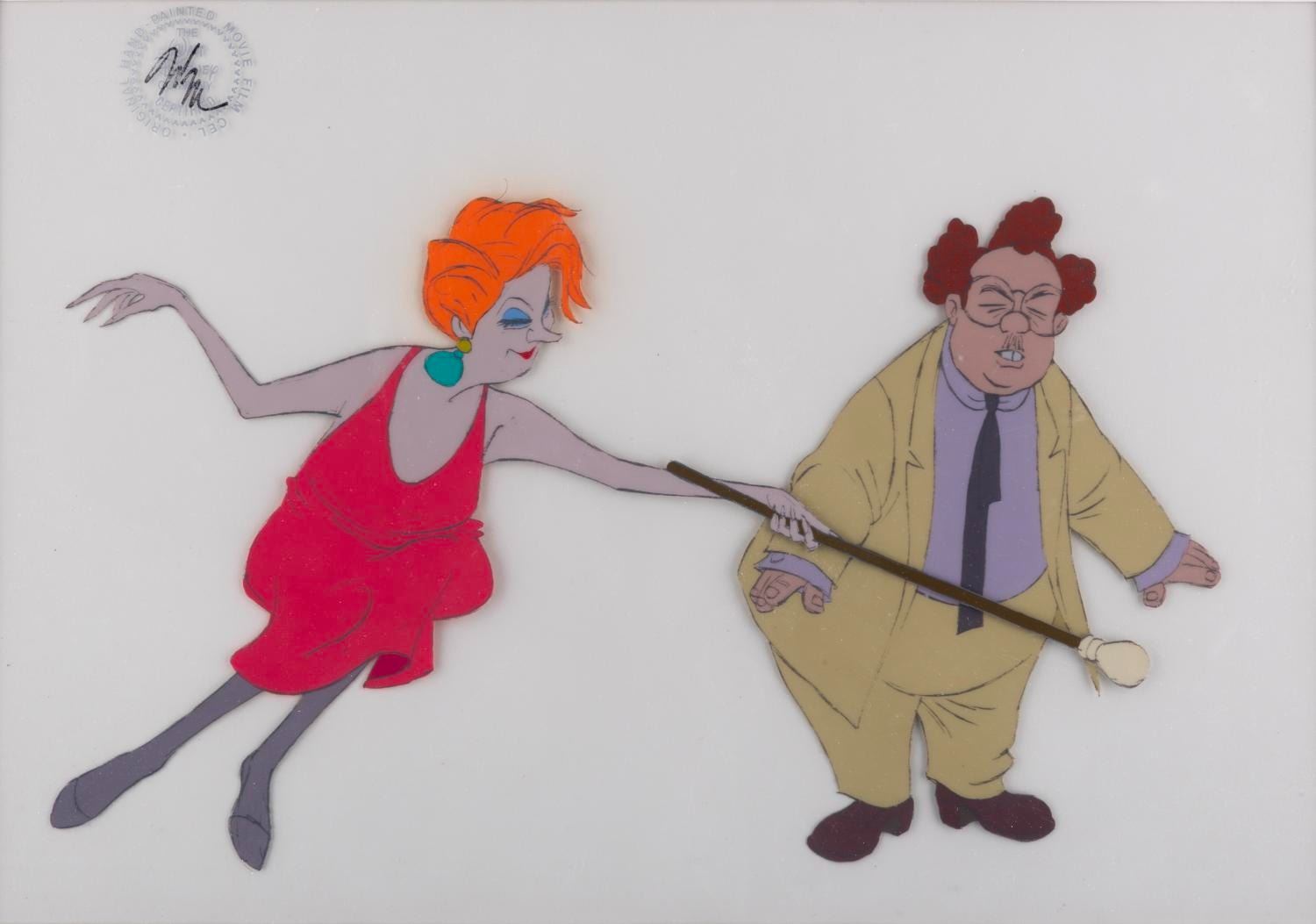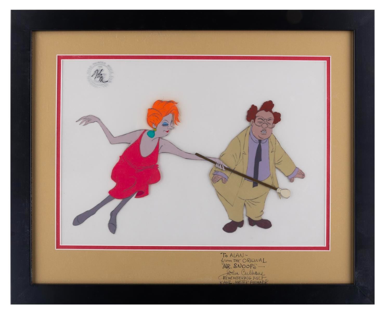 (Disney, 1977) A signed original hand-painted multi-layer production cel from “The Rescuers” featuring Madame Medusa and Mr. Snoops. The matte was signed by John Culhane with a personalized dedication and tribute to Milt Kahl, the artist behind the two characters. Culhane, an author and animation historian, was the inspiration for Snoops' appearance. With a character image size of 8” x 13.5” in a 10.5” x 15” opening of a 15” x 19” matte, the piece displays in very good condition with light scratches and wear.