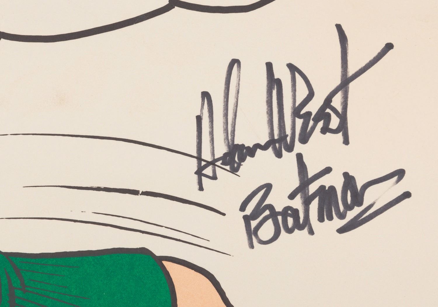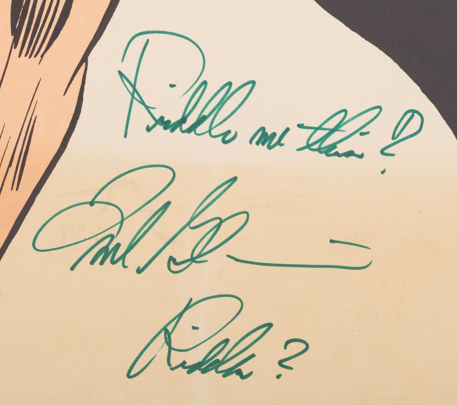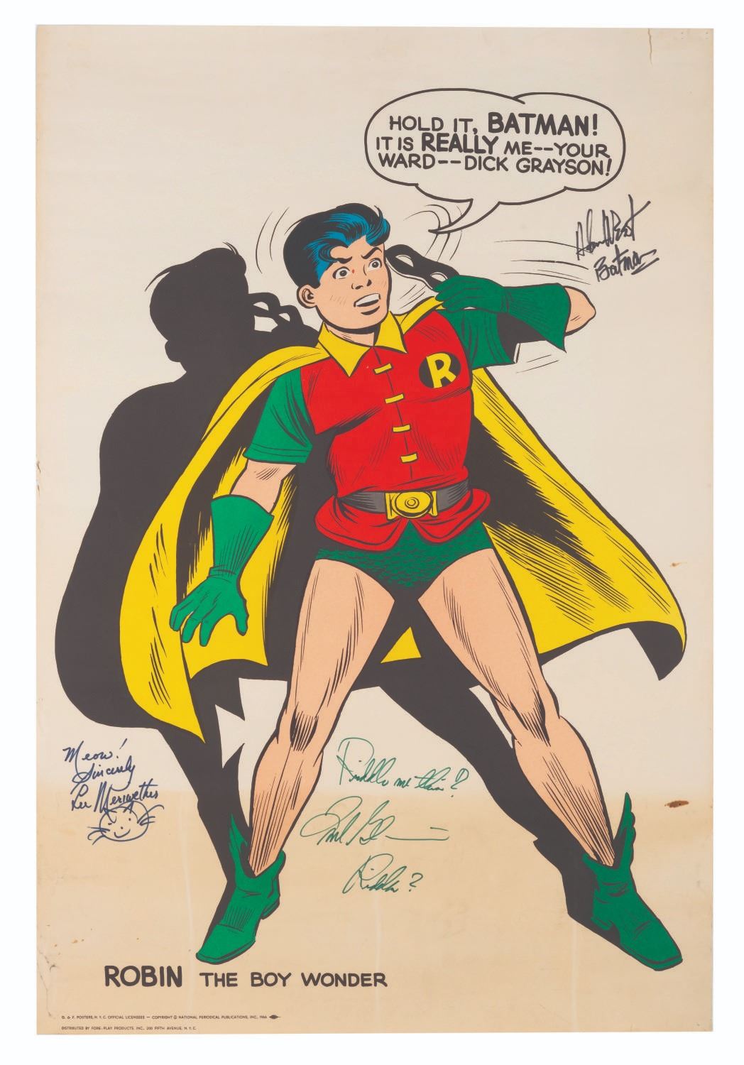 (G & F Posters, 1966) A Robin, The Boy Wonder poster signed by 1960s TV show cast members Adam West (Batman), Lee Meriwether (Catwoman), and Frank Gorshin (The Riddler). The poster measures 27” x 40” and is in fair condition with edge wear, tears, and stains throughout, heavy creasing, pinholes, a 1.75” tear in the upper right, tape residue with light surface loss on the reverse, and heavy discoloration through the entire lower quarter.