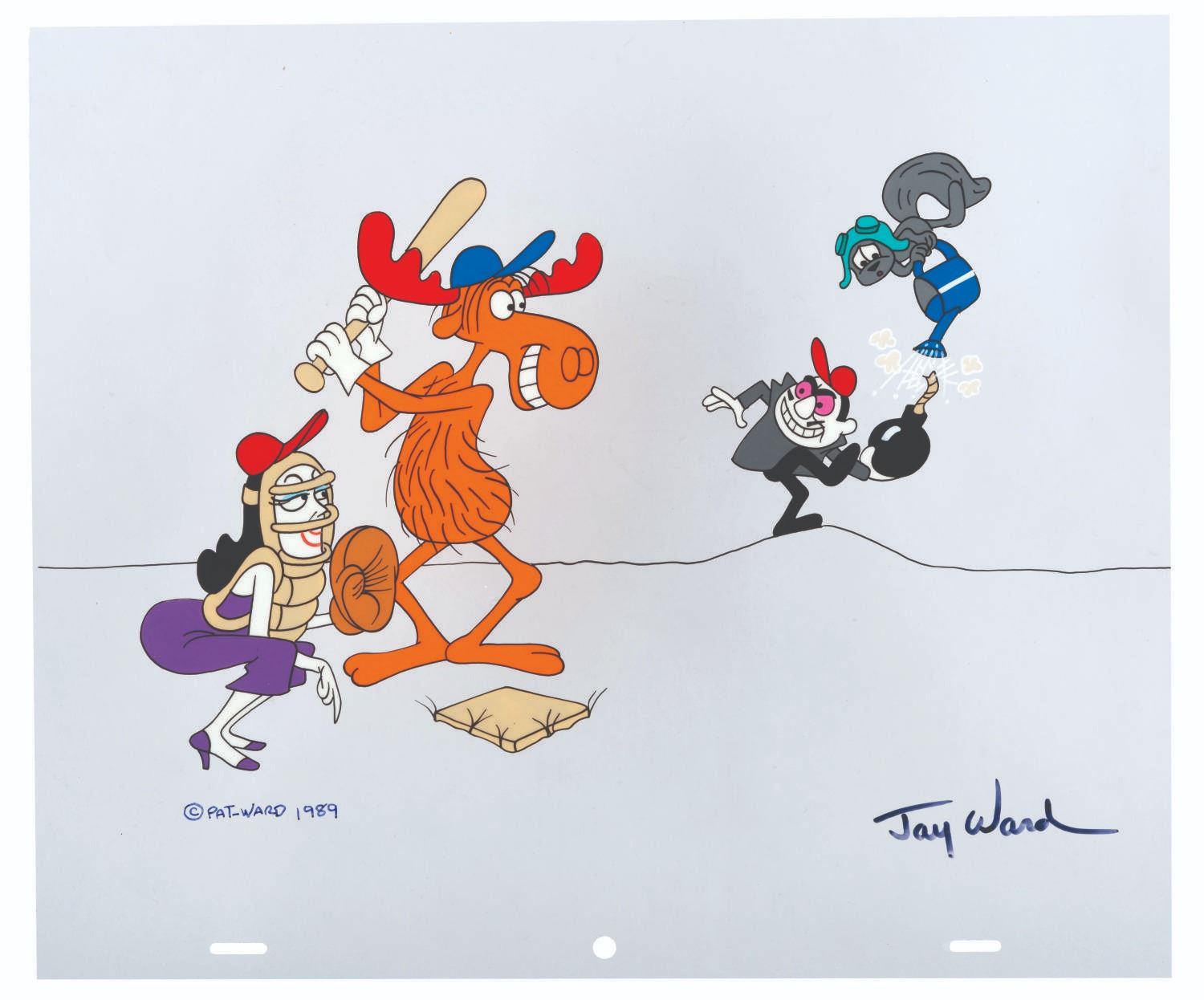 (Ward, 1989) Scene Cel #12 in the Jay Ward Productions Original Animation Scene Cels Collection, featuring the main characters of “The Rocky and Bullwinkle Show” playing baseball, signed in ink by Ward. With an image size of 6.75” x 10” on a 10.5” x 12.5” cel, the piece is in fine condition.