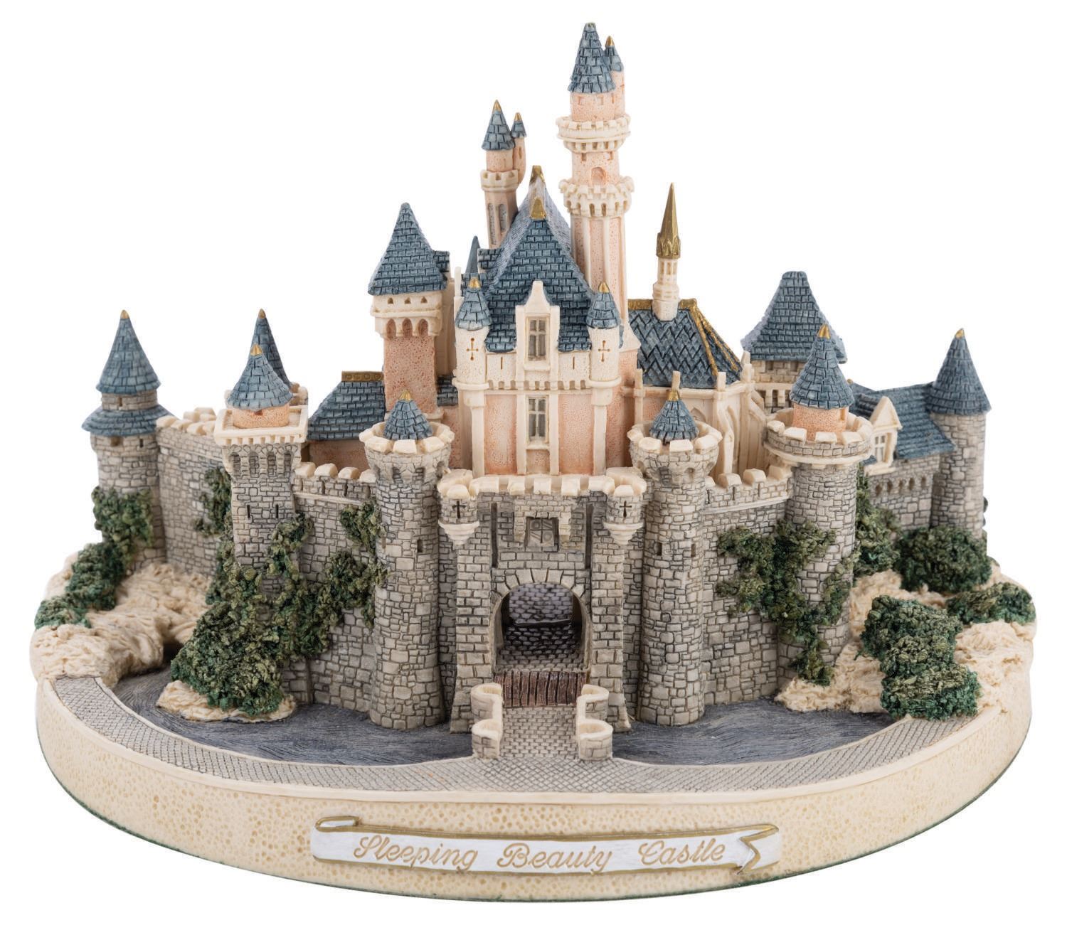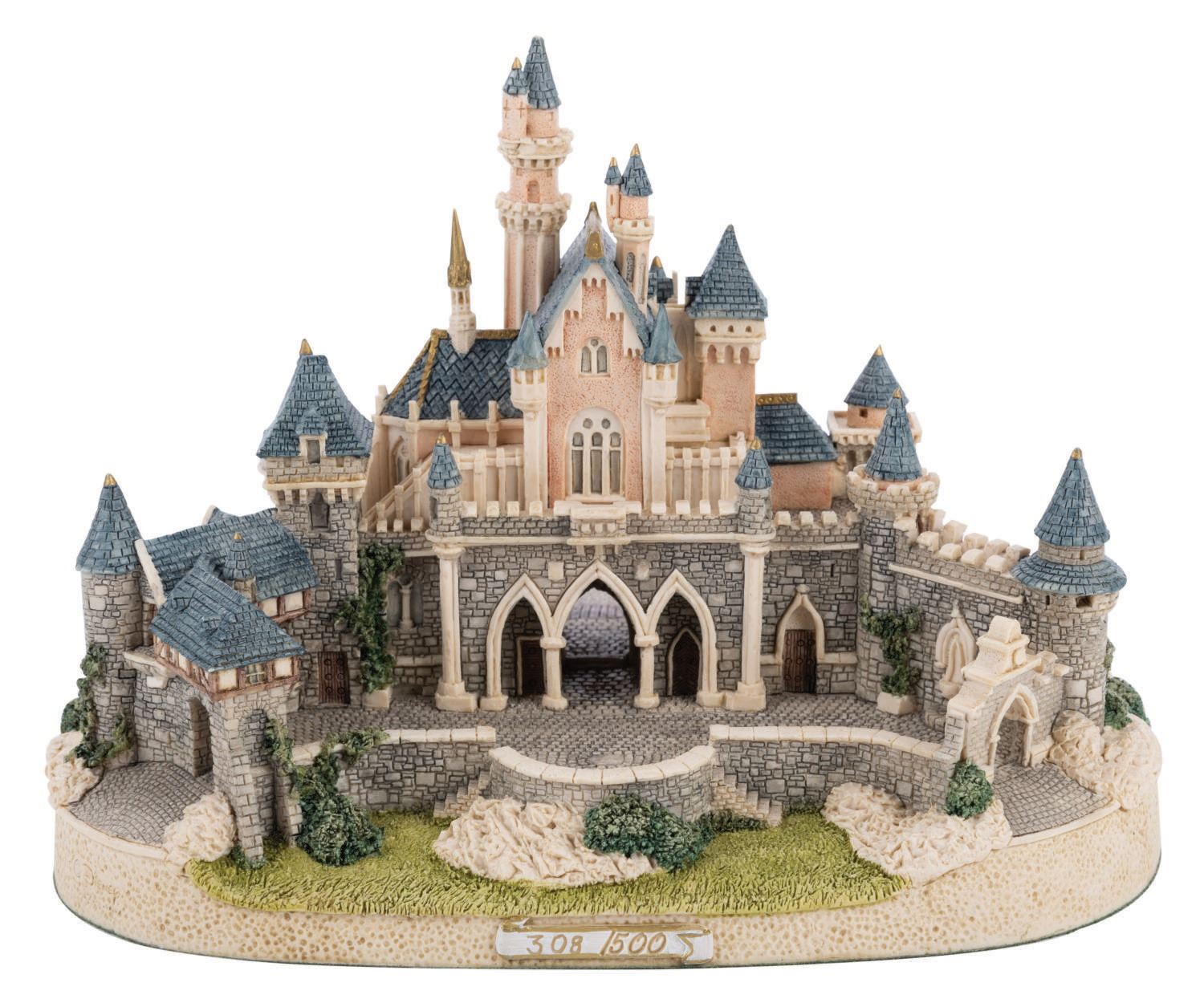 (Disneyland, 1993) A miniature model of Sleeping Beauty Castle by John Hines Studios. This small statue of the Fantasyland landmark was created in a limited edition for the Official Disneyana Convention in Anaheim, is numbered "308/500," and is both signed and personalized on the bottom of the base. Measuring 5.5" tall, and 7.75"x6.5", the piece is in fine condition with few signs of wear and slightly faded signature on felt bottom from handling.