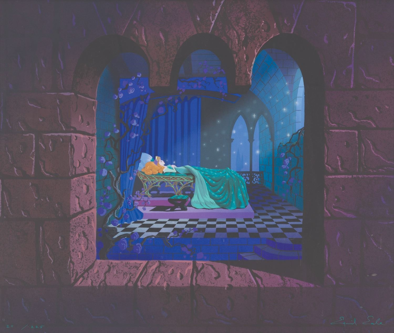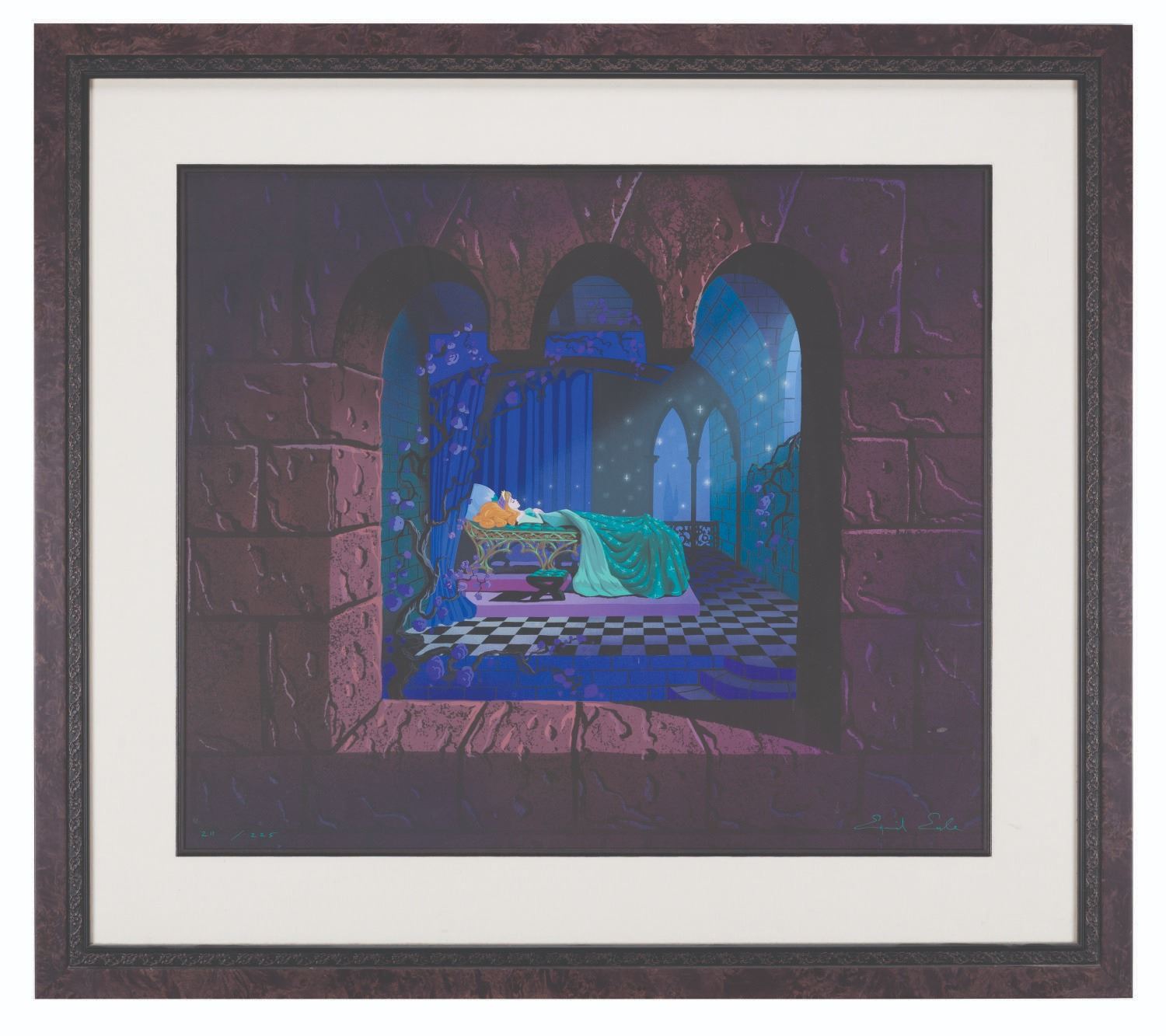 (Disney, 1993) A signed serigraph of Eyvind Earle's original painting for the "Sleeping Beauty" Walkthrough attraction at Disneyland. Titled "The Long Night," this serigraph was released in a limited edition at The Disney Gallery and is hand-numbered 211/225, signed by Earle at the bottom right. The print has an image size of 21.5" x 25.5" in a 31.25" x 35.5" ornate frame. The serigraph is in fine condition, while the frame is in very good condition with light scratches and wear.