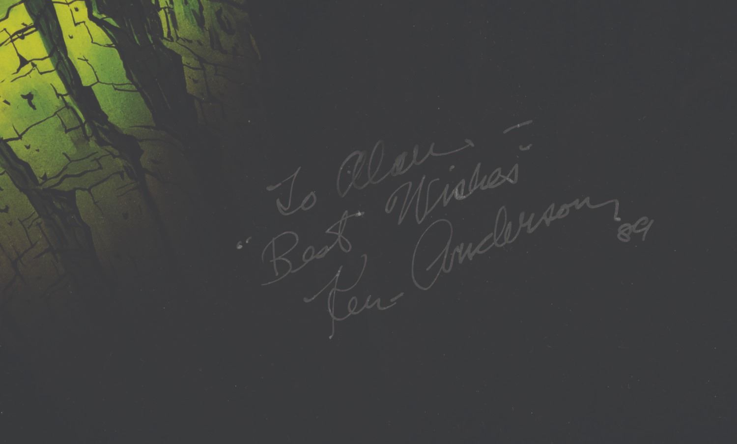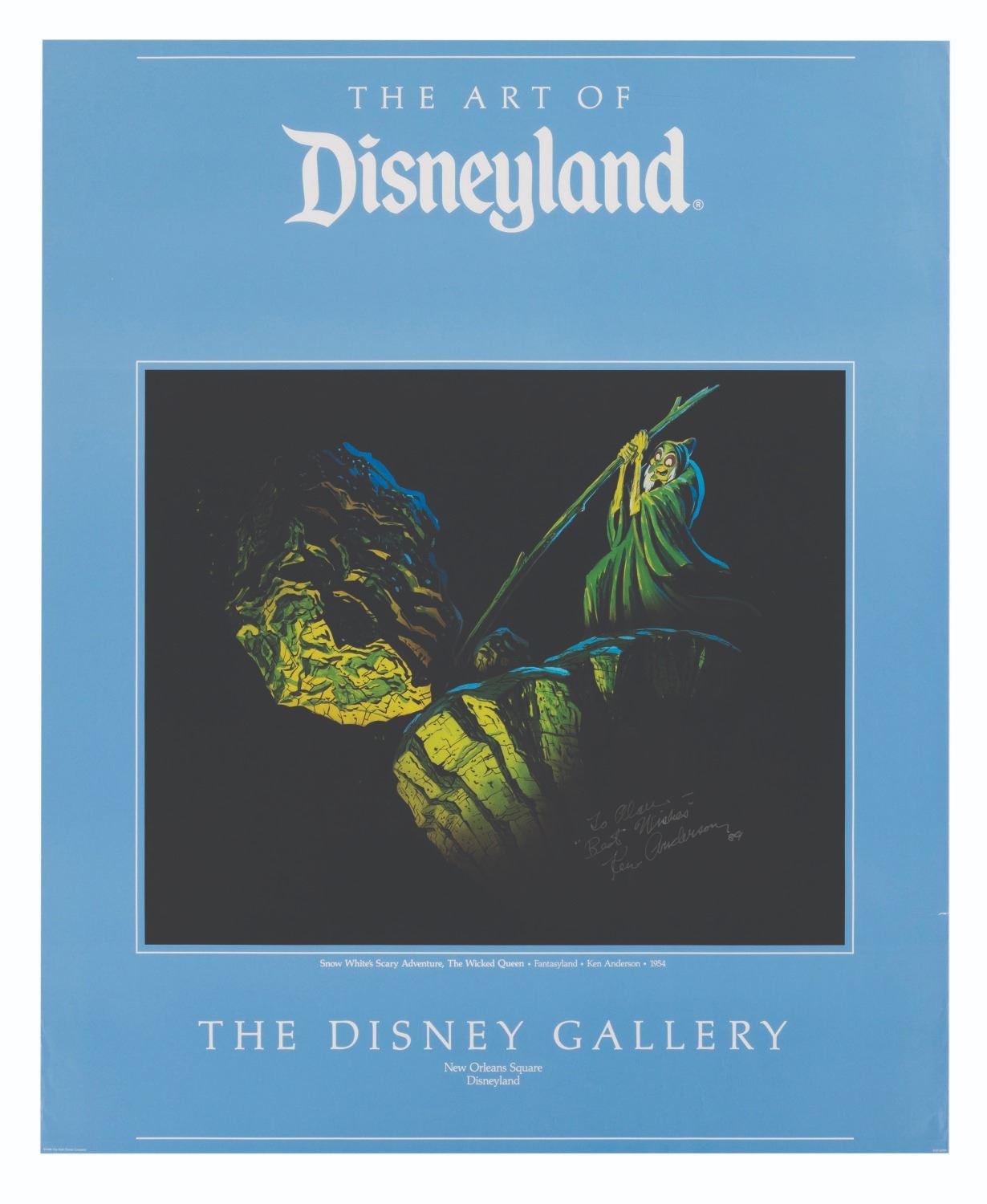 (Disneyland, 1988) A Disney Gallery poster of concept art of the hag from Snow White's Scary Adventures, signed with dedication by the artist, Disney Legend Ken Anderson. Measuring 26” x 32”, the poster displays in very good condition with scratches and edge wear.