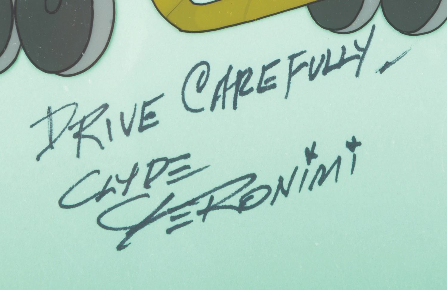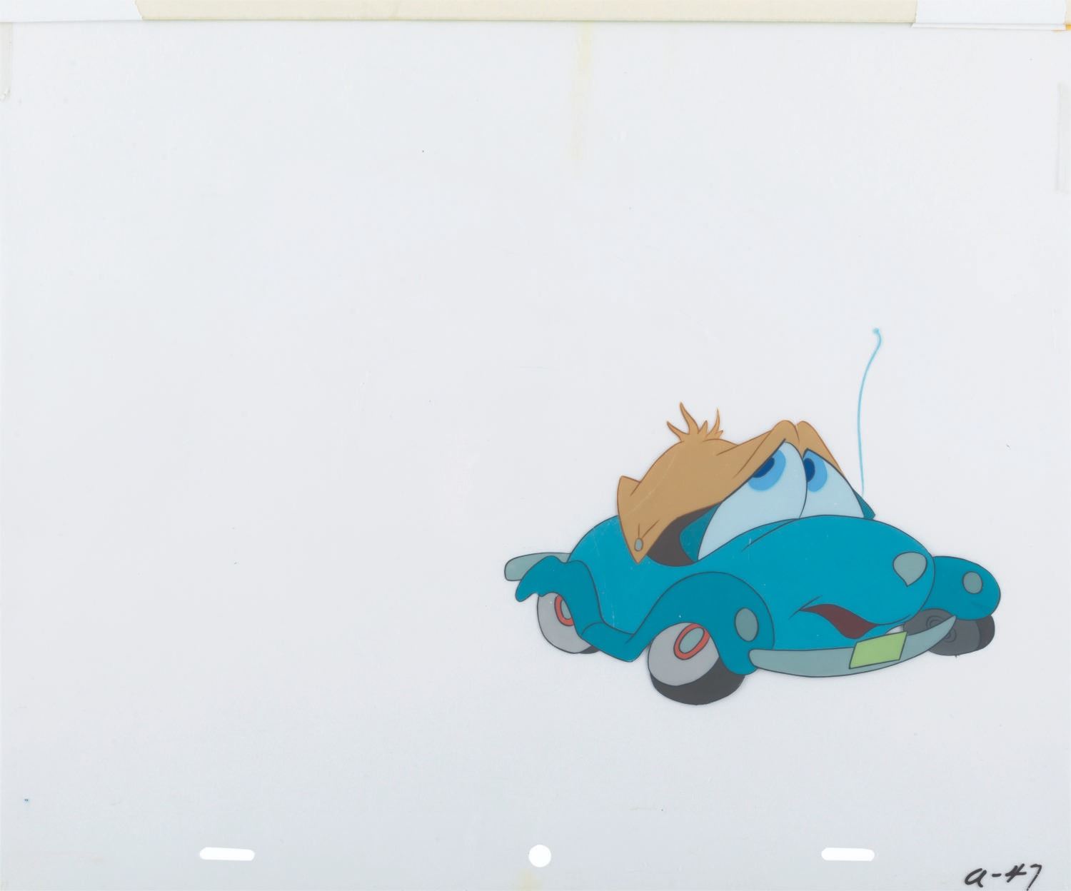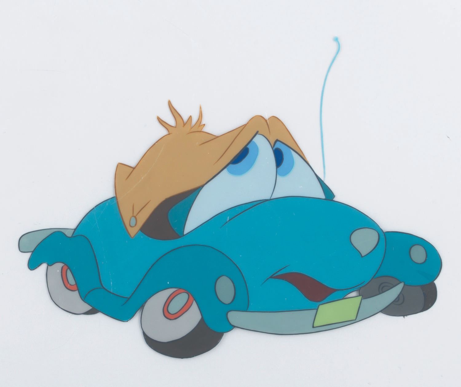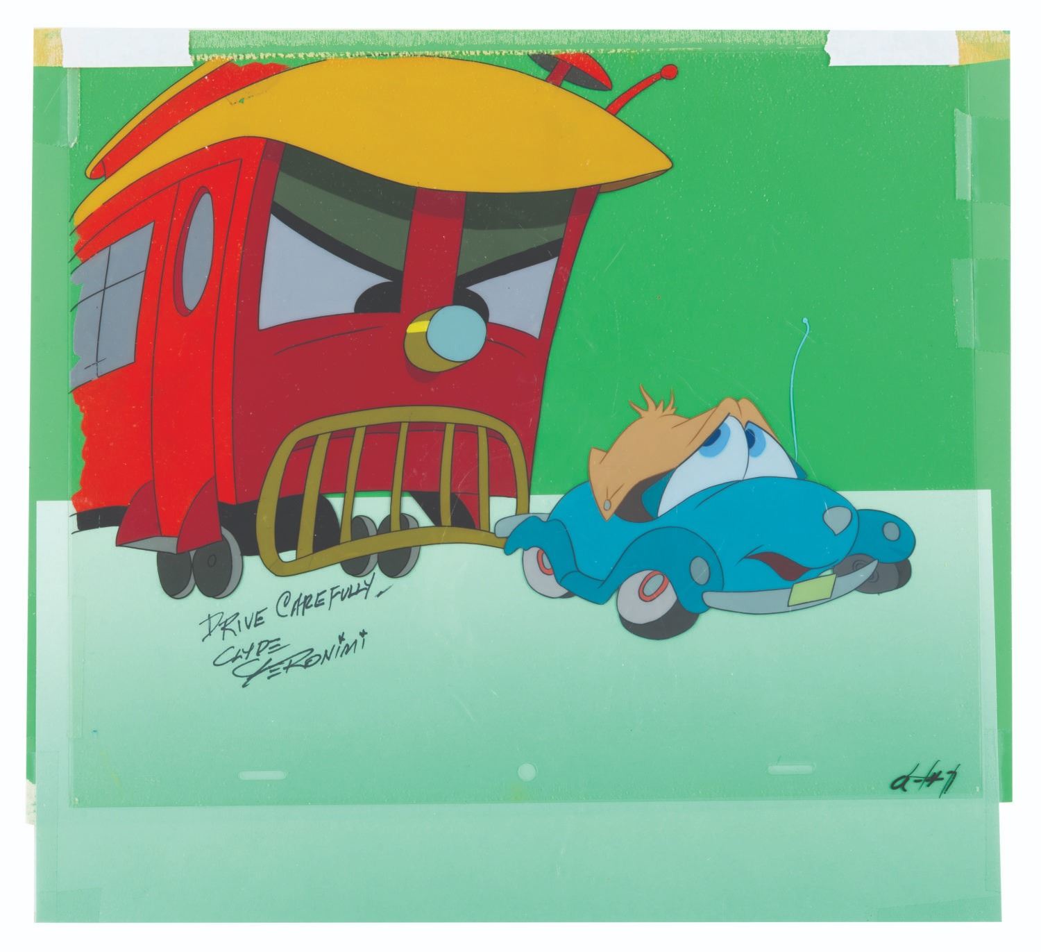 (Disney, 1952) An original multi-layer production cel of Susie and trolly from “Susie the Little Blue Coupe,” with a color copy background signed by the short’s director, Clyde Geronimi. Susie and the trolly have an image size of 8” x 11” on 10” x 12” cels. The entire piece with the background measures 13” x 12”. The hand-painted cel displays in good condition with light paint transfer from the top of the trolley to the background and a light crack on the lower left edge of the mouth.