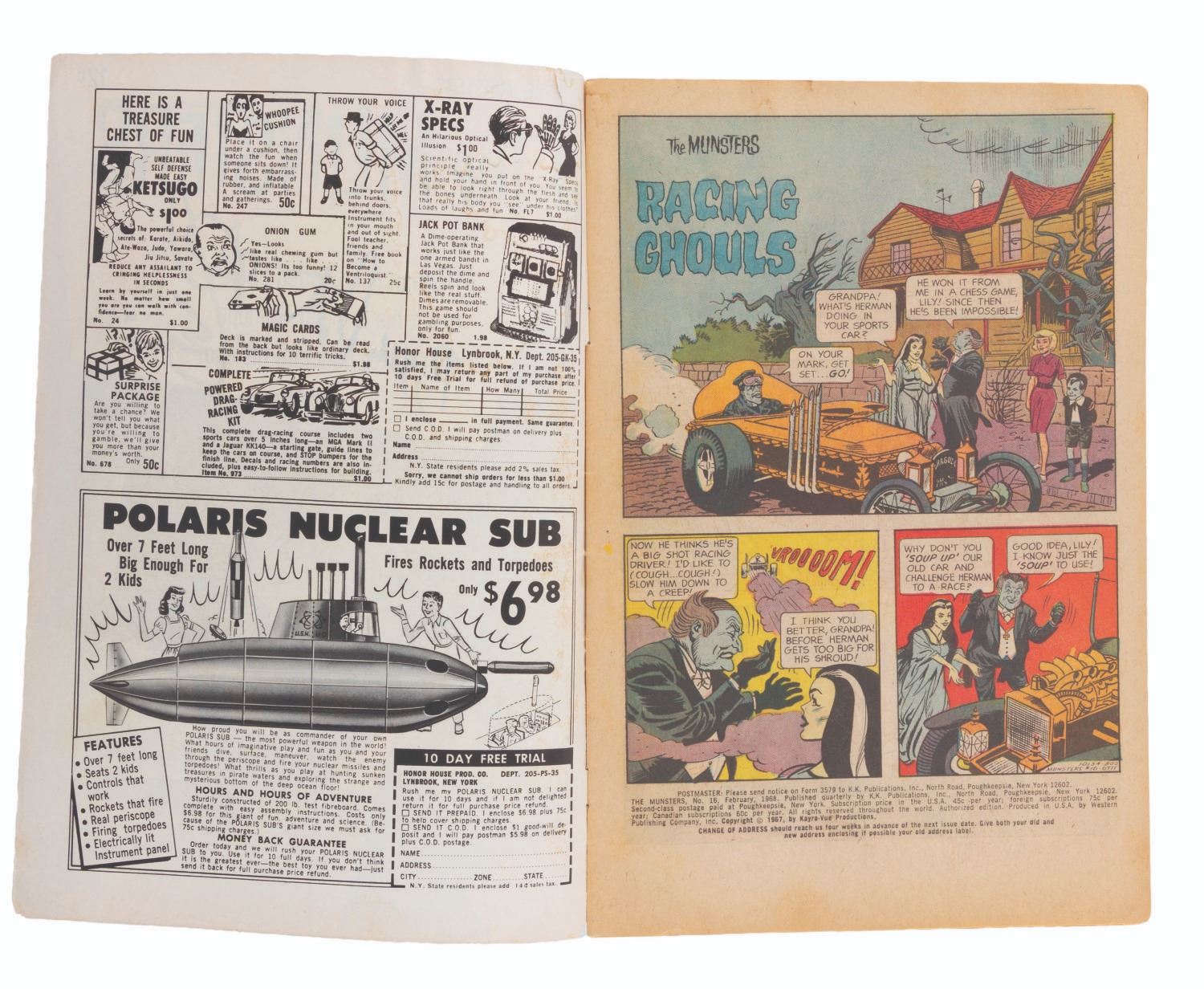 (Gold Key, 1968) Issue #16 of "The Munsters" comic book signed by Al Lewis (Grandpa) and Buddy Patrick (Eddie). Measuring 7" x 10.5", the comic is in fair condition with heavy creasing, edge wear, discoloration, soiling, staining, and warping along the top left edge.