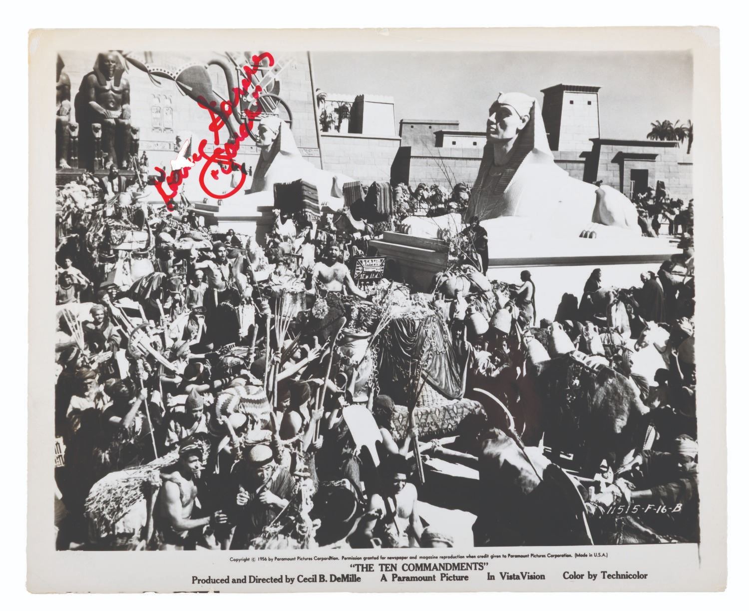 (Paramount, 1956) A lobby card for "The Ten Commandments" signed by Kathy Garver. Measuring 8" x 10", the photo is in good condition with edge wear, discoloration, creasing, and small tears around the edges.