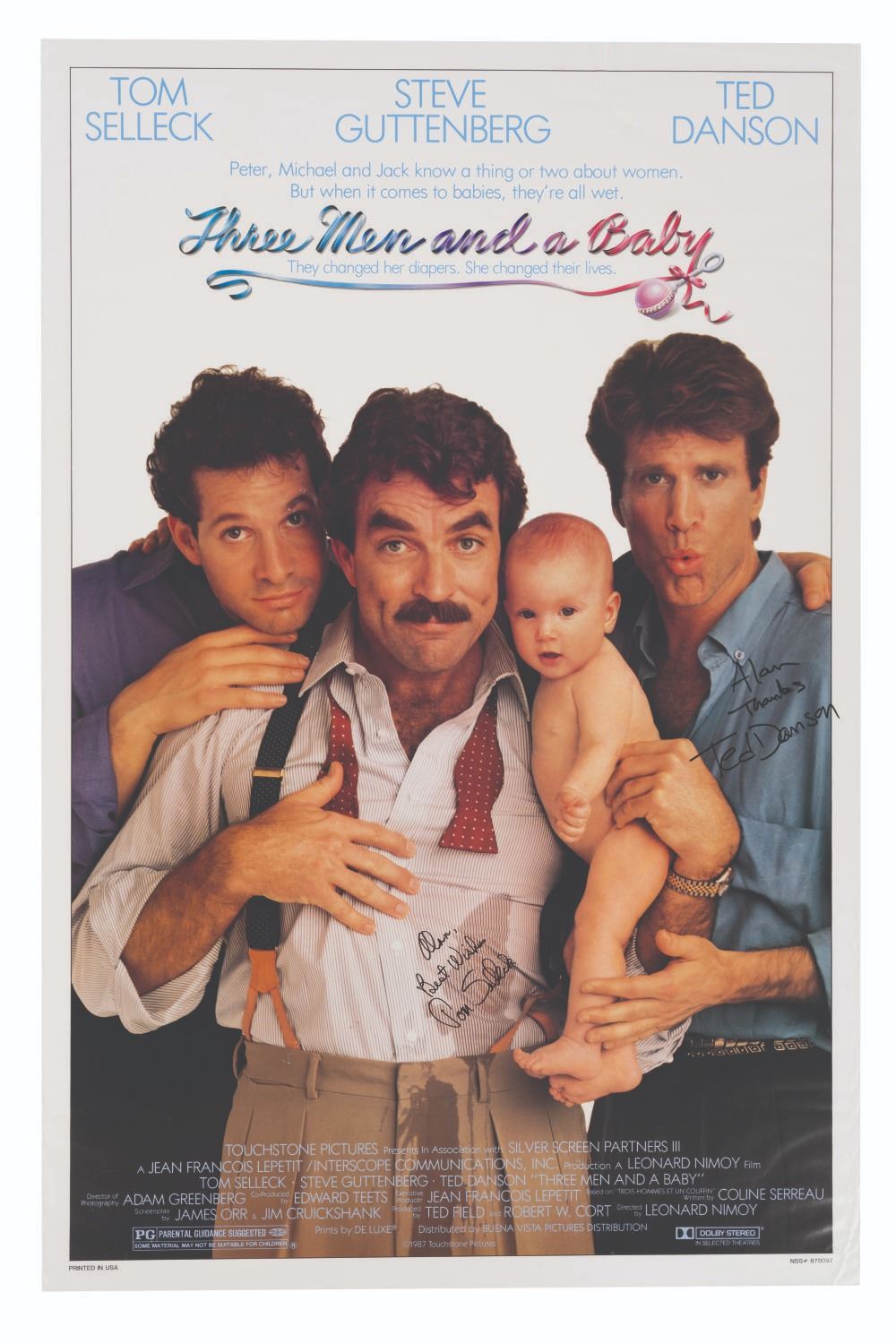 (Buena Vista, 1987) An original one sheet poster for "Three Men and a Baby," signed by actors Ted Danson and Tom Selleck. Measuring 27"x41", this poster is in very good condition with creases throughout, paper wear from creasing near Guttenberg's eyebrow and Selleck's collar, and wear to its edges.