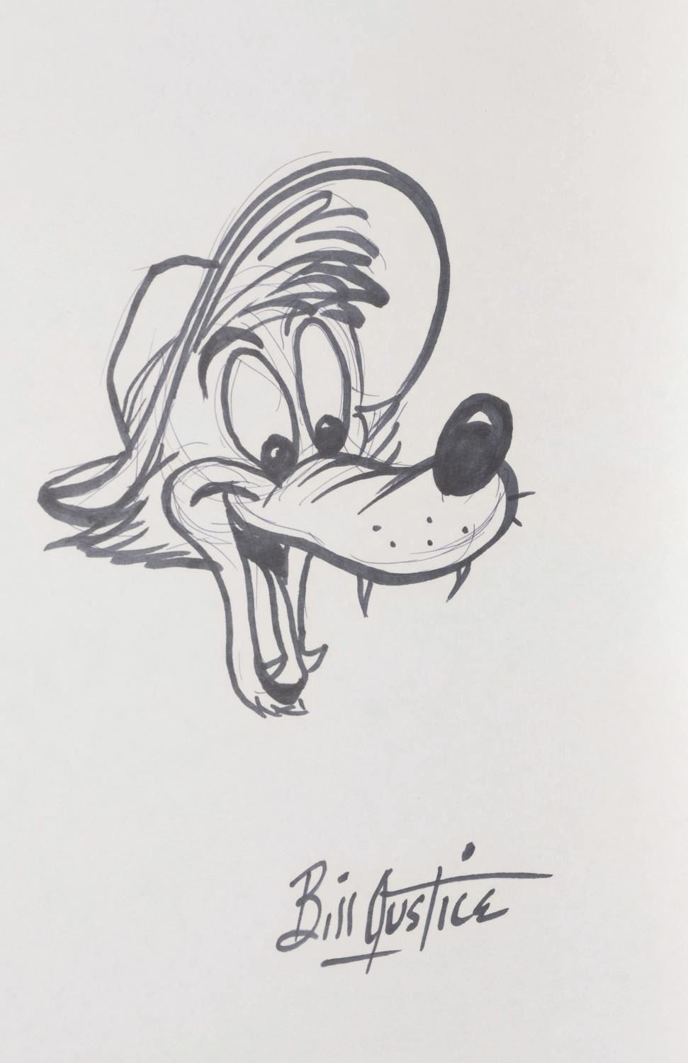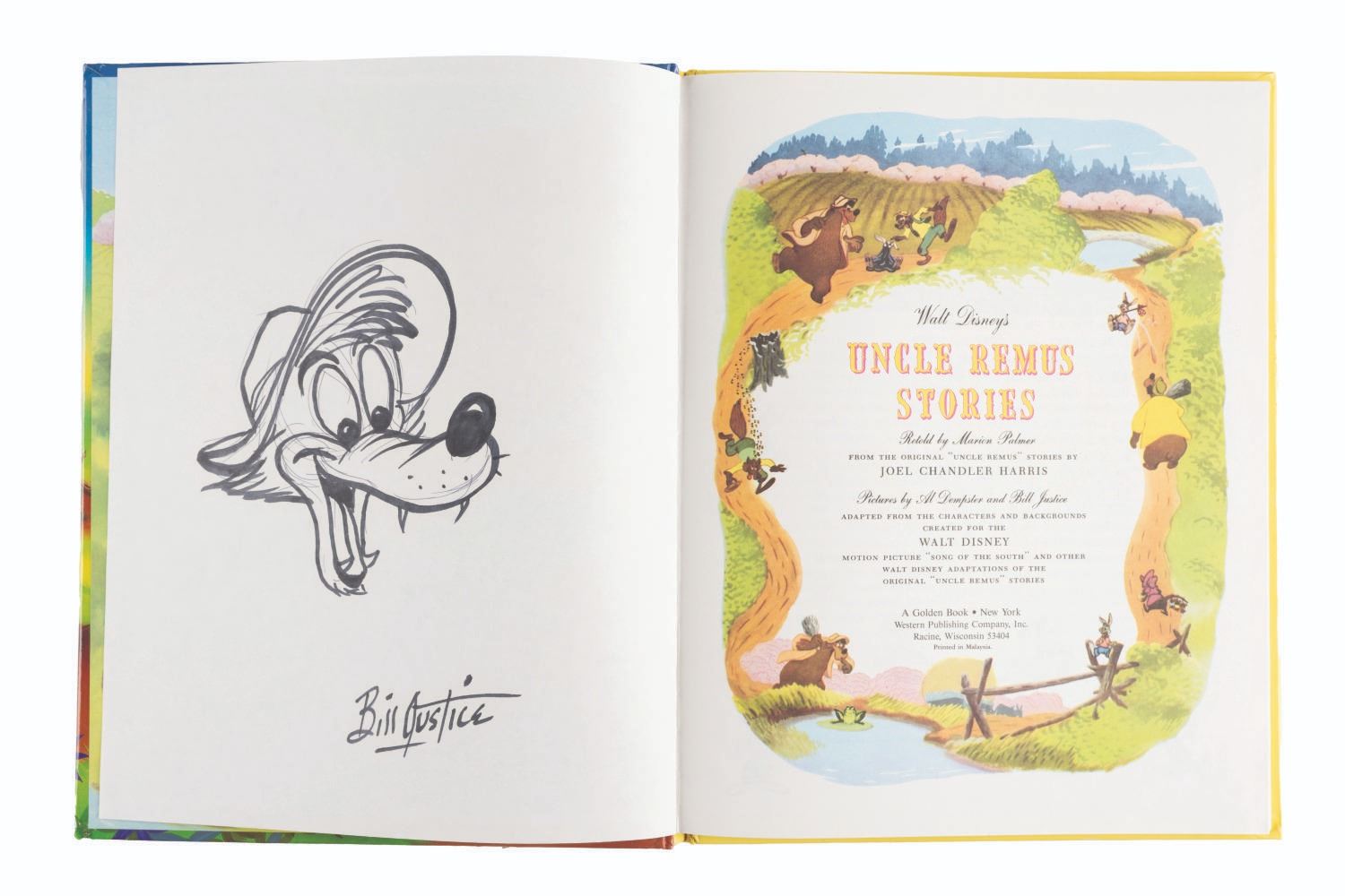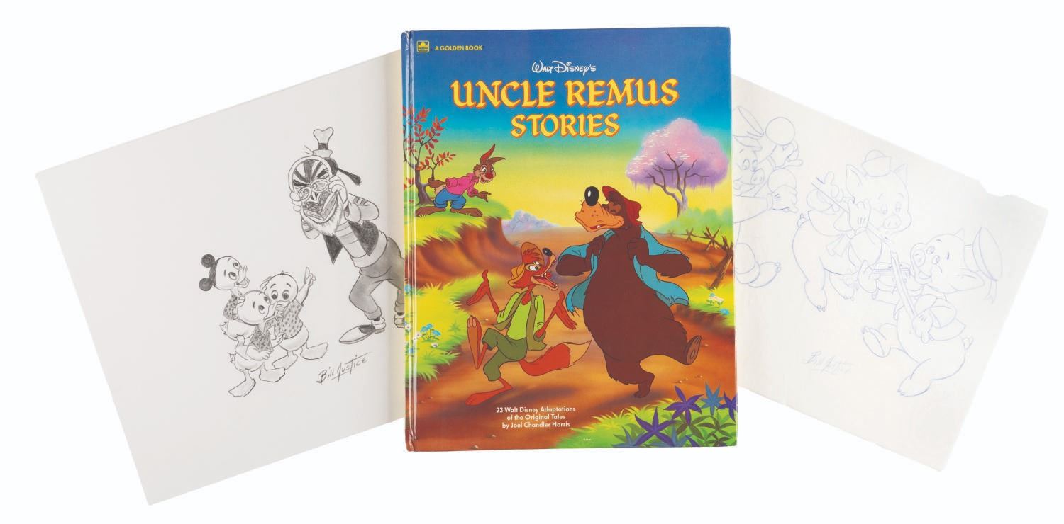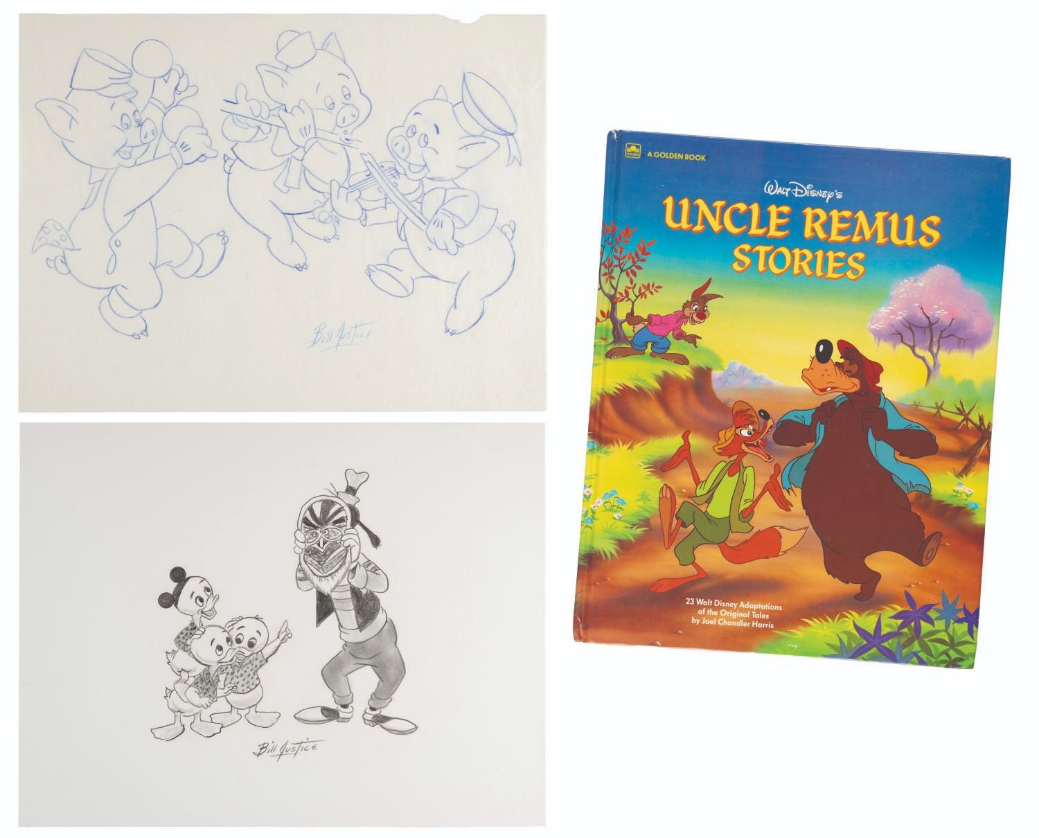(Disney/Justice, 1980s-90s) A signed Uncle Remus Stories Golden Book and a pair of drawings by Disney Legend Bill Justice. Justice signed the 92-page book with a sketch of Br’er Fox on the title page. The colored pencil and graphite drawings feature the Three Little Pigs, Donald’s nephews, and Goofy. The 10.25” x 13” book and the 9” x 12” and 11” x 14” drawings are in good to very good condition with scratches and wear on the book’s cover, light creases, and 1” of paper loss on the top border of the Pigs drawing.