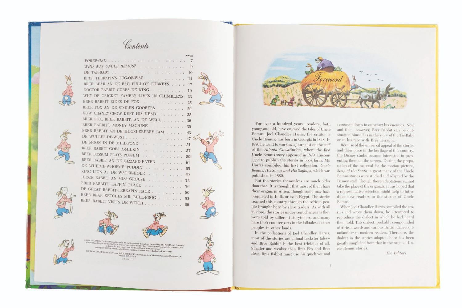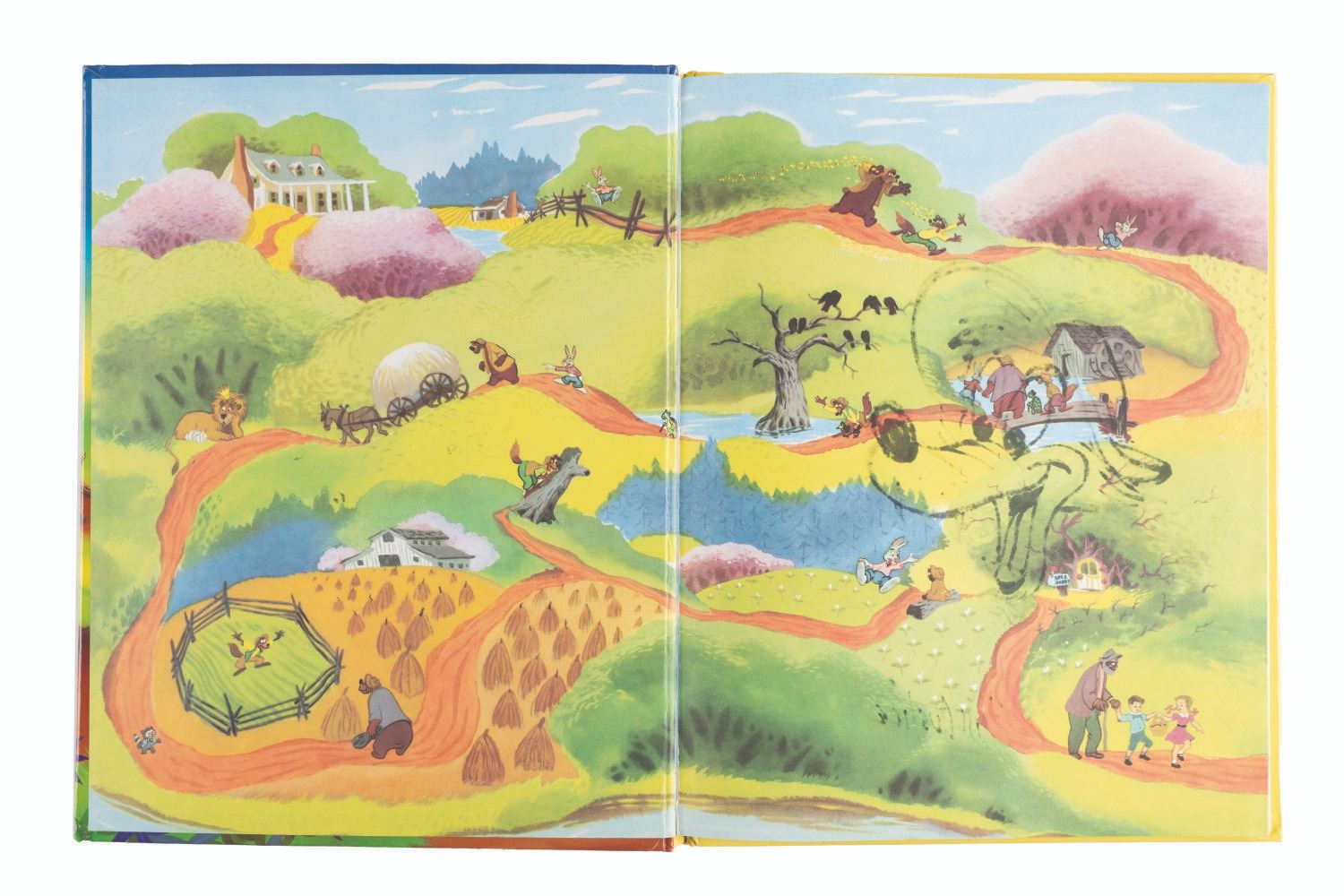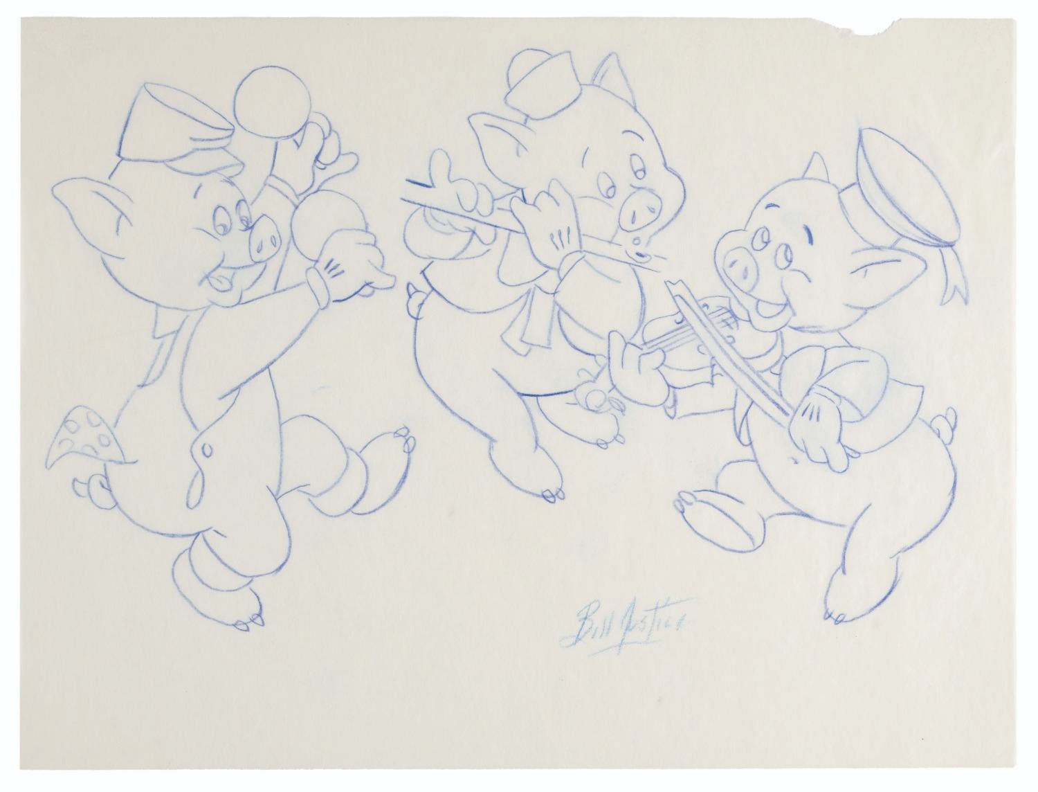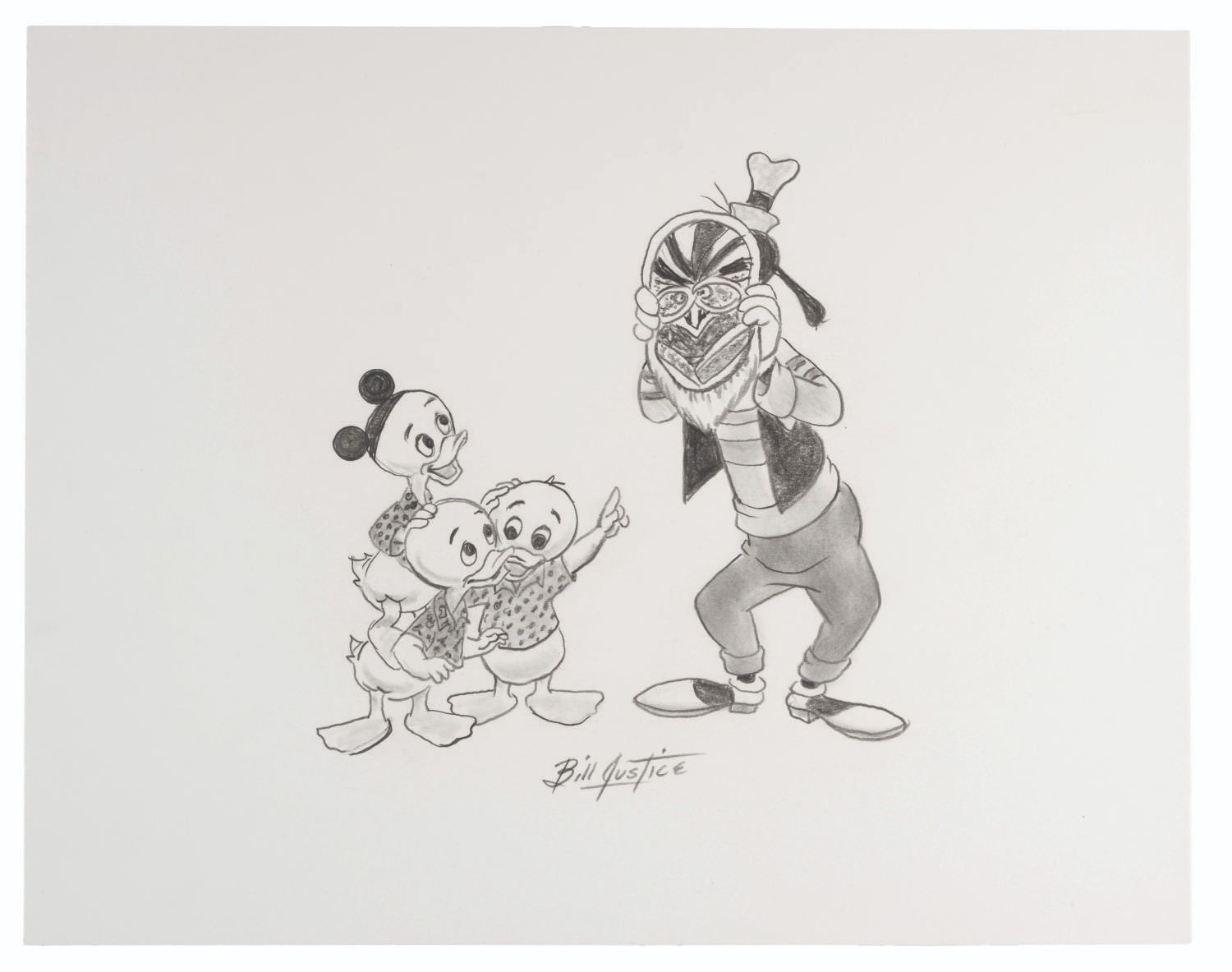 (Disney/Justice, 1980s-90s) A signed Uncle Remus Stories Golden Book and a pair of drawings by Disney Legend Bill Justice. Justice signed the 92-page book with a sketch of Br’er Fox on the title page. The colored pencil and graphite drawings feature the Three Little Pigs, Donald’s nephews, and Goofy. The 10.25” x 13” book and the 9” x 12” and 11” x 14” drawings are in good to very good condition with scratches and wear on the book’s cover, light creases, and 1” of paper loss on the top border of the Pigs drawing.