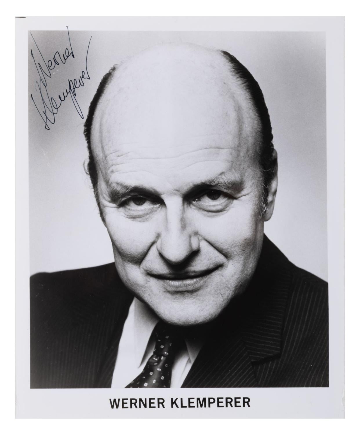 (Werner Klemperer, 1970s-90s) A headshot of Werner Klemperer signed in black ink. Klemperer is known for his role as Colonel Klink in the CBS sitcom "Hogan’s Heroes." Measuring 8" x 10", the photo is in good condition with edge wear and smudging on the reverse.