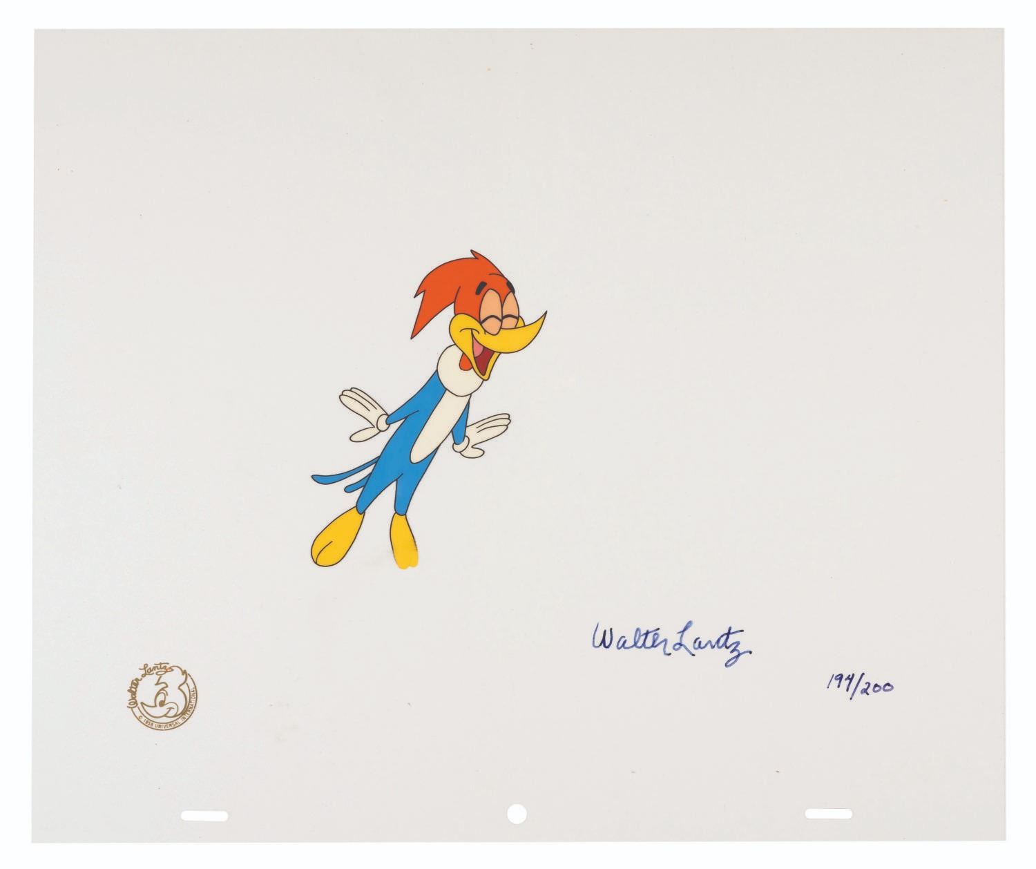 (Lantz, 1980s-90s) A hand-painted limited edition cel of Woody Woodpecker, signed by Walter Lantz and hand-numbered 194 of 200. Measuring 10.5” x 12.5” with a character image size of 4.25” x 3.25”, the cel is in fine condition.