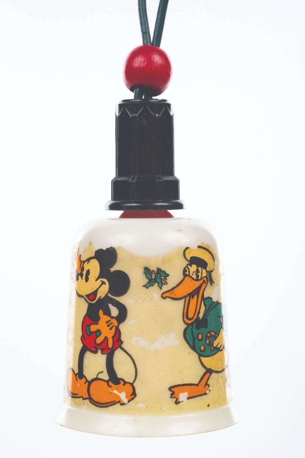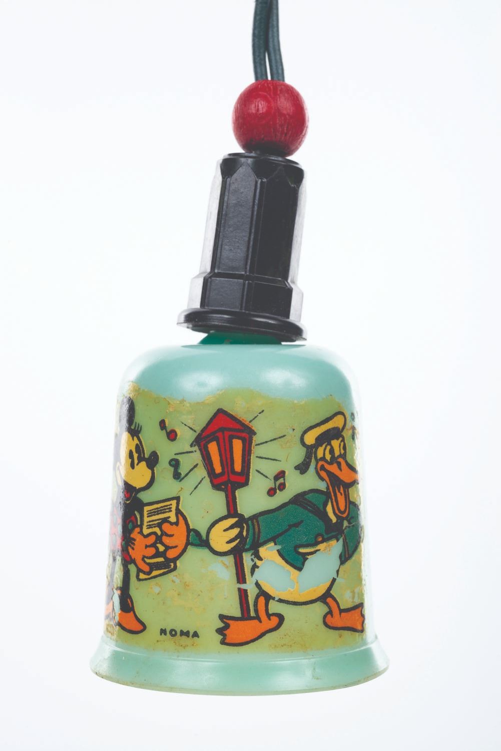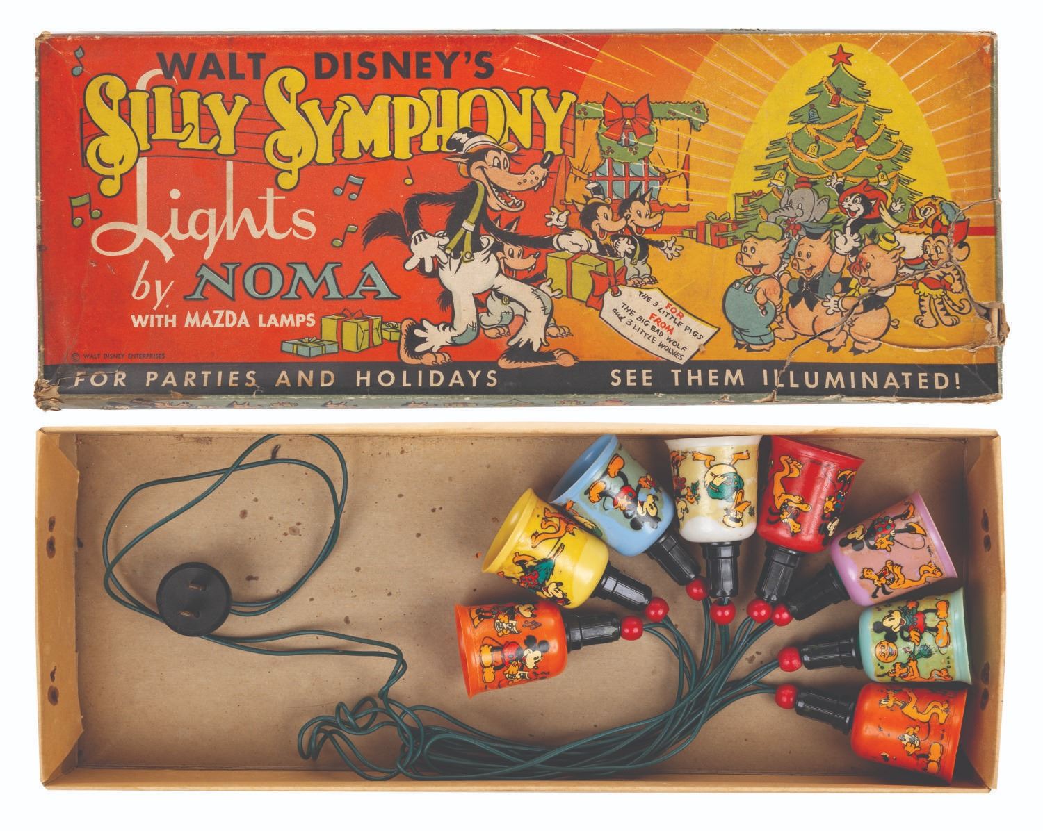 (NOMA, 1930s) A Walt Disney's Silly Symphony Lights box, with a string of Mickey Mouse with Mazda lamps. The eight plastic shades feature Mickey, Minnie, and Pluto. The original box measures 6.25" x 16.5" x 2.25", and is in fair condition with heavy wear to edges a 5" tear to the right side of the front panel, and stains from water exposure on the inside lid. The string of lights displays in good condition, non-functional, with wear and chipping to the lamp decals.