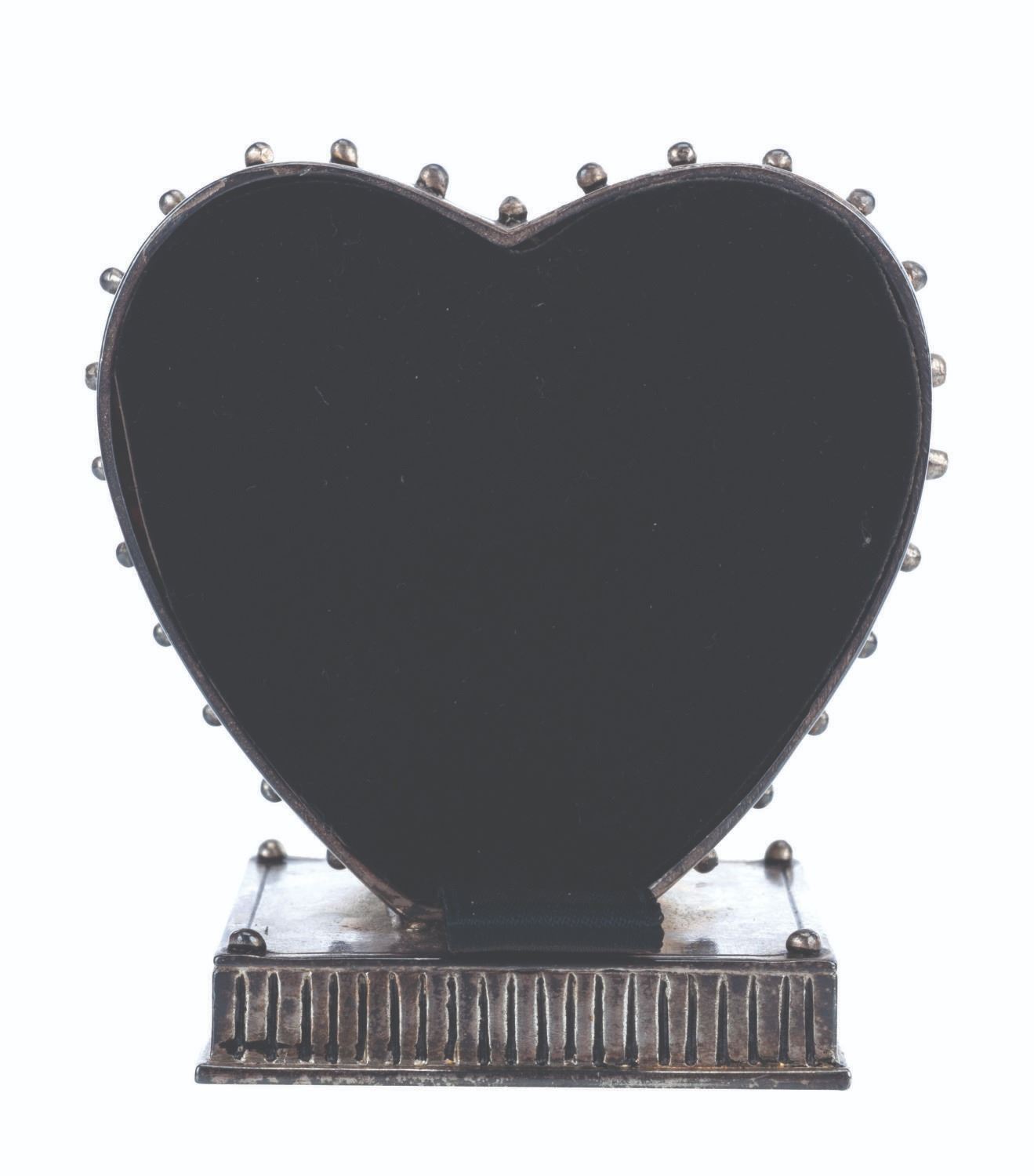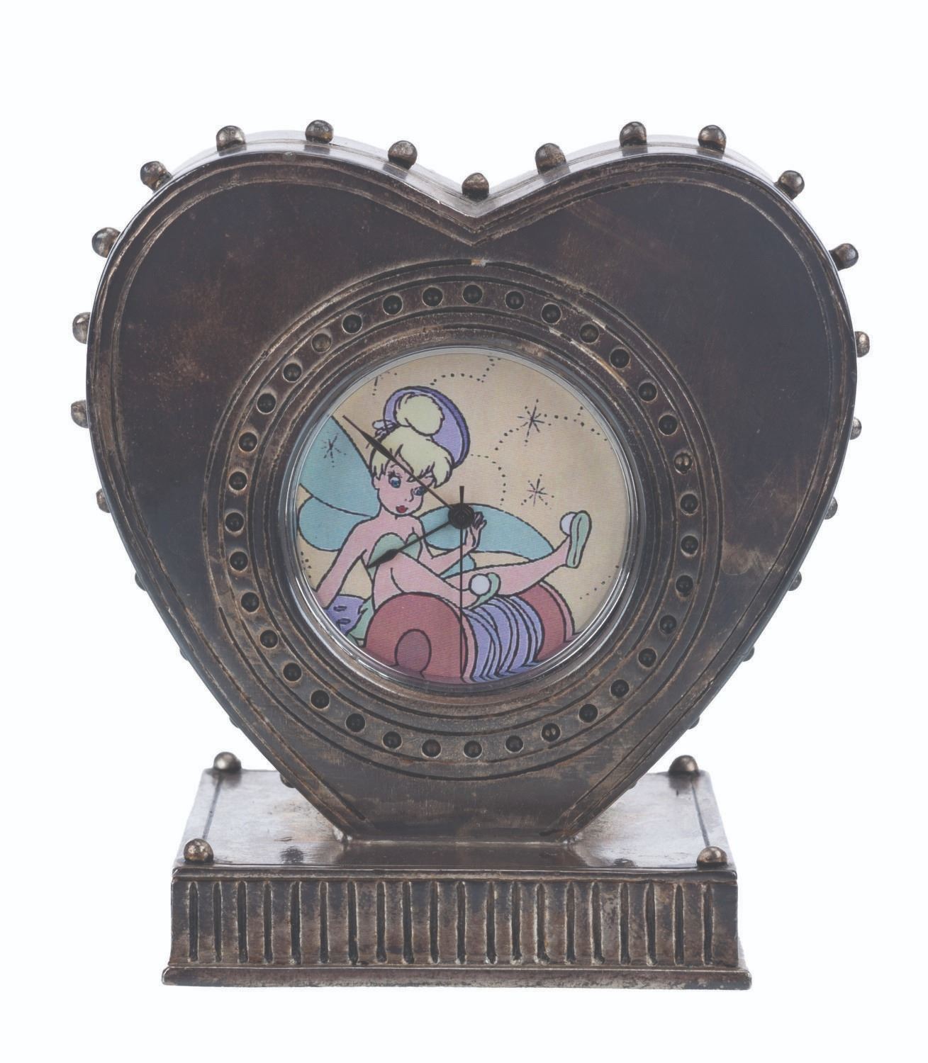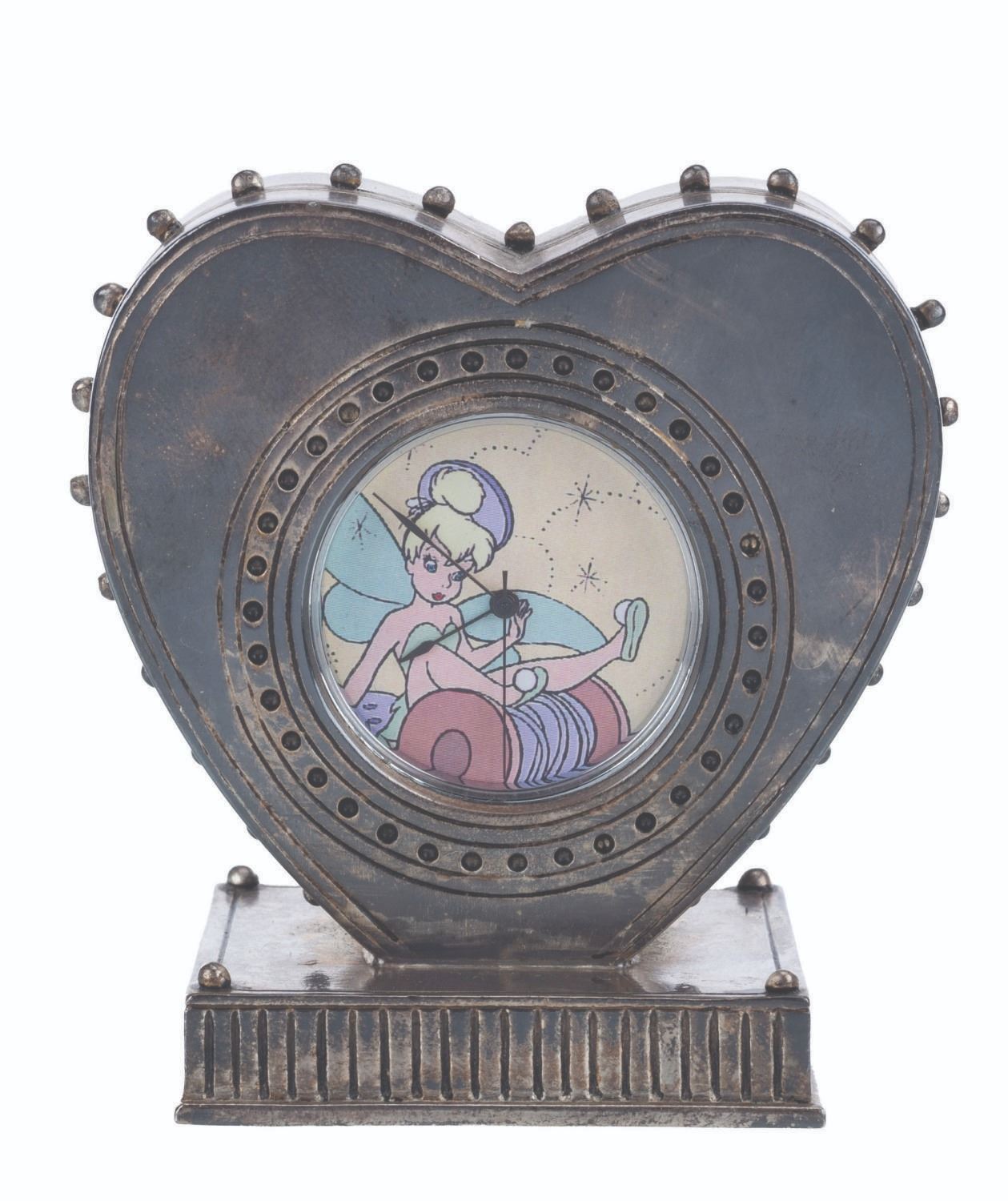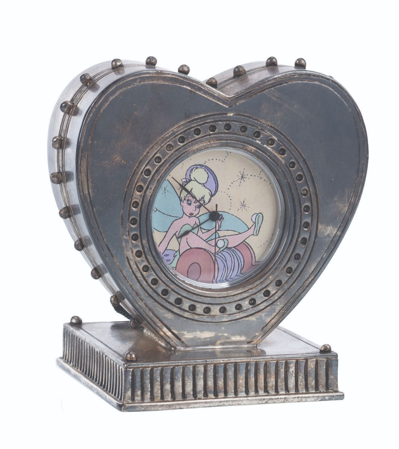 (Disneyland, 1990s) A silver heart-shaped clock by Maximal Art featuring Tinker Bell from "Peter Pan" on the face. When tested, the clock did not work and requires a new battery or service to function. Measuring 2.5" x 2" x 2.75", the clock is in good condition with heavy tarnish and light discoloration to the face from age. The clock was sold at the Walt Disney Gallery and comes with the original box.
