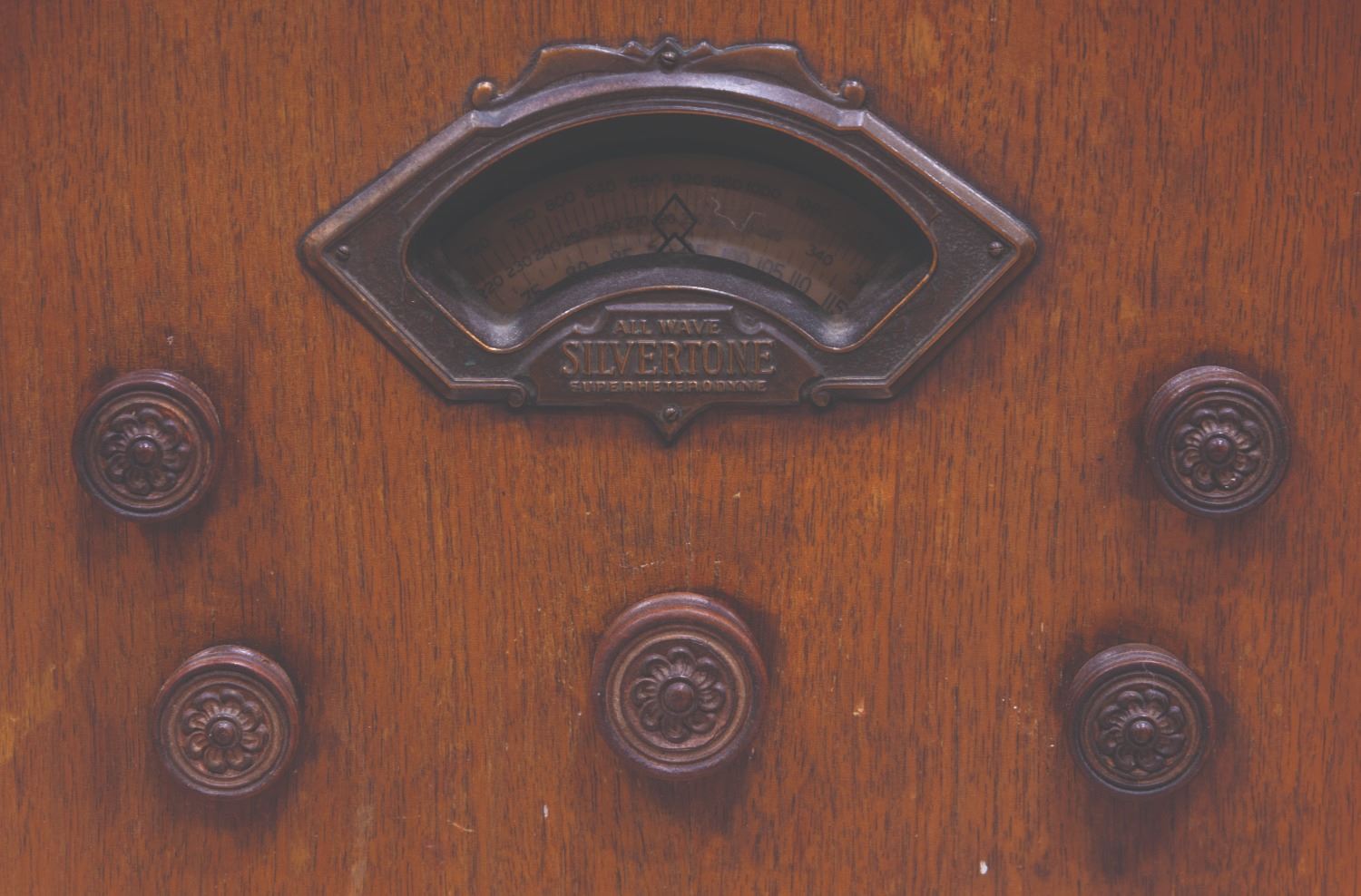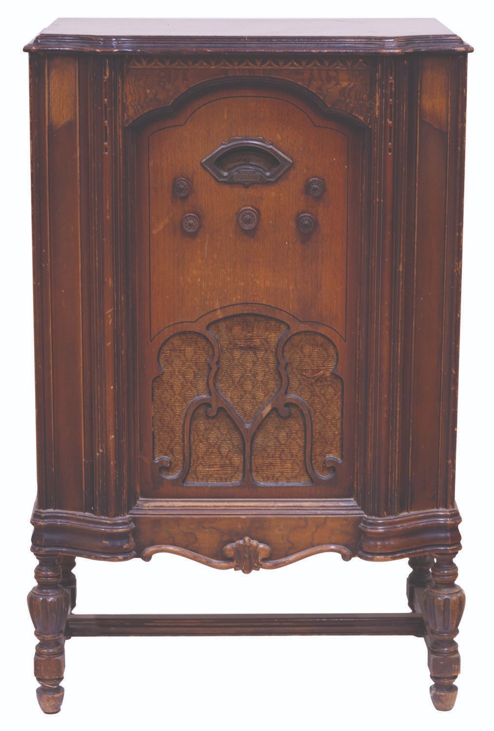 (Sears, Roebuck & Co., 1932-33) A Silvertone lowboy style super-heterodyne 8-tube battery radio, model 1575. The pinnacle of home entertainment at the time, this radio originally carried the hefty price tag of $60, or $1350 in today’s money. With both long and short wave reception, the entire family could gather in the living room for shows broadcast from fledgling national networks such as NBC and CBS, or listen in on local police calls. The battery-powered radio retains its original amplifier with a newer smaller one installed with a 0.25” TS audio jack, allowing the radio to function as a decorative speaker. The new amplifier is in need of a new plug and has not been tested. The body is crafted with a walnut finish, walnut veneer front panel, and Tamo wood overlays across top and bottom rail. The radio needs servicing to function. Measuring 25.25” x 14” x 40.5” tall, the radio displays in good condition with scratches, chips to the finish, and a tear to the grill cloth. Due to size and weight, special shipping arrangements are required. Please inquire before bidding.
