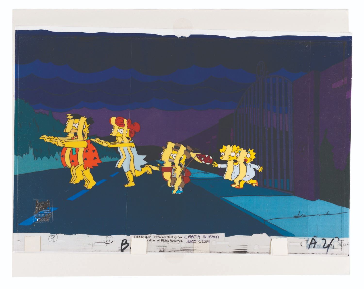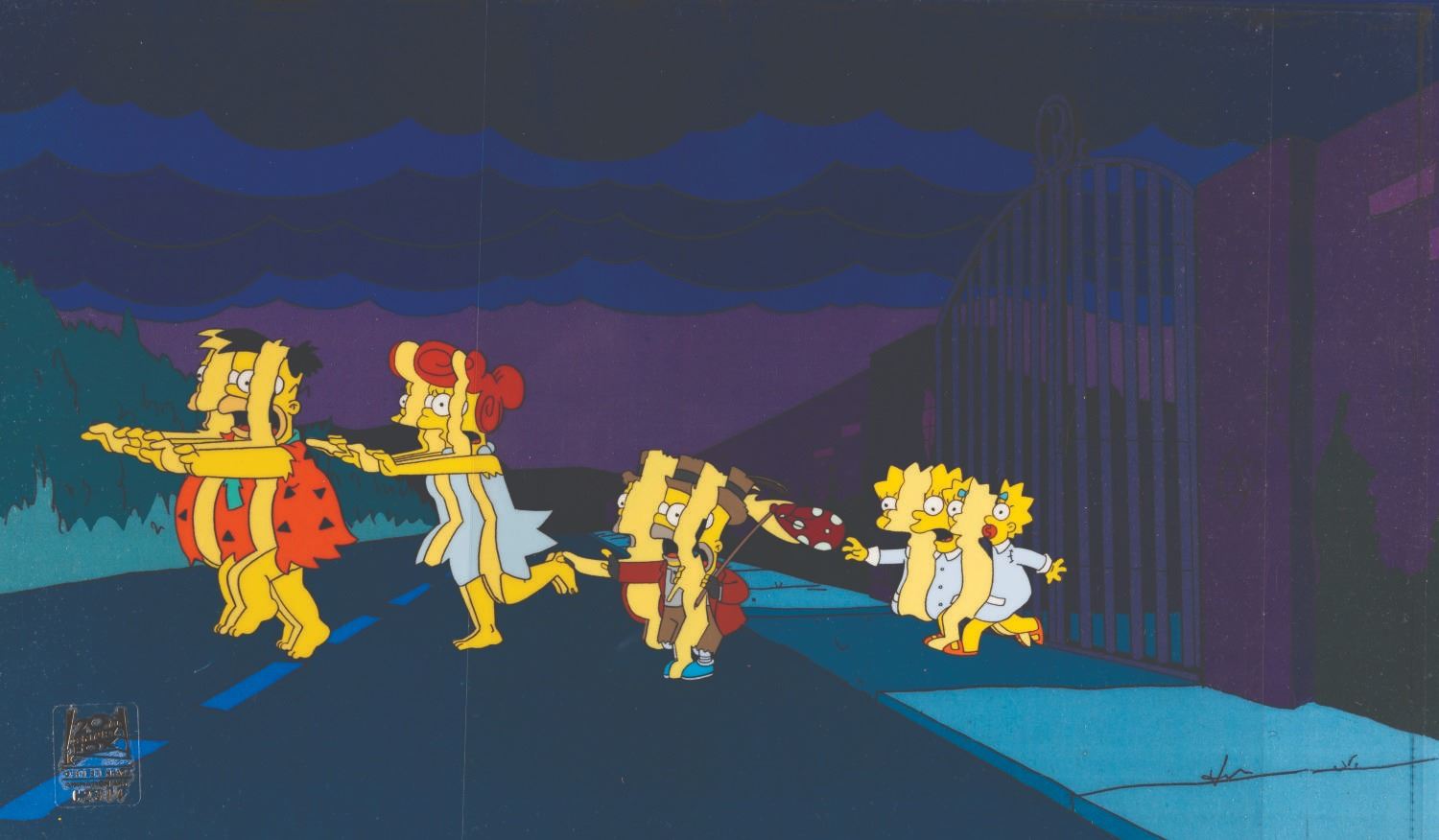 (Fox, 2001) A multi-layer cel of the Simpsons from the opening sequence of “Treehouse of Horror XII” with a scene-matching color copy background. In costumes, the Simpsons family is cut into slices running through Mr. Burns’s gates. With a character image size of 3.75” x 11” on a 10.5” x 16.5” cel, the piece displays in very good condition with light wear from production use.