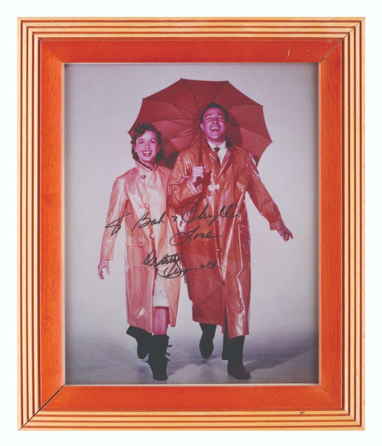 (MGM, 1952) A photo of Debbie Reynolds and Gene Kelly in "Singin’ in the Rain,” signed by Reynolds with a dedication in black marker. Measuring 8” x 10” in a 10.5” x 12.5” frame, the photo is in very good condition with light wear and fading on the signature.
