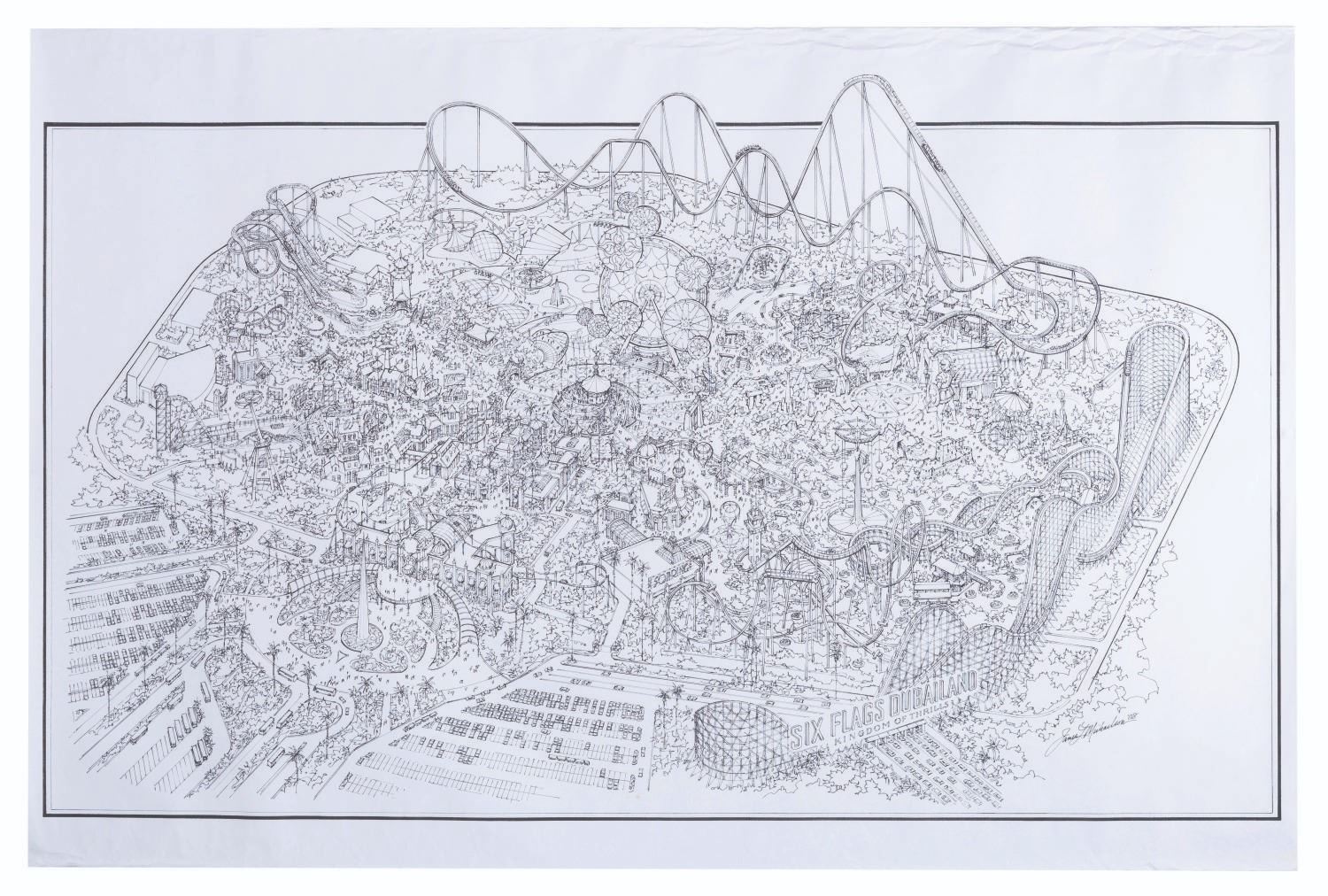 (Six Flags, 2008) A print of the map concept for the cancelled Six Flags Dubailand. The map was designed by former Imagineer James L. Michelson, who had illustrated posters for Jefferson Airplane, Buffalo Springfield, and The Monkees. Measuring 36” x 54.25”, the print displays in good condition with wear and heavy creasing to the edges and a 0.5” tear on the lower right edge, none of which affect the image.