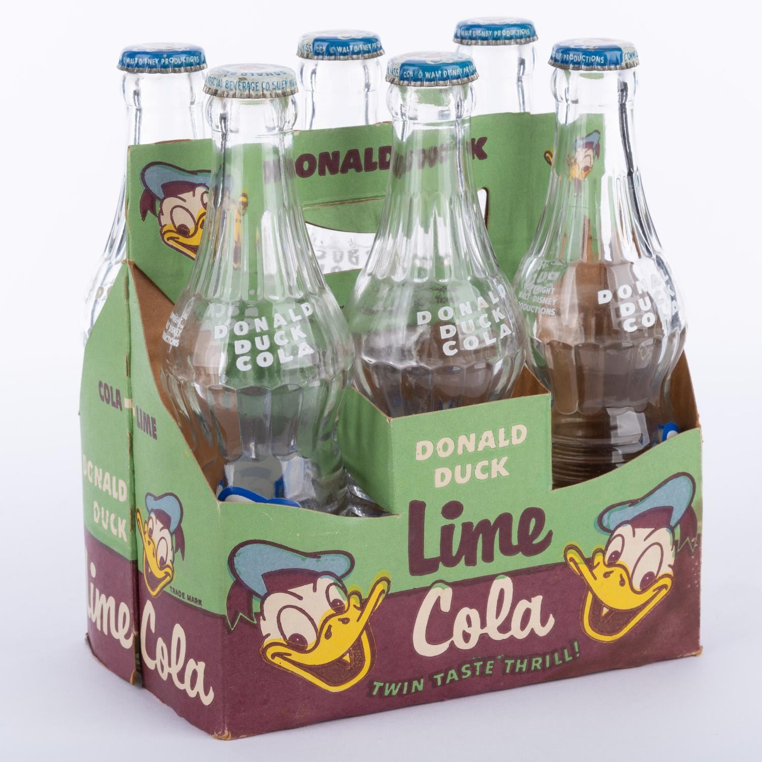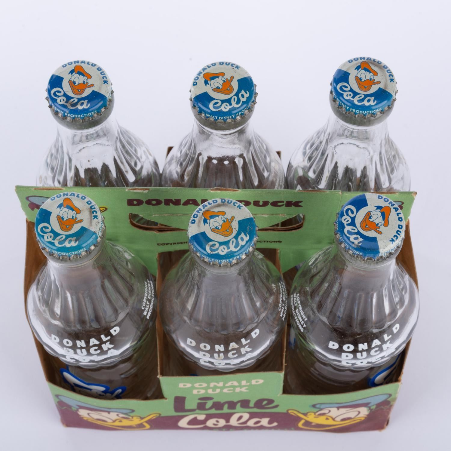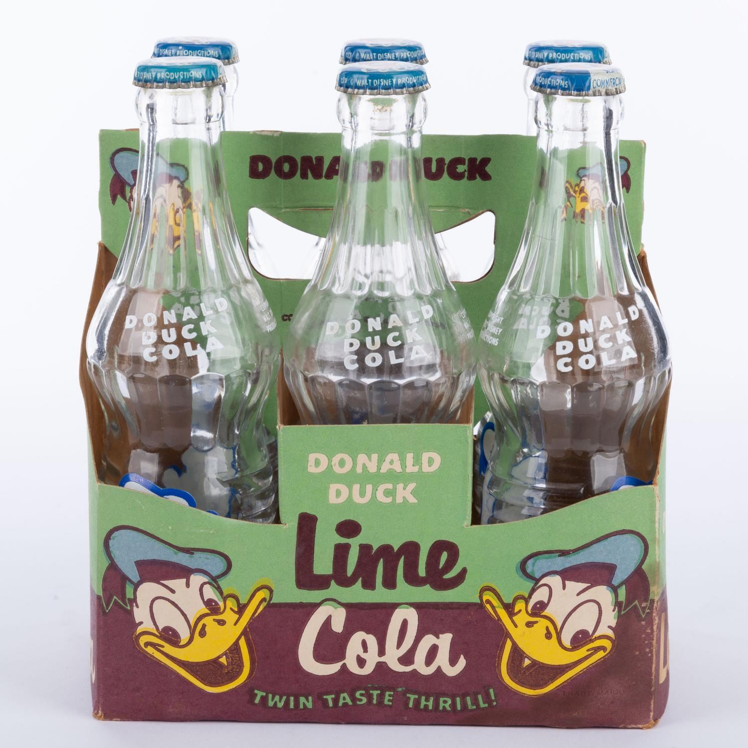 (General Beverages, 1953) An early set of six glass Donald Duck brand Lime Cola bottles in their original cardboard carrier. Featuring adorable illustrations of the feisty Donald Duck on each side of the carrier and glass bottles, the soda was introduced in 1952 in several different flavors. Measuring in total 7" x 4.5" and 8" tall, the bottles are in very good condition with surface wear and scratches from age and handling. All bottles retain their original metal tops which show slight discoloration and fading. The cardboard carrier is in good condition with minor wear and tear around the edges, some age related discoloration, and a stain on the bottom.
