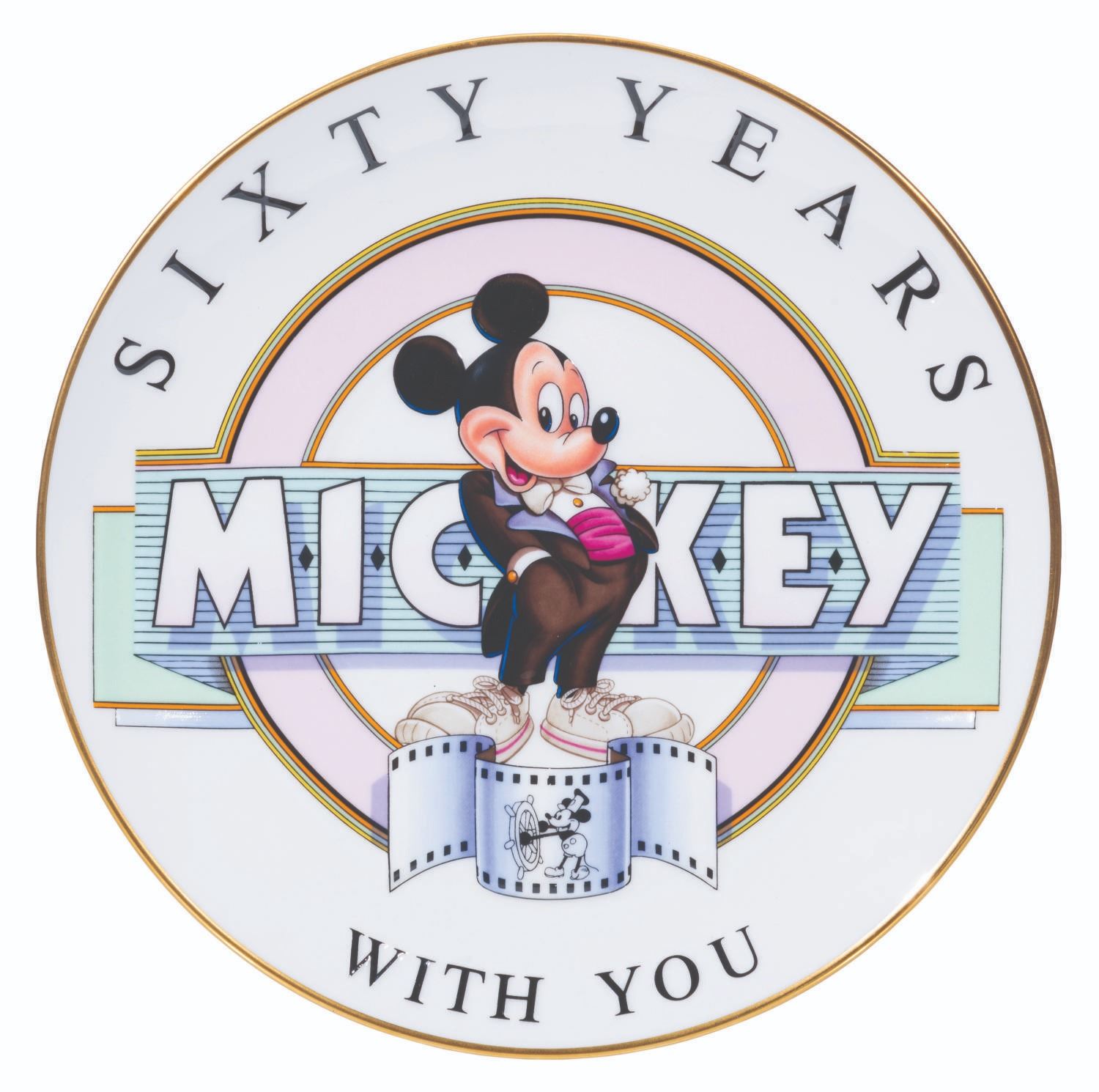 (Disney, 1988) A "Sixty Years With You" decorative plate with a relief image of Mickey Mouse. Measuring 7.5" in diameter, the limited edition plate numbered 2874/15000, is in very good to fine condition with light wear.