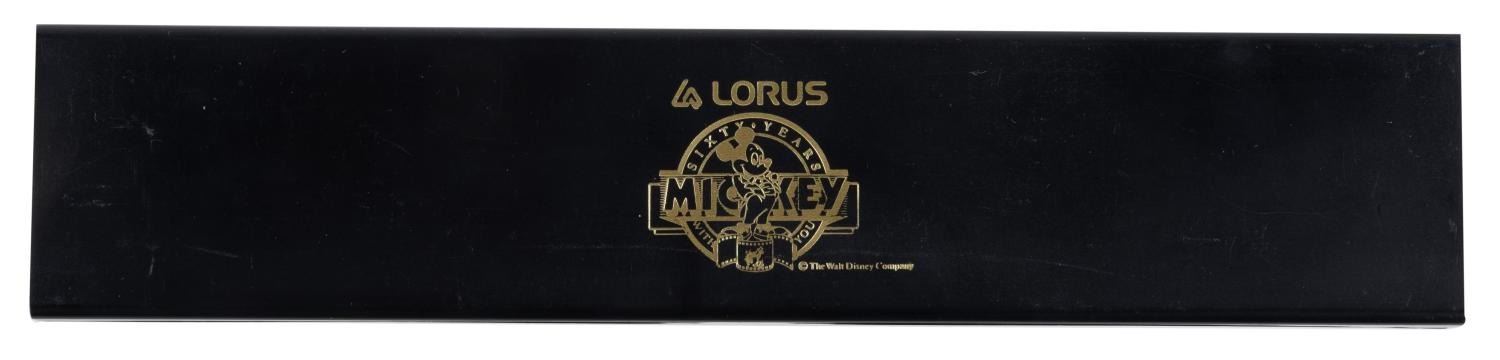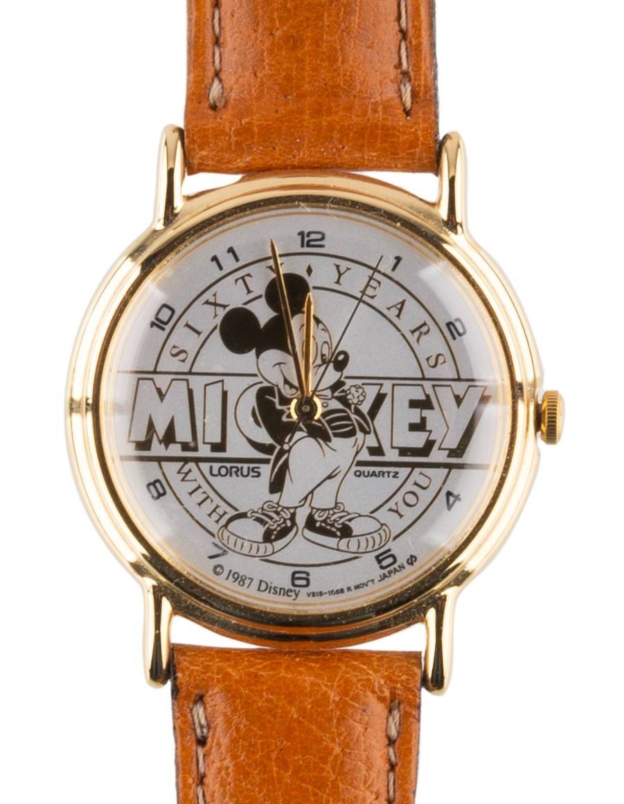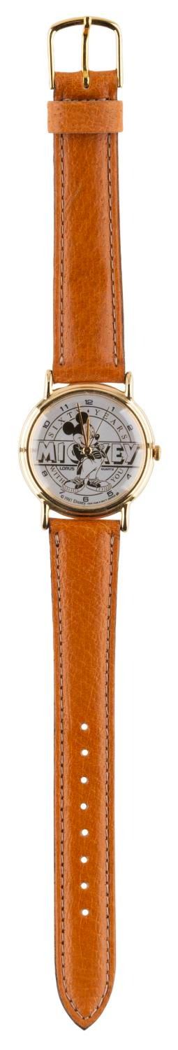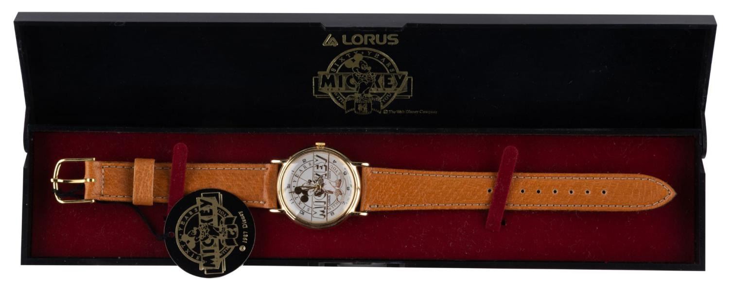 (Lorus, 1988) A wristwatch commemorating Mickey Mouse's 60th birthday. The watch with leather straps includes the original box, tags, and instruction book. Operating with an unknown battery, the watch is being sold as untested and may require service to function. Measuring 8.75" in length with the 9.75" x 2" box, the watch is in fine condition.
