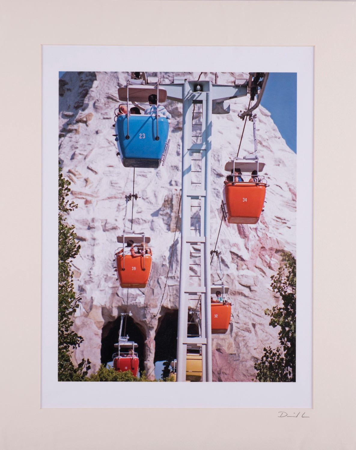 (Disneyland, 1980s) A large photo of the Guests aboard the Skyway Through Glacier Grotto, photographed by David Lee. The piece has an image of 10.5"x13.75" within a 16"x20" matte and is in fine condition with few signs of wear.