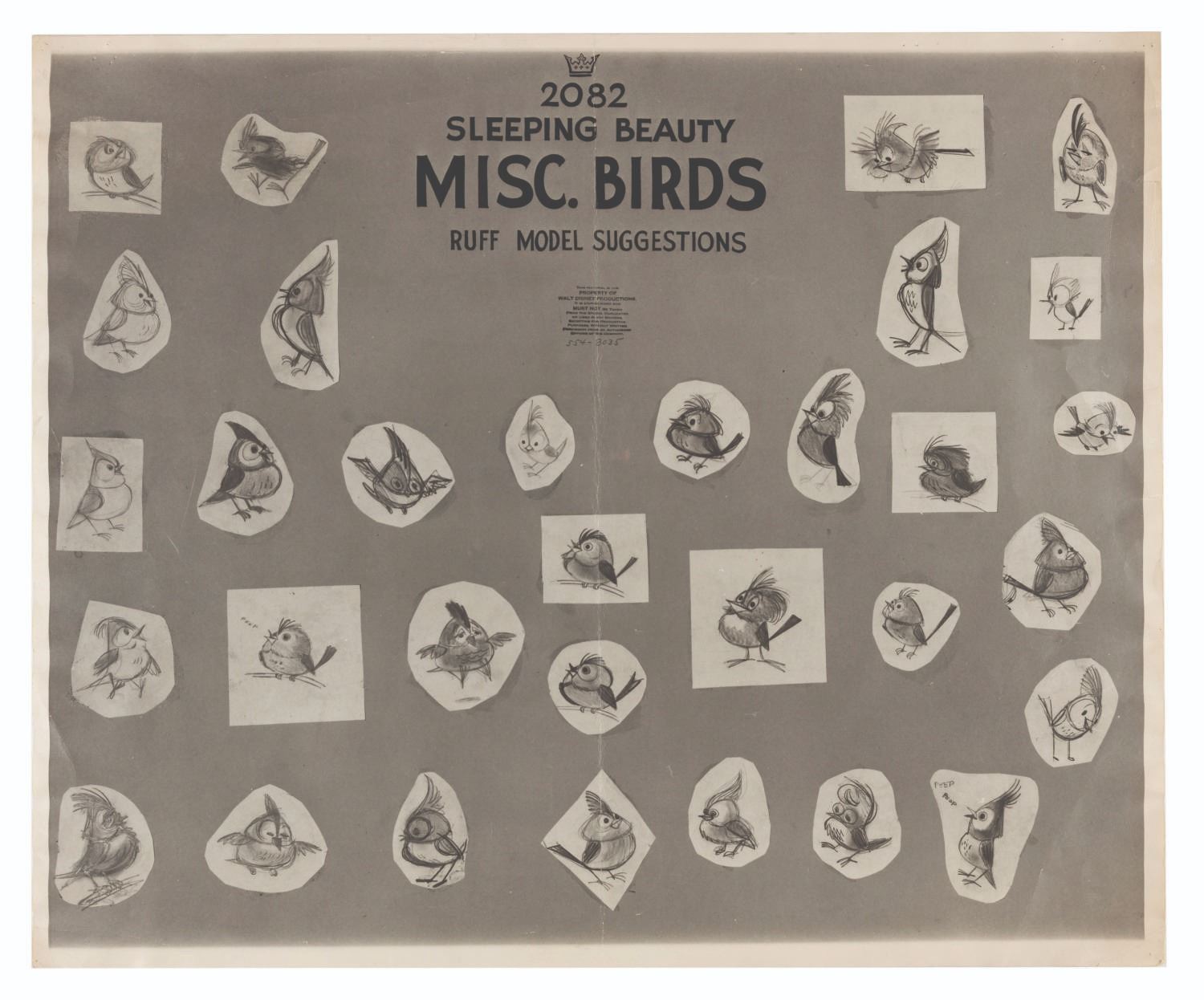 (Disney, 1959) An original photostat model sheet from "Sleeping Beauty” of rough suggestions for Birds. Model sheets such as these were distributed to animators and crew working on the film to ensure character design continuity. Measuring 14” x 17”, the photostat is in good condition with edge wear and tear, warping, a vertical crease running through the center, and light discoloration from age.