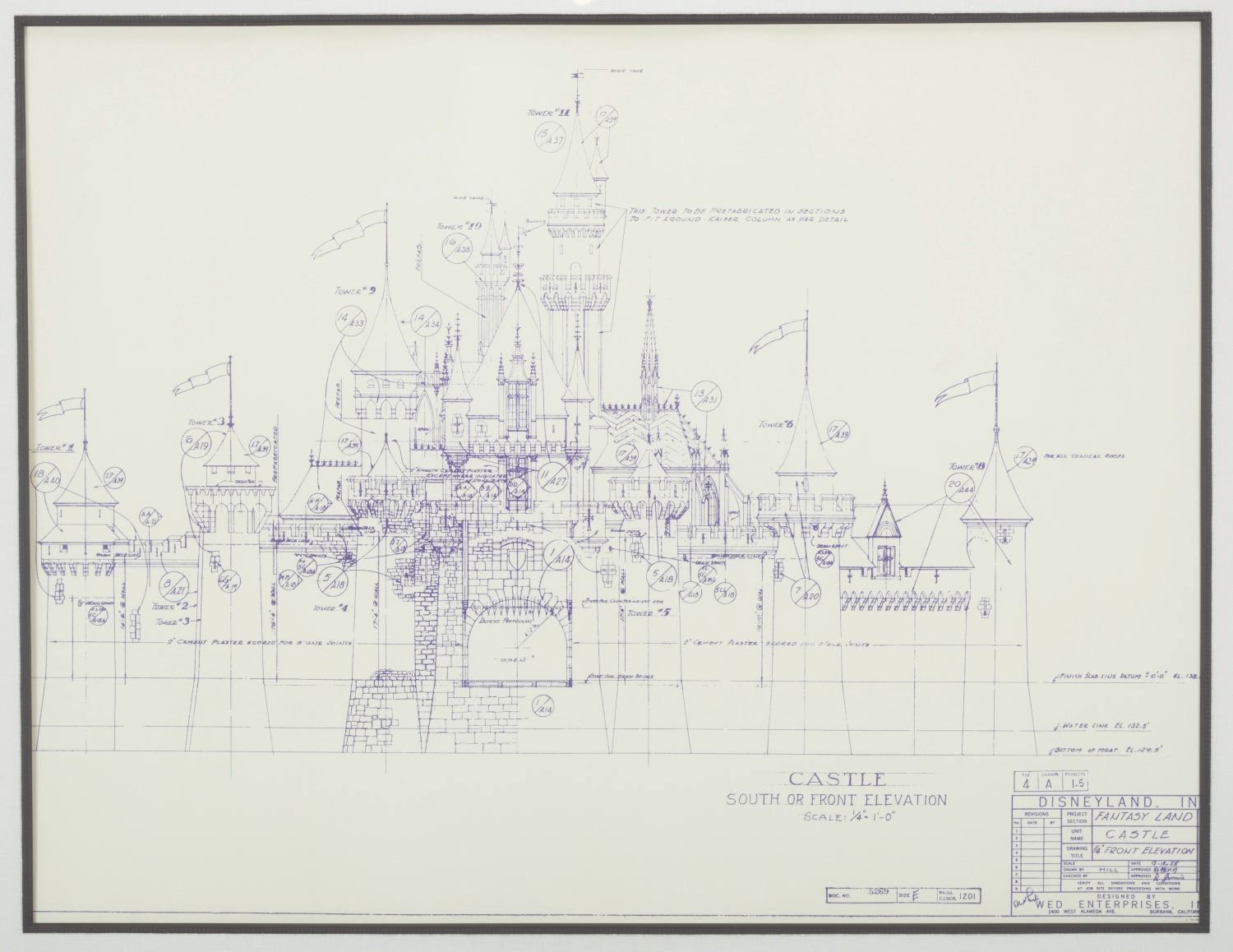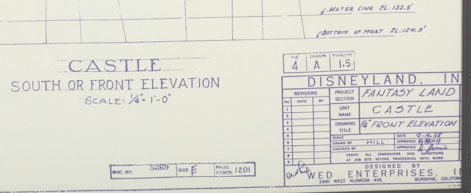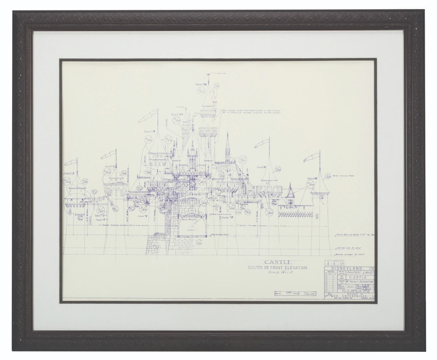 (Disneyland, 2000s) A Disneyland Castle blueprint made on blacklight-sensitive paper that glows under ultraviolet light. Created to demonstrate the effect to Disneyland executives, the print emanates an enchanting blue glow when lit with UV. Mounted in a stunning frame and matte with an image size of 27” x 36” and 39” x 48” overall, the piece is in good condition with light scuffing, paint chipping, and scratching on the frame. This item will require special shipping arrangements. Please inquire before bidding.