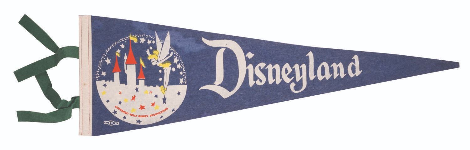 (Disneyland, 1955) A charming early souvenir blue pennant featuring a screen-printed Disneyland text logo with a large image of Tinker Bell flying over Sleeping Beauty Castle. Measuring 8.5” x 26.75”, the souvenir is in good condition with a 5” x 1.5” area of discoloration, .5” of the tip missing, and light wear from age.