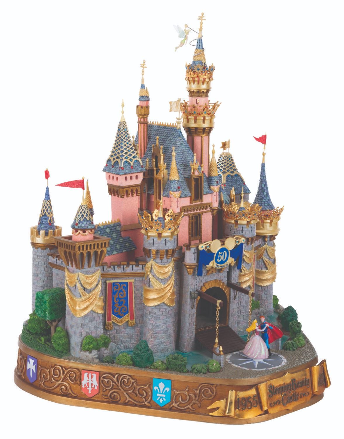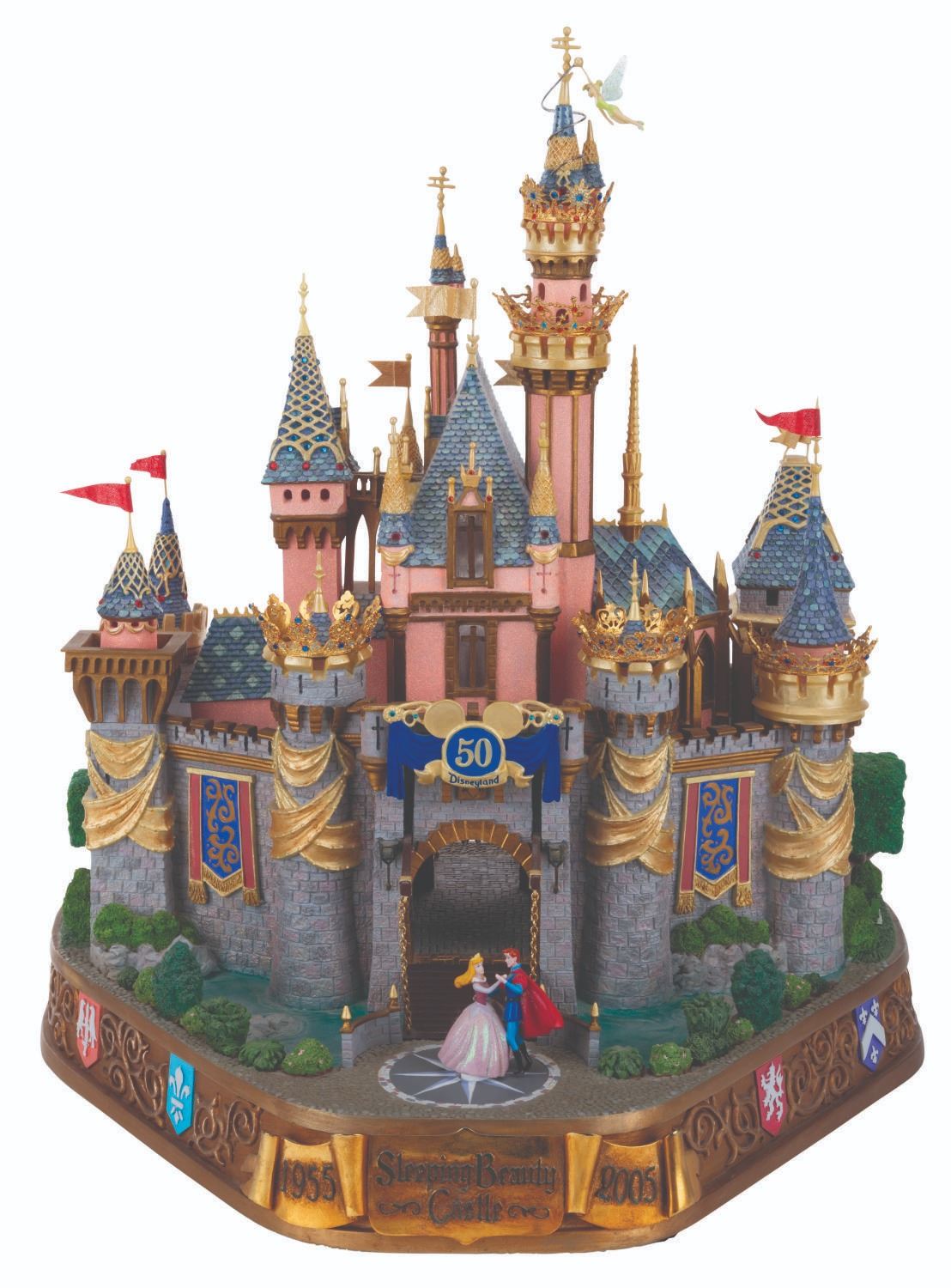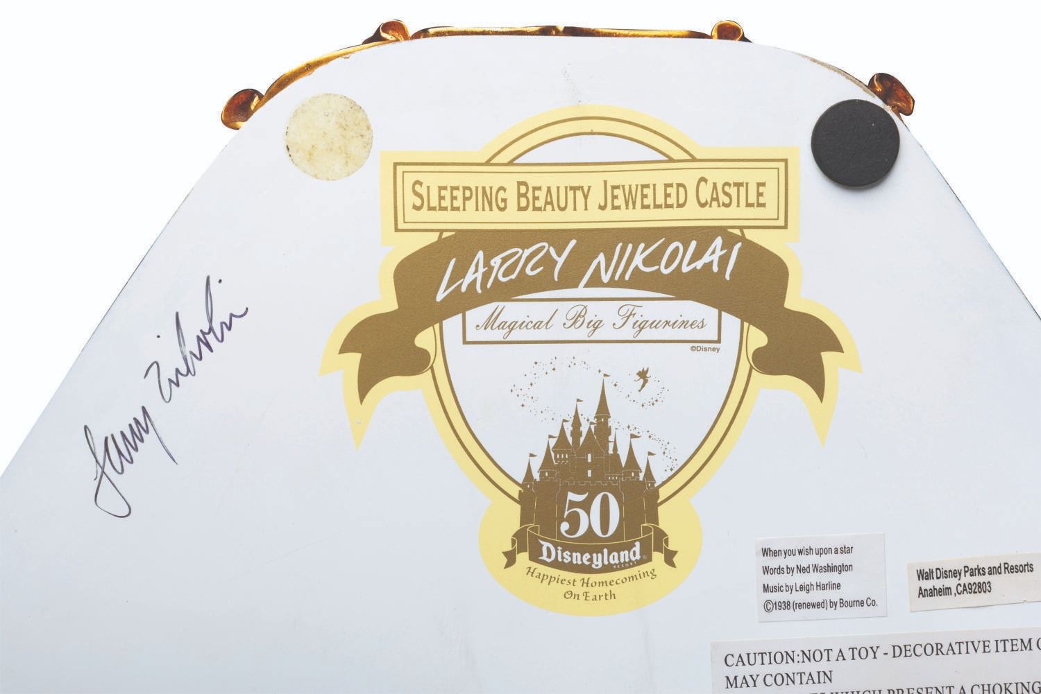 (Disneyland, 2005) A Sleeping Beauty Castle Magical "Big Fig" designed by artist Larry Nikolai for the 50th anniversary of Disneyland. The intricately detailed cast resin figure features the Castle decorated for the Park’s Golden Anniversary with Aurora and Prince Phillip sharing a dance at the entrance. Nikolai signed the bottom of the statue with a black marker. The music feature worked when tested, though the lights did not work. Measuring 15” x 12” x 17” tall, the Big Fig displays in very good condition with visible repair on the spires, the battery compartment loose, and electrical features non-functional due to heavy corrosion.