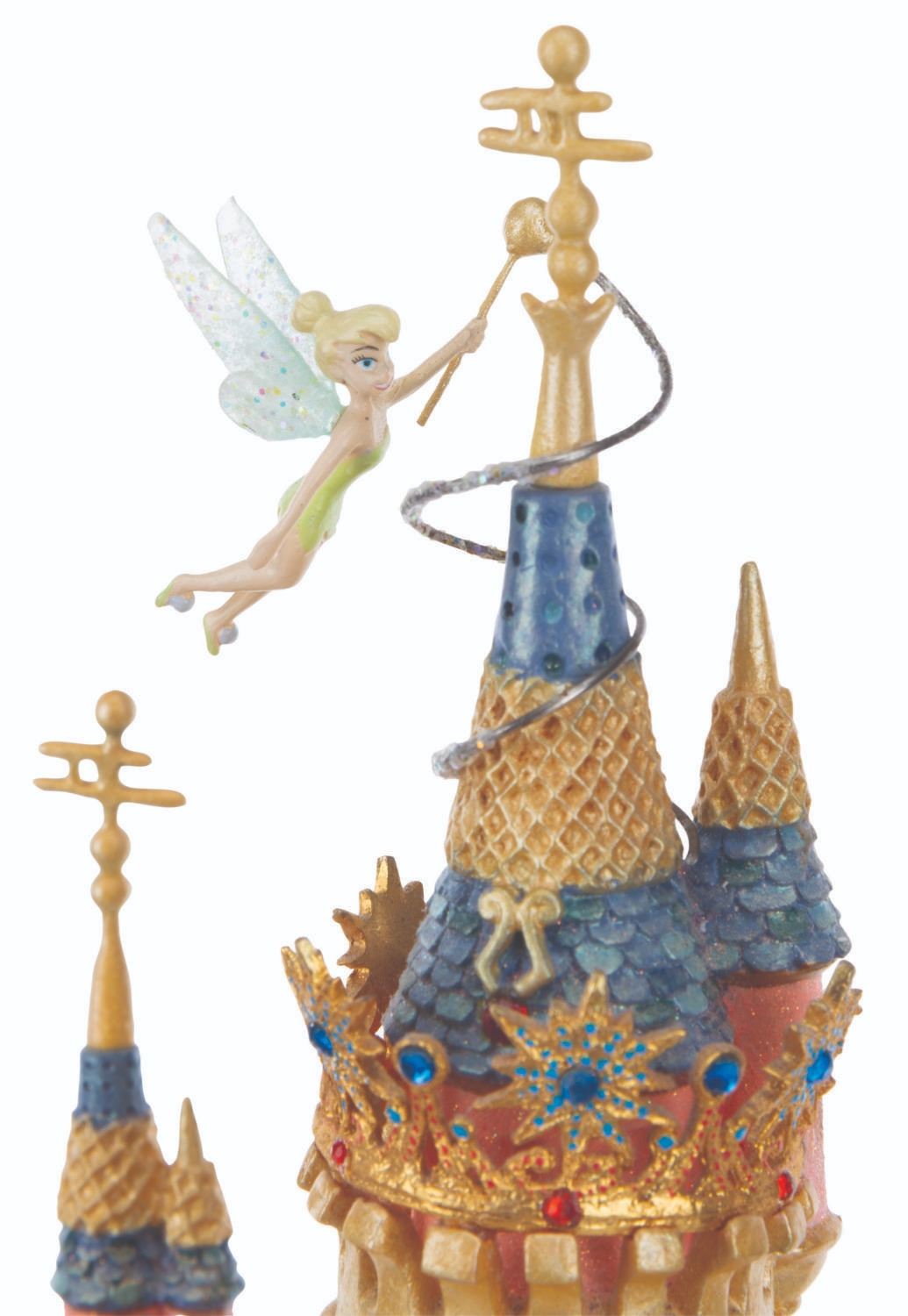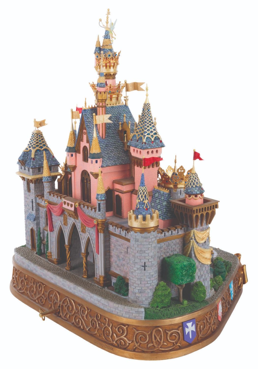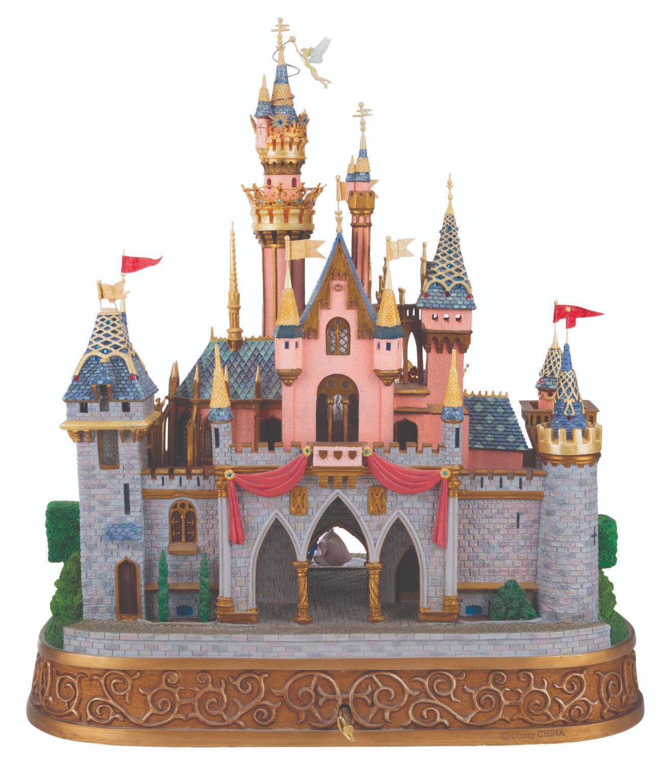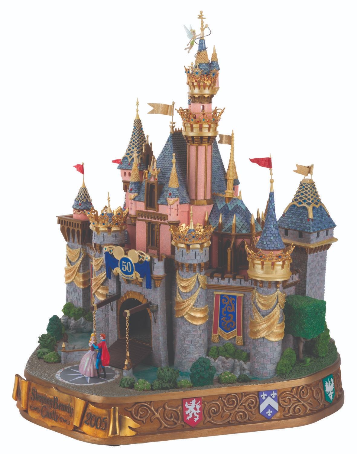 (Disneyland, 2005) A Sleeping Beauty Castle Magical "Big Fig" designed by artist Larry Nikolai for the 50th anniversary of Disneyland. The intricately detailed cast resin figure features the Castle decorated for the Park’s Golden Anniversary with Aurora and Prince Phillip sharing a dance at the entrance. Nikolai signed the bottom of the statue with a black marker. The music feature worked when tested, though the lights did not work. Measuring 15” x 12” x 17” tall, the Big Fig displays in very good condition with visible repair on the spires, the battery compartment loose, and electrical features non-functional due to heavy corrosion.