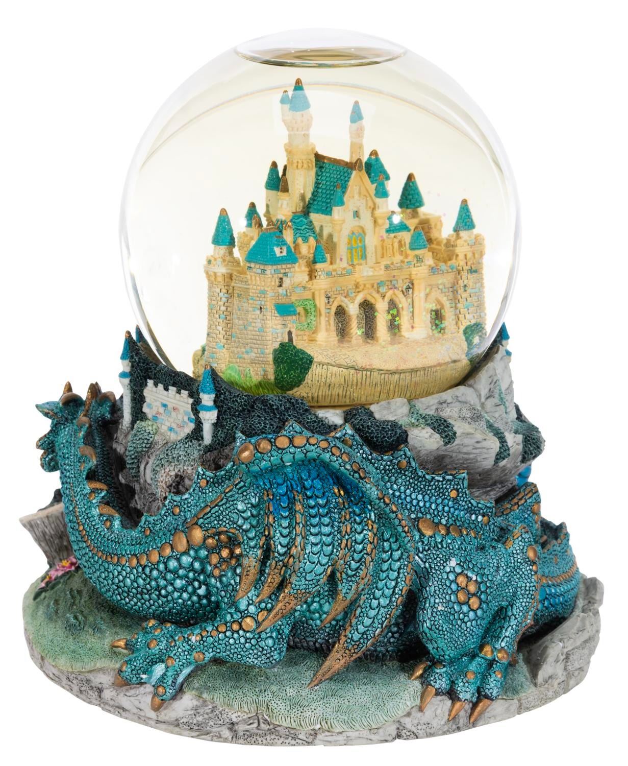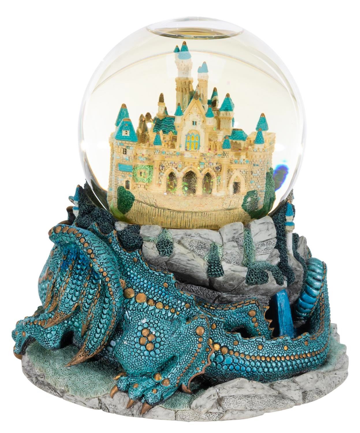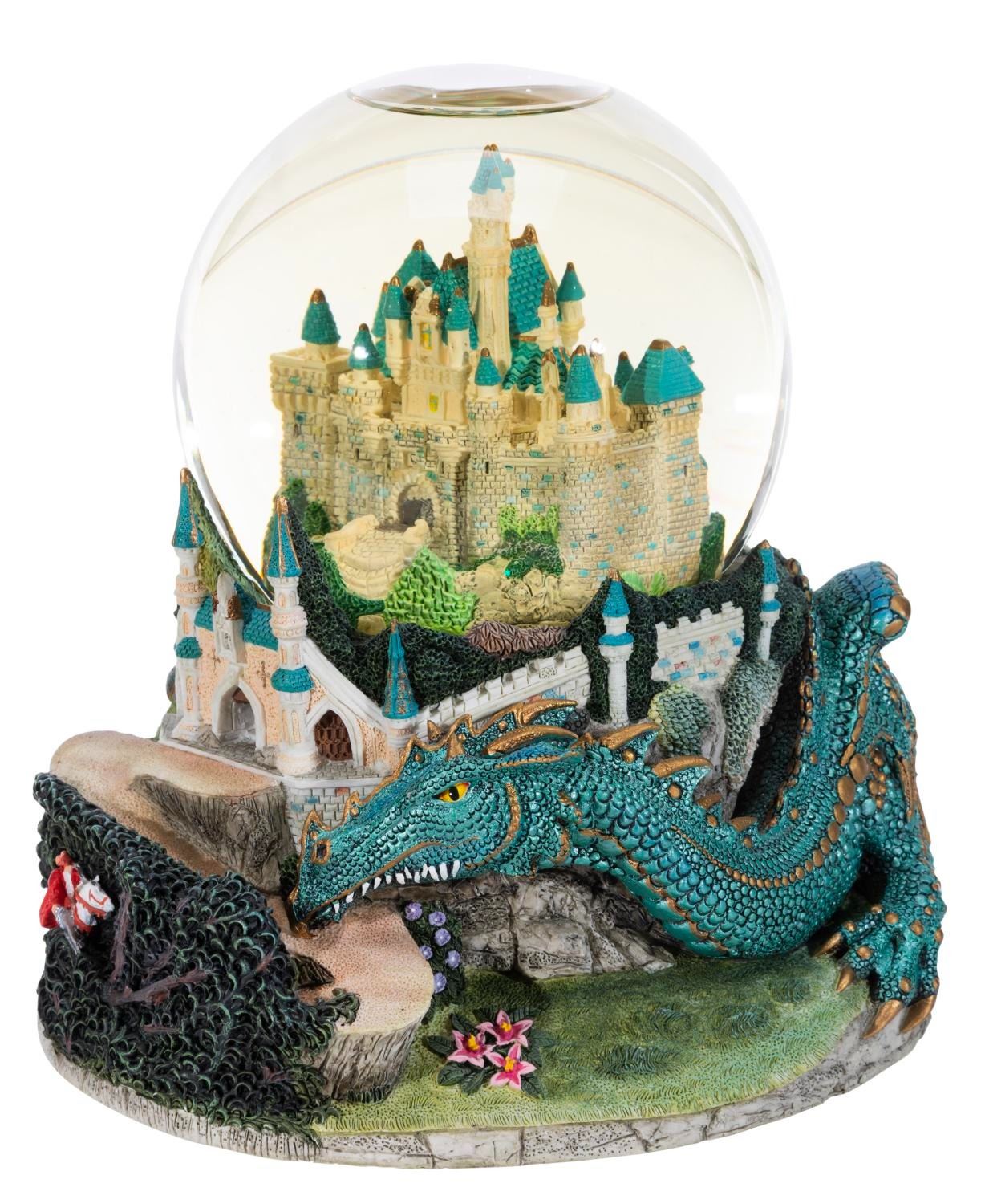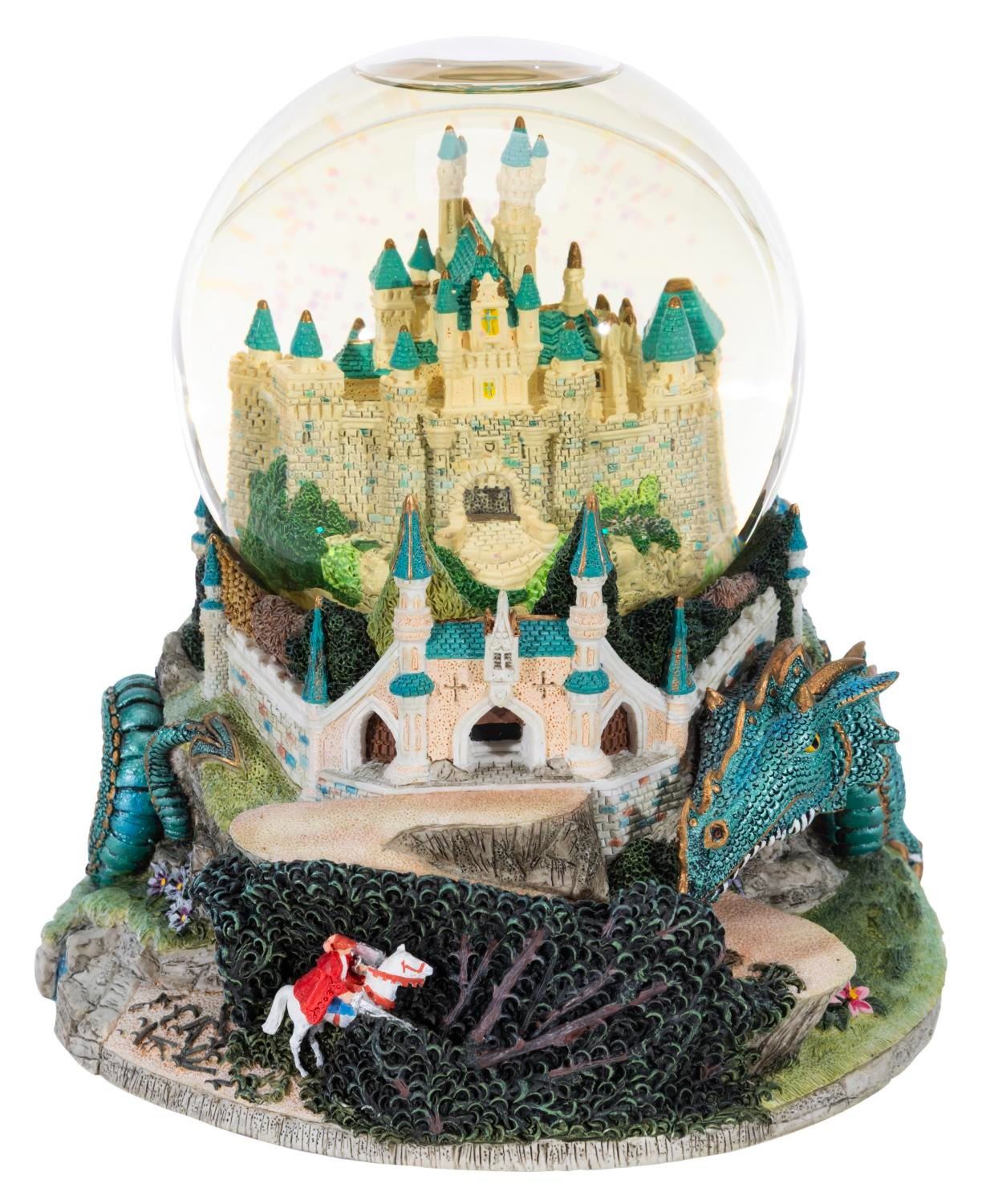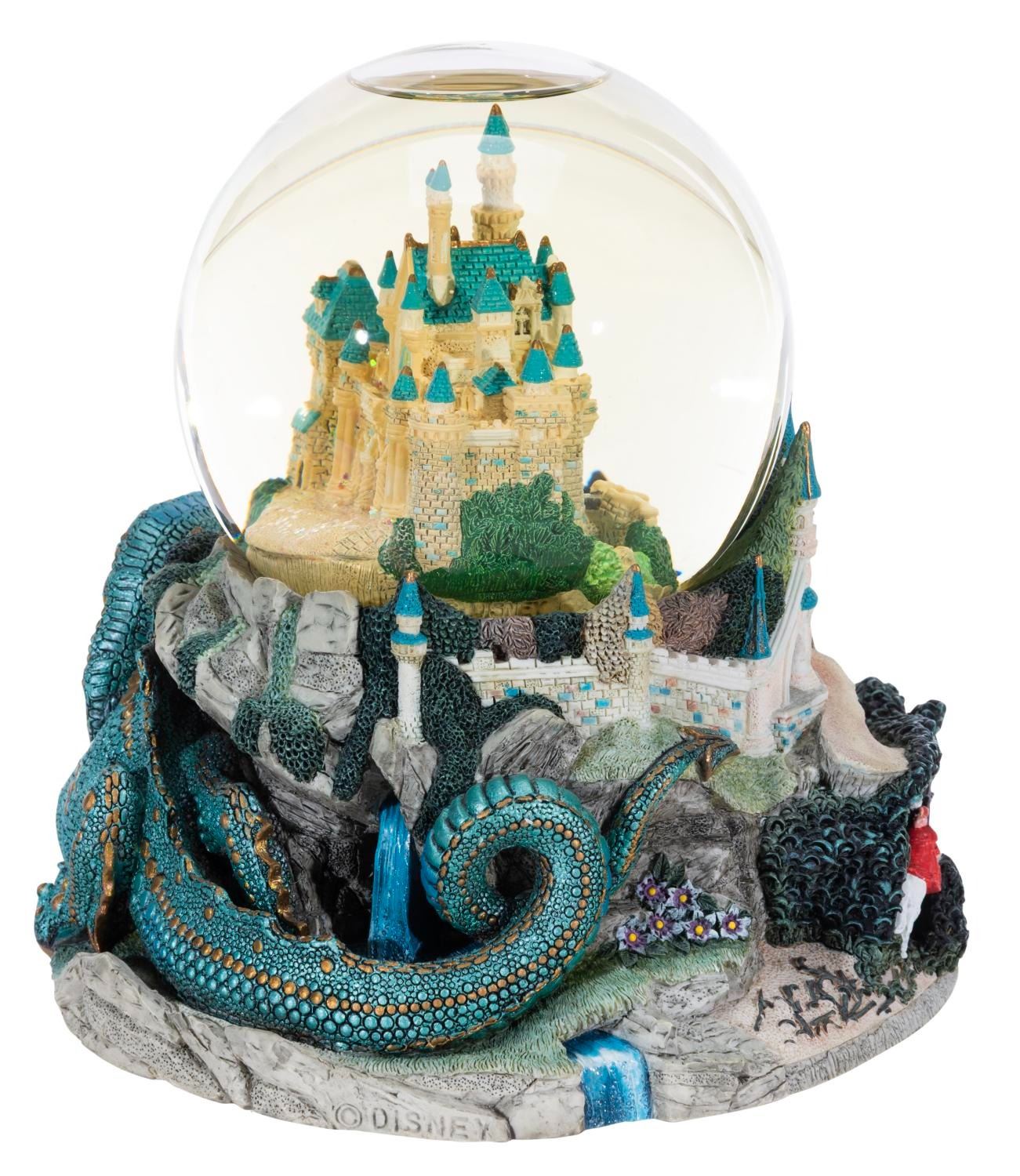 (Fraser International, 1990s-2000s) A Sleeping Beauty Castle snow globe that plays "Once Upon a Dream " when wound. Measuring 7 " in diameter x 7.25 " tall, the snow globe is in very good working condition with slight discoloration to the water from age.