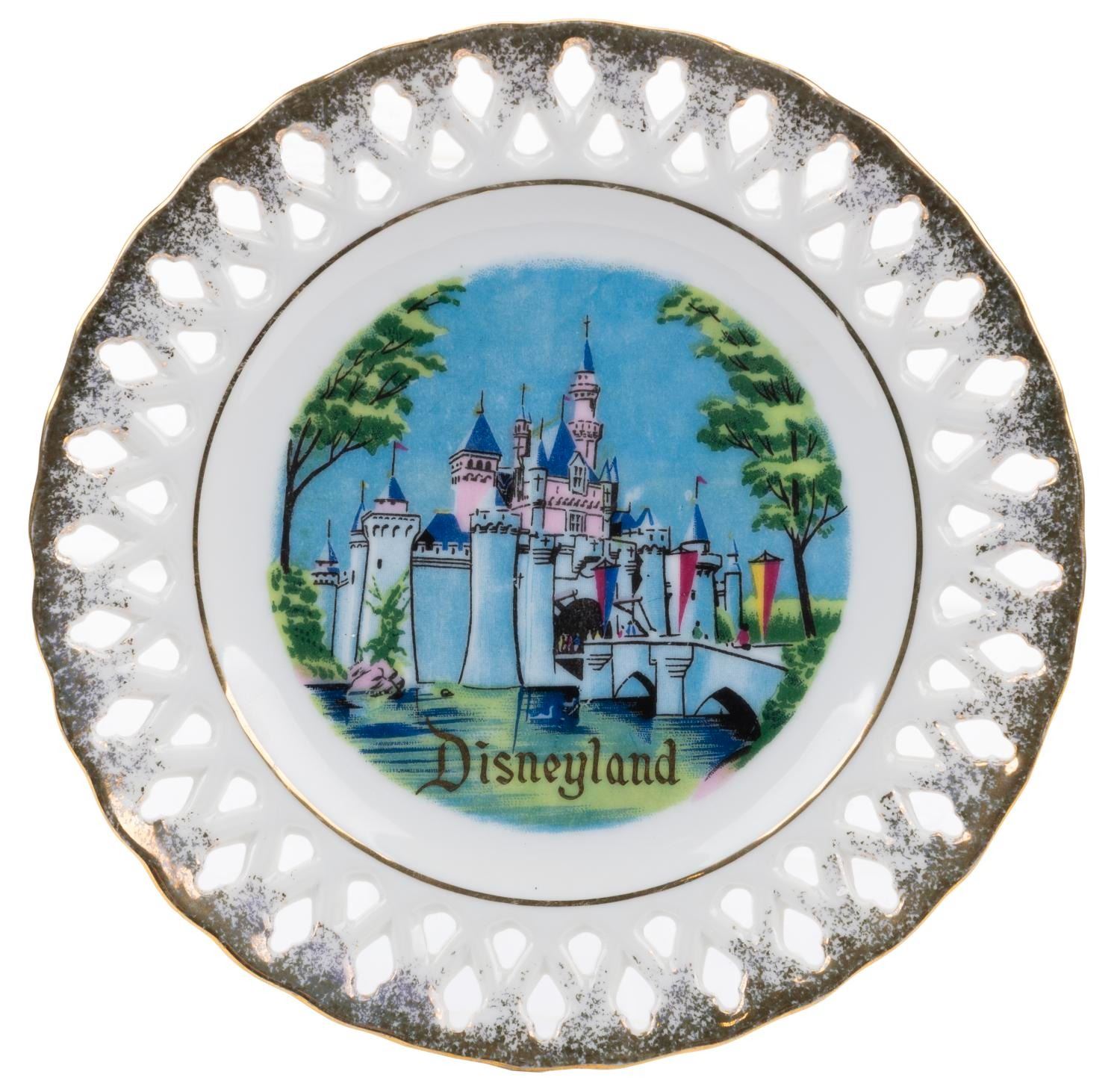 (Disneyland, 1960s-70s) A souvenir decorative lace plate featuring Sleeping Beauty Castle. Measuring 6.25" in diameter, the plate is in very good condition with light wear.