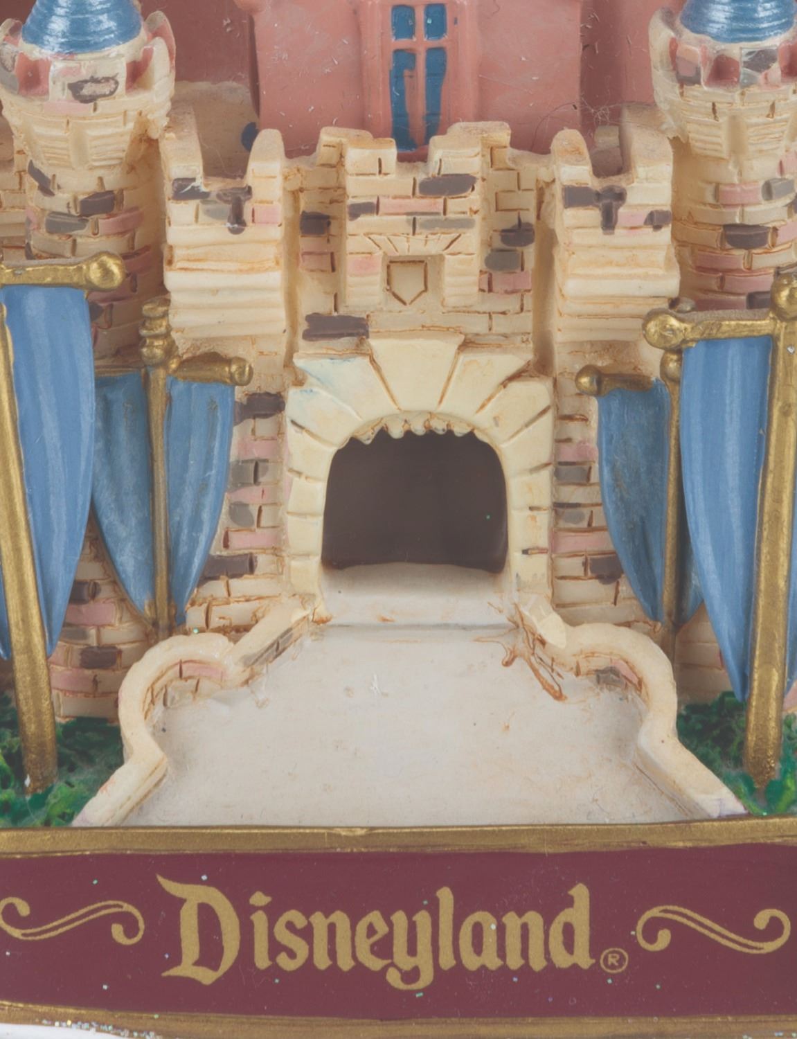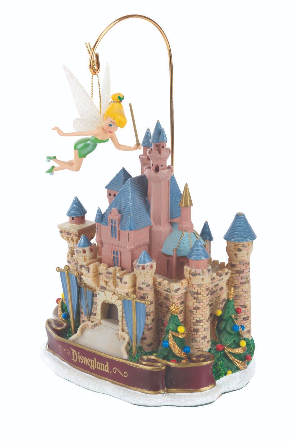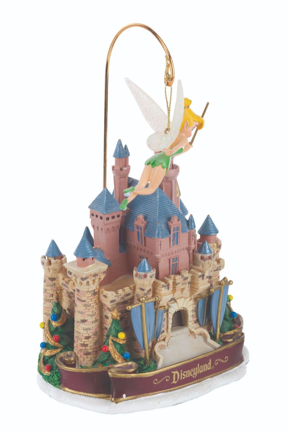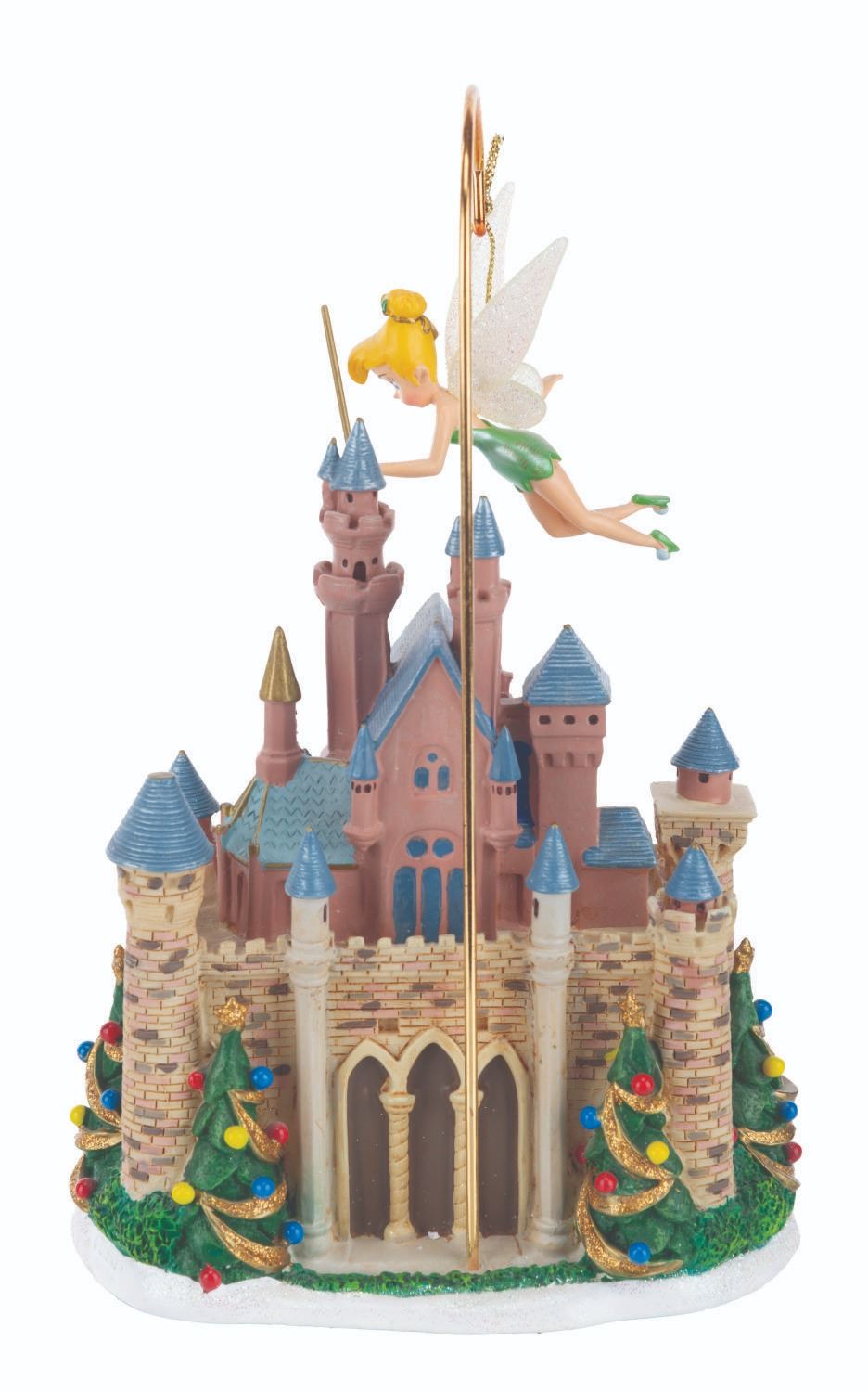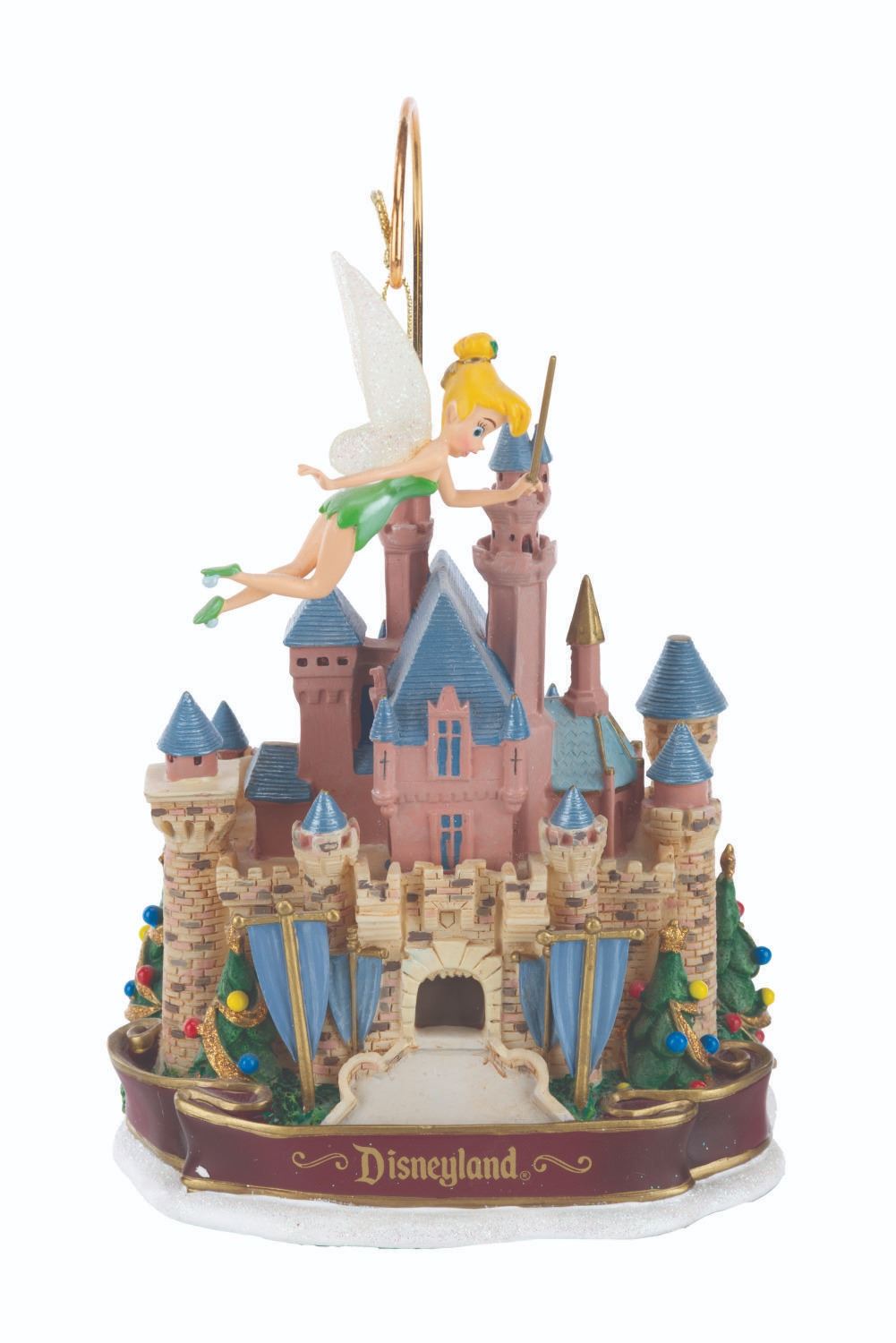 (Disneyland, 2000s) A Christmas ornament stand in the shape of Sleeping Beauty Castle with a figural Tinker Bell ornament. Measuring 5” x 3” x 8”, the stand and ornament are in fine condition and come with their original packaging.