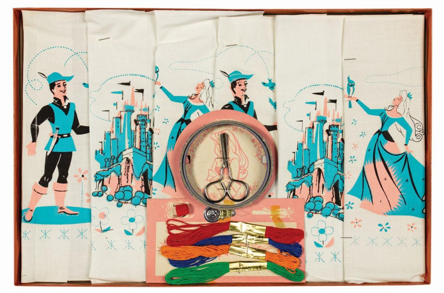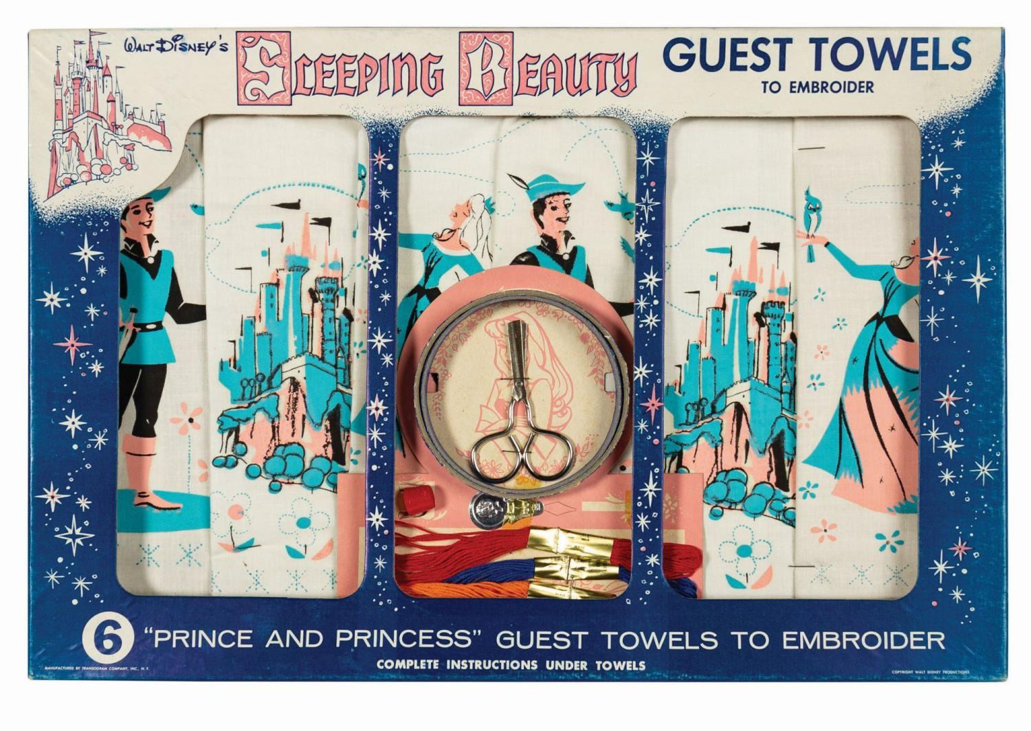(Trans-O-Gram, 1959) A Walt Disney's Sleeping Beauty Guest Towels boxed set. Included are towels, embroidery thread, scissors, a plastic thimble, a cardboard embroidery loop, a needle threader, and embroidery instructions. The complete craft kit is in fine unused condition within its original 18.25"x12.25"x1.5" box. The box is in good condition with light surface wear including bends & creases.