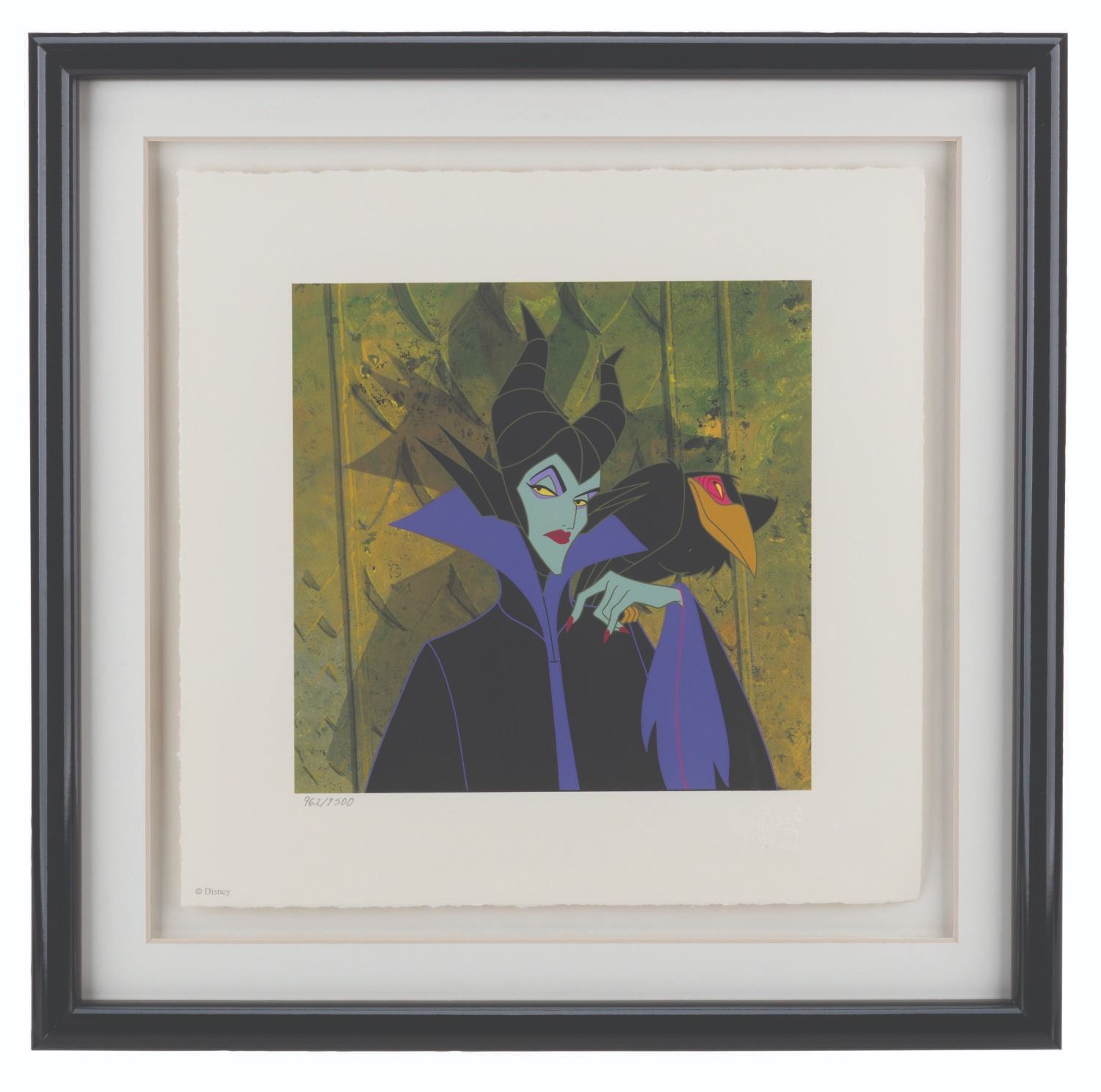 (Disney, 1997) A framed serigraph of Maleficent from "Sleeping Beauty, " released by Walt Disney Art Classics. Printed on acid-free paper, the piece was released in a limited edition and is hand-numbered 962/7500. The print has an image size of 7 " x 7 " on 10 " x 10 " paper. The entire framed and matted piece measures 14 " x 14 " and is in fine condition.
