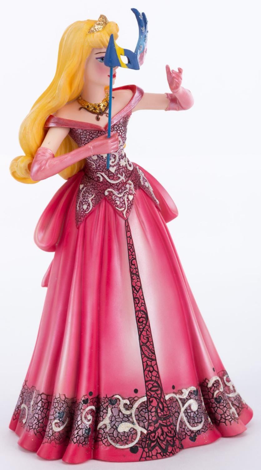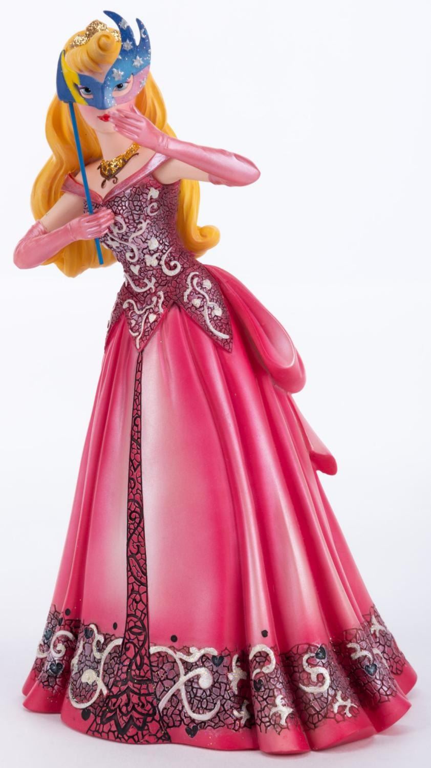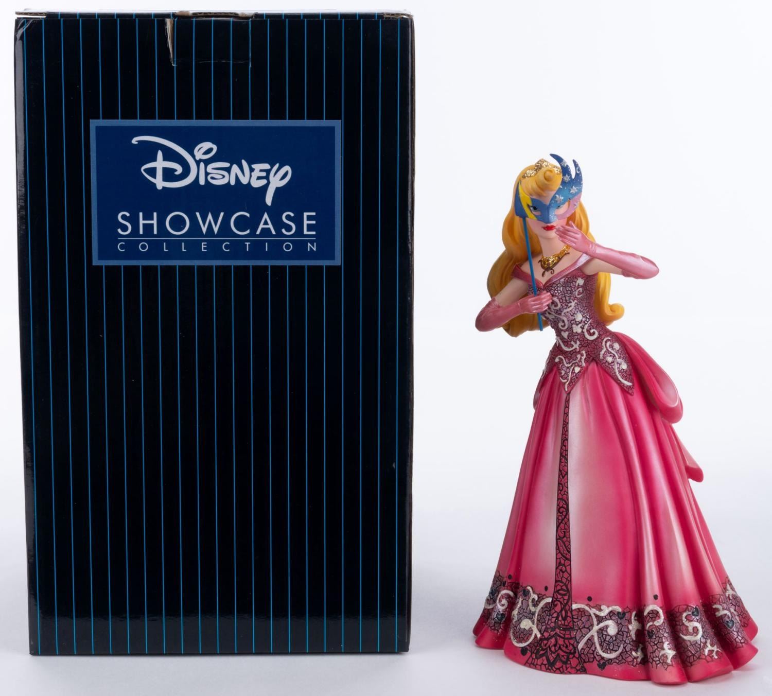 (Enesco, 2015) A Disney Showcase Collection ‘Couture de Force’ figurine of Aurora in a masquerade mask from Walt Disney's animated classic "Sleeping Beauty." Measuring 4.75" x 4.75" and 7.75" tall, the stone resin figurine is in fine condition and comes with the original 6" x 6" x 10" box.