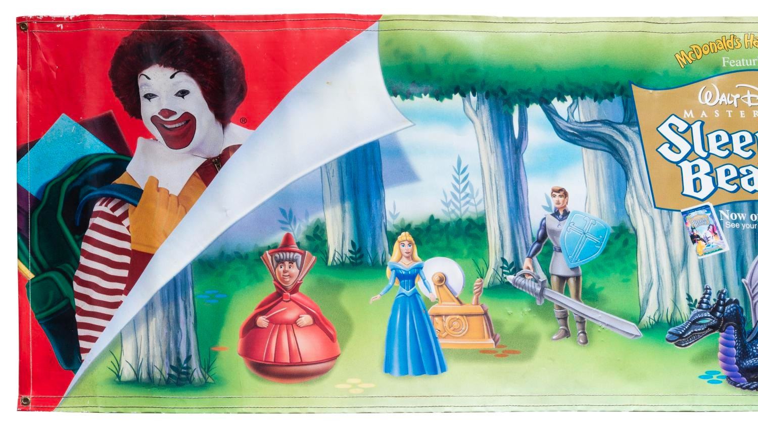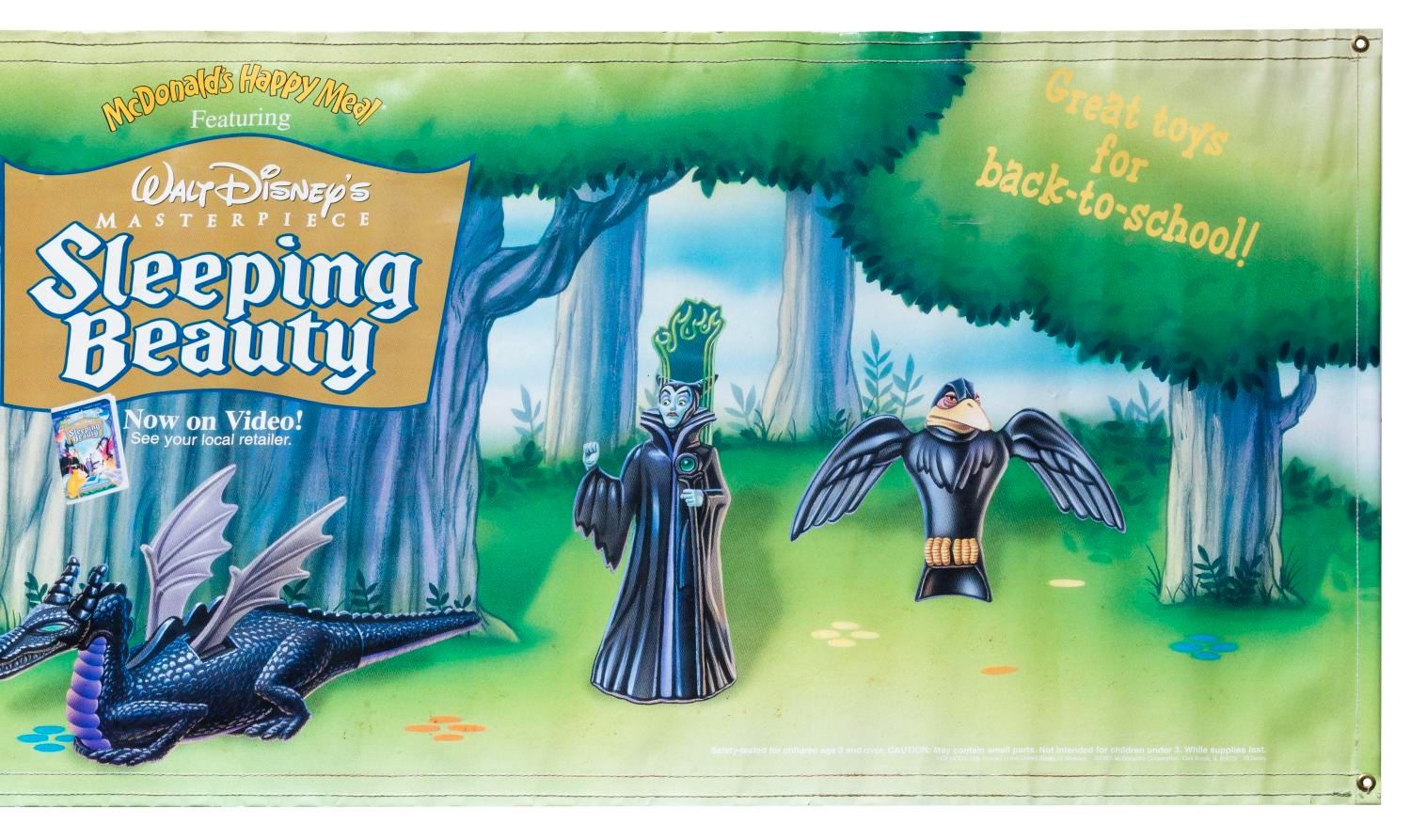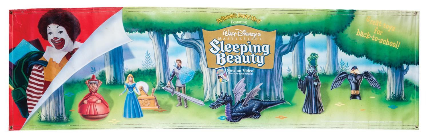 (McDonald’s, 1997) A large banner for a line of “Sleeping Beauty” Happy Meal toys. The McDonald’s promotion was for the 1997 digitally-restored VHS re-release of the Disney animated classic. Measuring 30” x 95”, the plastic banner is in good condition with wear from store display including stains, scuffs, material loss at the top left corner, edge wear, and tears up to 1.5” long.